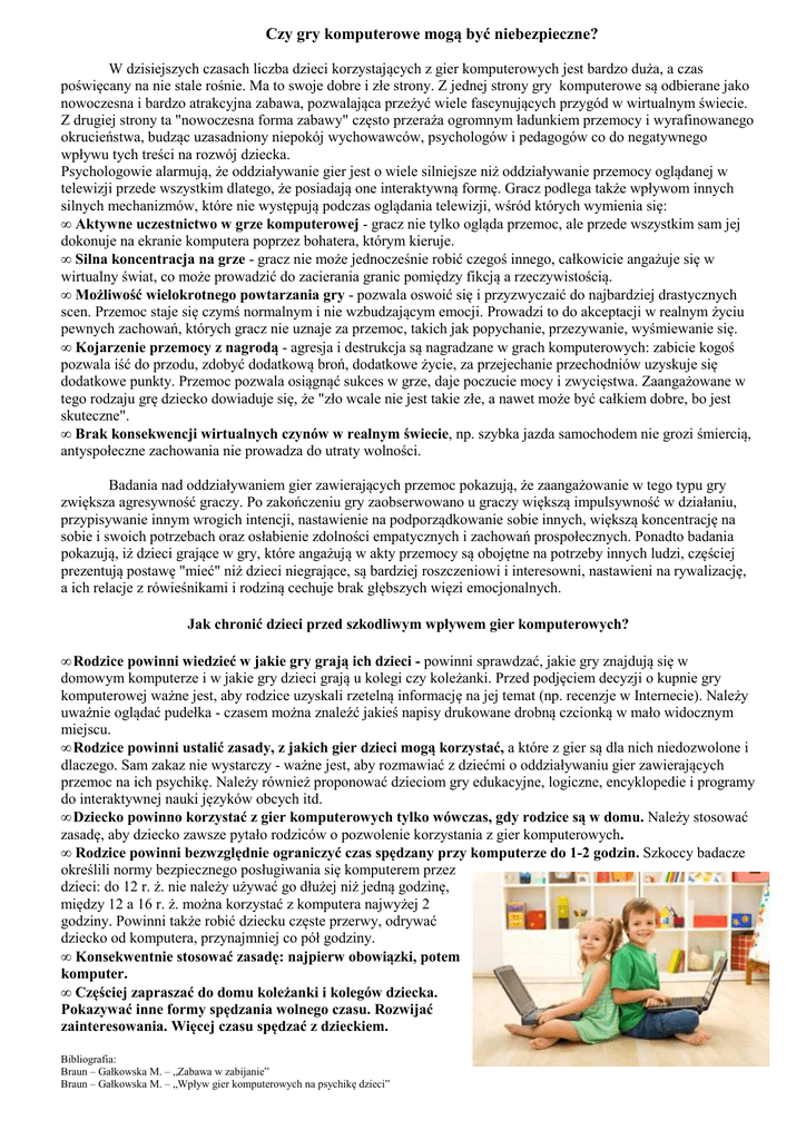 Czy gry komputerowe mogą być niebezpieczne? W dzisiejszych czasach liczba dzieci korzystających z gier komputerowych jest bardzo duża, a czas poświęcany na nie stale rośnie. Ma to swoje dobre i złe strony. Z jednej strony gry komputerowe są odbierane jako nowoczesna i bardzo atrakcyjna zabawa, pozwalająca przeżyć wiele fascynujących przygód w wirtualnym świecie. Z drugiej strony ta "nowoczesna forma zabawy" często przeraża ogromnym ładunkiem przemocy i wyrafinowanego okrucieństwa, budząc uzasadniony niepokój wychowawców, psychologów i pedagogów co do negatywnego wpływu tych treści na rozwój dziecka. Psychologowie alarmują, że oddziaływanie gier jest o wiele silniejsze niż oddziaływanie przemocy oglądanej w telewizji przede wszystkim dlatego, że posiadają one interaktywną formę. Gracz podlega także wpływom innych silnych mechanizmów, które nie występują podczas oglądania telewizji, wśród których wymienia się: • Aktywne uczestnictwo w grze komputerowej - gracz nie tylko ogląda przemoc, ale przede wszystkim sam jej dokonuje na ekranie komputera poprzez bohatera, którym kieruje. • Silna koncentracja na grze - gracz nie może jednocześnie robić czegoś innego, całkowicie angażuje się w wirtualny świat, co może prowadzić do zacierania granic pomiędzy fikcją a rzeczywistością. • Możliwość wielokrotnego powtarzania gry - pozwala oswoić się i przyzwyczaić do najbardziej drastycznych scen. Przemoc staje się czymś normalnym i nie wzbudzającym emocji. Prowadzi to do akceptacji w realnym życiu pewnych zachowań, których gracz nie uznaje za przemoc, takich jak popychanie, przezywanie, wyśmiewanie się. • Kojarzenie przemocy z nagrodą - agresja i destrukcja są nagradzane w grach komputerowych: zabicie kogoś pozwala iść do przodu, zdobyć dodatkową broń, dodatkowe życie, za przejechanie przechodniów uzyskuje się dodatkowe punkty. Przemoc pozwala osiągnąć sukces w grze, daje poczucie mocy i zwycięstwa. Zaangażowane w tego rodzaju grę dziecko dowiaduje się, że "zło wcale nie jest takie złe, a nawet może być całkiem dobre, bo jest skuteczne". • Brak konsekwencji wirtualnych czynów w realnym świecie, np. szybka jazda samochodem nie grozi śmiercią, antyspołeczne zachowania nie prowadza do utraty wolności. Badania nad oddziaływaniem gier zawierających przemoc pokazują, że zaangażowanie w tego typu gry zwiększa agresywność graczy. Po zakończeniu gry zaobserwowano u graczy większą impulsywność w działaniu, przypisywanie innym wrogich intencji, nastawienie na podporządkowanie sobie innych, większą koncentrację na sobie i swoich potrzebach oraz osłabienie zdolności empatycznych i zachowań prospołecznych. Ponadto badania pokazują, iż dzieci grające w gry, które angażują w akty przemocy są obojętne na potrzeby innych ludzi, częściej prezentują postawę "mieć" niż dzieci niegrające, są bardziej roszczeniowi i interesowni, nastawieni na rywalizację, a ich relacje z rówieśnikami i rodziną cechuje brak głębszych więzi emocjonalnych. Jak chronić dzieci przed szkodliwym wpływem gier komputerowych? • Rodzice powinni wiedzieć w jakie gry grają ich dzieci - powinni sprawdzać, jakie gry znajdują się w domowym komputerze i w jakie gry dzieci grają u kolegi czy koleżanki. Przed podjęciem decyzji o kupnie gry komputerowej ważne jest, aby rodzice uzyskali rzetelną informację na jej temat (np. recenzje w Internecie). Należy uważnie oglądać pudełka - czasem można znaleźć jakieś napisy drukowane drobną czcionką w mało widocznym miejscu. • Rodzice powinni ustalić zasady, z jakich gier dzieci mogą korzystać, a które z gier są dla nich niedozwolone i dlaczego. Sam zakaz nie wystarczy - ważne jest, aby rozmawiać z dziećmi o oddziaływaniu gier zawierających przemoc na ich psychikę. Należy również proponować dzieciom gry edukacyjne, logiczne, encyklopedie i programy do interaktywnej nauki języków obcych itd. • Dziecko powinno korzystać z gier komputerowych tylko wówczas, gdy rodzice są w domu. Należy stosować zasadę, aby dziecko zawsze pytało rodziców o pozwolenie korzystania z gier komputerowych. • Rodzice powinni bezwzględnie ograniczyć czas spędzany przy komputerze do 1-2 godzin. Szkoccy badacze określili normy bezpiecznego posługiwania się komputerem przez dzieci: do 12 r. ż. nie należy używać go dłużej niż jedną godzinę, między 12 a 16 r. ż. można korzystać z komputera najwyżej 2 godziny. Powinni także robić dziecku częste przerwy, odrywać dziecko od komputera, przynajmniej co pół godziny. • Konsekwentnie stosować zasadę: najpierw obowiązki, potem komputer. • Częściej zapraszać do domu koleżanki i kolegów dziecka. Pokazywać inne formy spędzania wolnego czasu. Rozwijać zainteresowania. Więcej czasu spędzać z dzieckiem. Bibliografia: Braun – Gałkowska M. – „Zabawa w zabijanie” Braun – Gałkowska M. – „Wpływ gier komputerowych na psychikę dzieci”