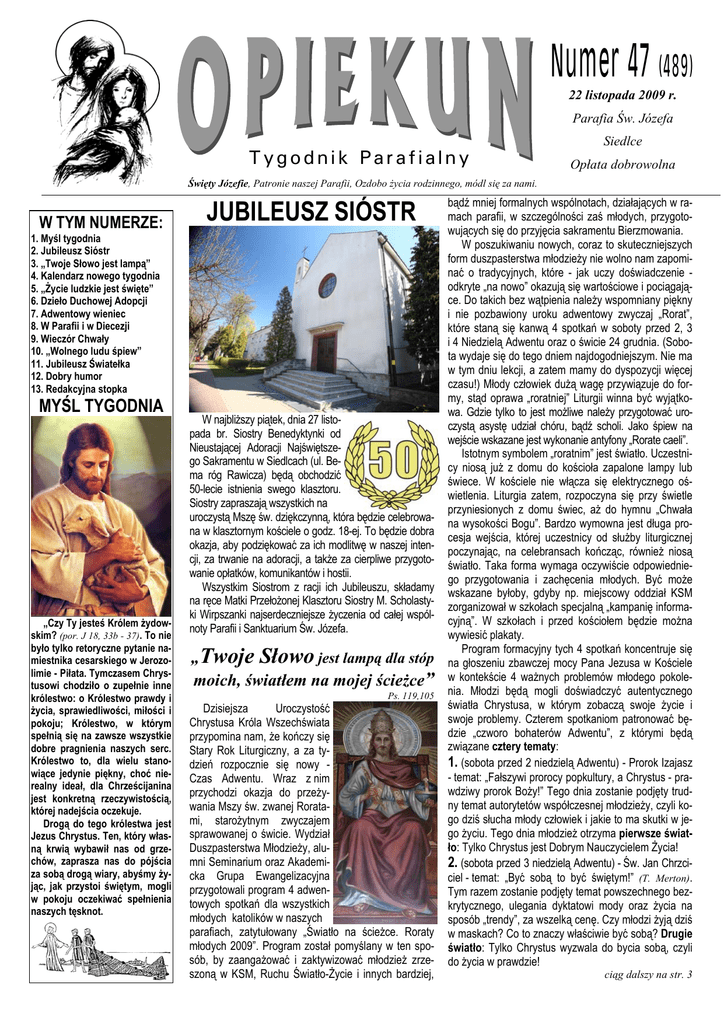 Numer 47 (489) 22 listopada 2009 r. Parafia Św. Józefa Tygodnik Parafialny Siedlce Opłata dobrowolna Święty Józefie, Patronie naszej Parafii, Ozdobo życia rodzinnego, módl się za nami. W TYM NUMERZE: JUBILEUSZ SIÓSTR 1. Myśl tygodnia 2. Jubileusz Sióstr 3. „Twoje Słowo jest lampą” 4. Kalendarz nowego tygodnia 5. „Życie ludzkie jest święte” 6. Dzieło Duchowej Adopcji 7. Adwentowy wieniec 8. W Parafii i w Diecezji 9. Wieczór Chwały 10. „Wolnego ludu śpiew” 11. Jubileusz Światełka 12. Dobry humor 13. Redakcyjna stopka MYŚL TYGODNIA „Czy Ty jesteś Królem żydowskim? (por. J 18, 33b - 37). To nie było tylko retoryczne pytanie namiestnika cesarskiego w Jerozolimie - Piłata. Tymczasem Chrystusowi chodziło o zupełnie inne królestwo: o Królestwo prawdy i życia, sprawiedliwości, miłości i pokoju; Królestwo, w którym spełnią się na zawsze wszystkie dobre pragnienia naszych serc. Królestwo to, dla wielu stanowiące jedynie piękny, choć nierealny ideał, dla Chrześcijanina jest konkretną rzeczywistością, której nadejścia oczekuje. Drogą do tego królestwa jest Jezus Chrystus. Ten, który własną krwią wybawił nas od grzechów, zaprasza nas do pójścia za sobą drogą wiary, abyśmy żyjąc, jak przystoi świętym, mogli w pokoju oczekiwać spełnienia naszych tęsknot. W najbliższy piątek, dnia 27 listopada br. Siostry Benedyktynki od Nieustającej Adoracji Najświętszego Sakramentu w Siedlcach (ul. Bema róg Rawicza) będą obchodzić 50-lecie istnienia swego klasztoru. Siostry zapraszają wszystkich na uroczystą Mszę św. dziękczynną, która będzie celebrowana w klasztornym kościele o godz. 18-ej. To będzie dobra okazja, aby podziękować za ich modlitwę w naszej intencji, za trwanie na adoracji, a także za cierpliwe przygotowanie opłatków, komunikantów i hostii. Wszystkim Siostrom z racji ich Jubileuszu, składamy na ręce Matki Przełożonej Klasztoru Siostry M. Scholastyki Wirpszanki najserdeczniejsze życzenia od całej wspólnoty Parafii i Sanktuarium Św. Józefa. „Twoje Słowo jest lampą dla stóp moich, światłem na mojej ścieżce” Ps. 119,105 Dzisiejsza Uroczystość Chrystusa Króla Wszechświata przypomina nam, że kończy się Stary Rok Liturgiczny, a za tydzień rozpocznie się nowy Czas Adwentu. Wraz z nim przychodzi okazja do przeżywania Mszy św. zwanej Roratami, starożytnym zwyczajem sprawowanej o świcie. Wydział Duszpasterstwa Młodzieży, alumni Seminarium oraz Akademicka Grupa Ewangelizacyjna przygotowali program 4 adwentowych spotkań dla wszystkich młodych katolików w naszych parafiach, zatytułowany „Światło na ścieżce. Roraty młodych 2009”. Program został pomyślany w ten sposób, by zaangażować i zaktywizować młodzież zrzeszoną w KSM, Ruchu Światło-Życie i innych bardziej, bądź mniej formalnych wspólnotach, działających w ramach parafii, w szczególności zaś młodych, przygotowujących się do przyjęcia sakramentu Bierzmowania. W poszukiwaniu nowych, coraz to skuteczniejszych form duszpasterstwa młodzieży nie wolno nam zapominać o tradycyjnych, które - jak uczy doświadczenie odkryte „na nowo” okazują się wartościowe i pociągające. Do takich bez wątpienia należy wspomniany piękny i nie pozbawiony uroku adwentowy zwyczaj „Rorat”, które staną się kanwą 4 spotkań w soboty przed 2, 3 i 4 Niedzielą Adwentu oraz o świcie 24 grudnia. (Sobota wydaje się do tego dniem najdogodniejszym. Nie ma w tym dniu lekcji, a zatem mamy do dyspozycji więcej czasu!) Młody człowiek dużą wagę przywiązuje do formy, stąd oprawa „roratniej” Liturgii winna być wyjątkowa. Gdzie tylko to jest możliwe należy przygotować uroczystą asystę udział chóru, bądź scholi. Jako śpiew na wejście wskazane jest wykonanie antyfony „Rorate caeli”. Istotnym symbolem „roratnim” jest światło. Uczestnicy niosą już z domu do kościoła zapalone lampy lub świece. W kościele nie włącza się elektrycznego oświetlenia. Liturgia zatem, rozpoczyna się przy świetle przyniesionych z domu świec, aż do hymnu „Chwała na wysokości Bogu”. Bardzo wymowna jest długa procesja wejścia, której uczestnicy od służby liturgicznej poczynając, na celebransach kończąc, również niosą światło. Taka forma wymaga oczywiście odpowiedniego przygotowania i zachęcenia młodych. Być może wskazane byłoby, gdyby np. miejscowy oddział KSM zorganizował w szkołach specjalną „kampanię informacyjną”. W szkołach i przed kościołem będzie można wywiesić plakaty. Program formacyjny tych 4 spotkań koncentruje się na głoszeniu zbawczej mocy Pana Jezusa w Kościele w kontekście 4 ważnych problemów młodego pokolenia. Młodzi będą mogli doświadczyć autentycznego światła Chrystusa, w którym zobaczą swoje życie i swoje problemy. Czterem spotkaniom patronować będzie „czworo bohaterów Adwentu”, z którymi będą związane cztery tematy: 1. (sobota przed 2 niedzielą Adwentu) - Prorok Izajasz - temat: „Fałszywi prorocy popkultury, a Chrystus - prawdziwy prorok Boży!” Tego dnia zostanie podjęty trudny temat autorytetów współczesnej młodzieży, czyli kogo dziś słucha młody człowiek i jakie to ma skutki w jego życiu. Tego dnia młodzież otrzyma pierwsze światło: Tylko Chrystus jest Dobrym Nauczycielem Życia! 2. (sobota przed 3 niedzielą Adwentu) - Św. Jan Chrzciciel - temat: „Być sobą to być świętym!” (T. Merton). Tym razem zostanie podjęty temat powszechnego bezkrytycznego, ulegania dyktatowi mody oraz życia na sposób „trendy”, za wszelką cenę. Czy młodzi żyją dziś w maskach? Co to znaczy właściwie być sobą? Drugie światło: Tylko Chrystus wyzwala do bycia sobą, czyli do życia w prawdzie! ciąg dalszy na str. 3 STRONA 2 22 LISTOPADA 2009 R. OPIEKUN Nr 47 KALENDARZ PARAFIALNY W przypadku zauważenia błędów, które mogły powstać podczas przepisywania intencji Mszy św., 