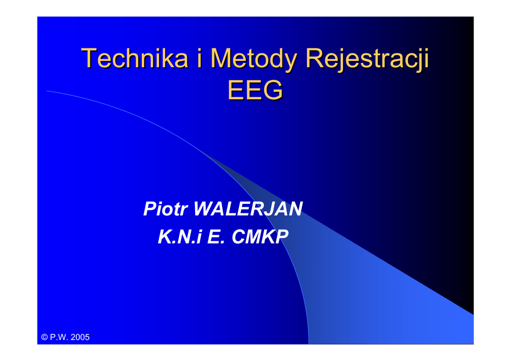 Technika i Metody Rejestracji EEG Piotr WALERJAN K.N.i E. CMKP © P.W. 2005 Parametry sygnału EEG z Mała amplituda sygnału – rzędu dziesiątek µV z Oporność elektrod – kilka kΩ z Konieczność © P.W. 2005 wzmocnienia sygnału! Wzmacniacz różnicowy z teoretycznie nieskończone wzmocnienie z teoretycznie nieskończona oporność z teoretycznie brak wzmocnienia sygnału wspólnego Sygnał wyjściowy = (V+-V-)*k © P.W. 2005 © P.W. 2005 Odprowadzenie monopolarne - jednobiegunowe Brak miejsca o potencjale ZERO! © P.W. 2005 Odprowadzenie bipolarne dwubiegunowe © P.W. 2005 Montaże 1 © P.W. 2005 Montaże 2 © P.W. 2005 Montaże 3 © P.W. 2005 Montaże 4 © P.W. 2005 Opozycja faz 1 © P.W. 2005 Źródło wyładowań ognisko Opozycja faz 2 Opozycja faz w zapisie © P.W. 2005 Opozycja faz 3 Opozycja faz w zapisie © P.W. 2005 Opozycja faz 4 © P.W. 2005 Opozycja faz Filtry – widmo mocy sygnału © P.W. 2005 Filtry 1 © P.W. 2005 Filtry 2 © P.W. 2005 Filtry 3 © P.W. 2005 Filtry 4 © P.W. 2005 Artefakty 1 © P.W. 2005 Artefakty 2 © P.W. 2005 Artefakty 3 © P.W. 2005 Elektrody z z z Miseczkowe Grzybkowe Czepki z elektrodami z z © P.W. 2005 Srebrne, chlorkowane Złote