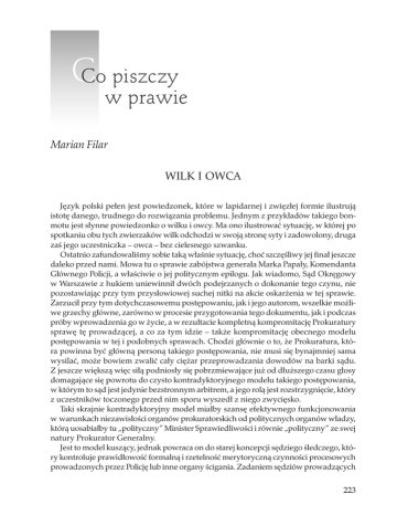 CCo piszczy w prawie Marian Filar Wilk i Owca Język polski pełen jest powiedzonek, które w lapidarnej i zwięzłej formie ilustrują istotę danego, trudnego do rozwiązania problemu. Jednym z przykładów takiego bonmotu jest słynne powiedzonko o wilku i owcy. Ma ono ilustrować sytuację, w której po spotkaniu obu tych zwierzaków wilk odchodzi w swoją stronę syty i zadowolony, druga zaś jego uczestniczka – owca – bez cielesnego szwanku. Ostatnio zafundowaliśmy sobie taką właśnie sytuację, choć szczęśliwy jej finał jeszcze daleko przed nami. Mowa tu o sprawie zabójstwa generała Marka Papały, Komendanta Głównego Policji, a właściwie o jej politycznym epilogu. Jak wiadomo, Sąd Okręgowy w Warszawie z hukiem uniewinnił dwóch podejrzanych o dokonanie tego czynu, nie pozostawiając przy tym przysłowiowej suchej nitki na akcie oskarżenia w tej sprawie. Zarzucił przy tym dotychczasowemu postępowaniu, jak i jego autorom, wszelkie możliwe grzechy główne, zarówno w procesie przygotowania tego dokumentu, jak i podczas próby wprowadzenia go w życie, a w rezultacie kompletną kompromitację Prokuratury sprawę tę prowadzącej, a co za tym idzie – także kompromitację obecnego modelu postępowania w tej i podobnych sprawach. Chodzi głównie o to, że Prokuratura, która powinna być główną personą takiego postępowania, nie musi się bynajmniej sama wysilać, może bowiem zwalić cały ciężar przeprowadzania dowodów na barki sądu. Z jeszcze większą więc siłą podniosły się pobrzmiewające już od dłuższego czasu głosy domagające się powrotu do czysto kontradyktoryjnego modelu takiego postępowania, w którym to sąd jest jedynie bezstronnym arbitrem, a jego rolą jest rozstrzygnięcie, który z uczestników toczonego przed nim sporu wyszedł z niego zwycięsko. Taki skrajnie kontradyktoryjny model miałby szansę efektywnego funkcjonowania w warunkach niezawisłości organów prokuratorskich od politycznych organów władzy, którą uosabiałby tu „polityczny” Minister Sprawiedliwości i równie „polityczny” ze swej natury Prokurator Generalny. Jest to model kuszący, jednak powraca on do starej koncepcji sędziego śledczego, który kontroluje prawidłowość formalną i rzetelność merytoryczną czynności procesowych prowadzonych przez Policję lub inne organy ścigania. Zadaniem sędziów prowadzących 223 Marian Filar PALESTRA taką kontrolę byłoby nadzorowanie zbierania dowodów pod względem legalności oraz podejmowania decyzji końcowej co do wniesienia aktu oskarżenia lub o umorzeniu postępowania. Na tym etapie kończyłoby się postępowanie przygotowawczo-dowodowe, a nie – jak w obecnym modelu – całe postępowanie dowodowe jest powtarzane przed sądem. W takim modelu możliwość bezpośredniej ingerencji politycznej ze szczebla Ministra Sprawiedliwości lub Prokuratora Generalnego byłaby – jeśli już nie wykluczona – to przynajmniej istotnie ograniczona. Wtedy zrealizowalibyśmy klasyczny model Monteskiuszowskiego podziału władzy na ustawodawczą, wykonawczą i sądowniczą. Po konfrontacji w takich warunkach – jeśli nawet wilk byłby czasem nie do końca syty, a owca nieskonsumowana z kretesem przez takowe wilczysko (nawet gdyby tu i ówdzie nieco sfatygowana) – można by powiedzieć, że odnieśliśmy sukces i że system działa! 224
