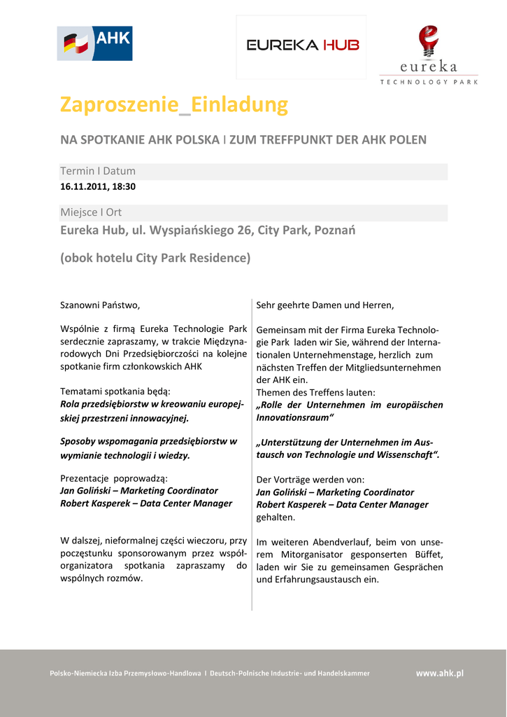 Zaproszenie_Einladung NA SPOTKANIE AHK POLSKA I ZUM TREFFPUNKT DER AHK POLEN Termin I Datum 16.11.2011, 18:30 Miejsce I Ort Eureka Hub, ul. Wyspiańskiego 26, City Park, Poznań (obok hotelu City Park Residence) Szanowni Paostwo, Sehr geehrte Damen und Herren, Wspólnie z firmą Eureka Technologie Park serdecznie zapraszamy, w trakcie Międzynarodowych Dni Przedsiębiorczości na kolejne spotkanie firm członkowskich AHK Tematami spotkania będą: Rola przedsiębiorstw w kreowaniu europejskiej przestrzeni innowacyjnej. Gemeinsam mit der Firma Eureka Technologie Park laden wir Sie, während der Internationalen Unternehmenstage, herzlich zum nächsten Treffen der Mitgliedsunternehmen der AHK ein. Themen des Treffens lauten: „Rolle der Unternehmen im europäischen Innovationsraum“ Sposoby wspomagania przedsiębiorstw w wymianie technologii i wiedzy. „Unterstützung der Unternehmen im Austausch von Technologie und Wissenschaft“. Prezentacje poprowadzą: Jan Golioski – Marketing Coordinator Robert Kasperek – Data Center Manager Der Vorträge werden von: Jan Golioski – Marketing Coordinator Robert Kasperek – Data Center Manager gehalten. W dalszej, nieformalnej części wieczoru, przy poczęstunku sponsorowanym przez współorganizatora spotkania zapraszamy do wspólnych rozmów. Im weiteren Abendverlauf, beim von unserem Mitorganisator gesponserten Büffet, laden wir Sie zu gemeinsamen Gesprächen und Erfahrungsaustausch ein. Każdy z gości będzie proszony o noszenie identyfikatora. Z pewnością ułatwi to Paostwu wzajemne poznanie. Częśd oficjalna spotkania będzie tłumaczona. Jeder Gast wird gebeten, ein Namensschild zu tragen. Das gegenseitige Kennenlernen wird dadurch sehr erleichtert. Der offizielle Teil des Treffens wird gedolmetscht. Zgłoszenia prosimy przesład na załączonym Bitte bestätigen Sie Ihre Teilnahme bis zum formularzu do dnia 14.11.2011 r. na adres 14.11.2011 durch die Zusendung des [email protected] genden Formulars an [email protected]. Tłumaczenia I Übersetzung Kontakt Polsko-Niemiecka Izba Przemysłowo-Handlowa Deutsch-Polnische Industrie- und Handelskammer Maria Montowska Dyrektor Serwisu Członkowskiego Mitglied der Geschäftsführung Mitgliederservice e-mail: [email protected] Tel.: +48 22 53 10 513 Fax: +48 22 53 10 600 Przedstawicielstwo Polsko-Niemieckiej Izby Przemysłowo-Handlowej Vertretung der Deutsch-Polnischen Industrie- und Handelskammer in Poznao Edyta Ziarkowski ul. Bałtycka 6, 61-013 Poznao e-mail: [email protected] Tel.: +48 61 874 38 22 Fax: +48 61 887 90 59 Potwierdzenie udziału_Anmeldung 16.11.2011 I 18:30 Eureka Hub ul. Wyspiańskiego 26, City Park, Poznań (obok Hotelu City Park Residence) Potwierdzenie udziału prosimy przesład do dnia 14.11.2011 mailem na adres: Bitte senden Sie Ihre Anmeldung bis zum 14.11.2011 per E-Mail an: [email protected] Imię i Nazwisko / Vor- und Nachname …………………………………………………………………………………………………………………………………………………..…..……… Stanowisko / Position ..………………………………………………………………………………………………………………………………………….………………… Firma / Instytucja / Institution ...…………………………………………………………………….……………………………………………………………………………………… Ulica i numer / Straße, Nummer …………………………………………………………………………………………………………………………………………………………….… Kod i miejscowośd / PLZ, Ort ……………………………………………………………………………………………..……………………………………………………….………. Tel. ………………………………………………….….…….… Mail ………….………………….…….……………………………………..…… Data i podpis / Datum und Unterschrift ………………………………………………..…………………..…………………………