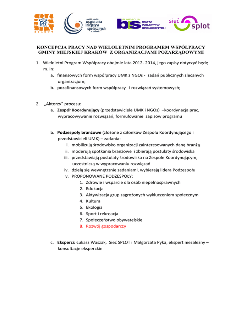 KONCEPCJA PRACY NAD WIELOLETNIM PROGRAMEM WSPÓŁPRACY GMINY MIEJSKIEJ KRAKÓW Z ORGANIZACJAMI POZARZĄDOWYMI 1. Wieloletni Program Współpracy obejmie lata 2012- 2014, jego zapisy dotyczyć będę m. in: a. finansowych form współpracy UMK z NGOs - zadań publicznych zlecanych organizacjom; b. pozafinansowych form współpracy i rozwiązań systemowych; 2. „Aktorzy” procesu: a. Zespół Koordynujący (przedstawiciele UMK i NGOs) –koordynacja prac, wypracowywanie rozwiązań, formułowanie zapisów programu b. Podzespoły branżowe (złożone z członków Zespołu Koordynującego i przedstawicieli UMK) – zadania: i. mobilizują środowisko organizacji zainteresowanych daną branżą ii. moderują spotkania branżowe i zbierają postulaty środowiska iii. przedstawiają postulaty środowiska na Zespole Koordynującym, uczestniczą w wypracowaniu rozwiązań iv. dzielą się wewnętrznie zadaniami, wybierają lidera Podzespołu v. PROPONOWANE PODZESPOŁY: 1. Zdrowie i wsparcie dla osób niepełnosprawnych 2. Edukacja 3. Aktywizacja grup zagrożonych wykluczeniem społecznym 4. Kultura 5. Ekologia 6. Sport i rekreacja 7. Społeczeństwo obywatelskie 8. Rozwój gospodarczy c. Eksperci: Łukasz Waszak, Sieć SPLOT i Małgorzata Pyka, ekspert niezależny – konsultacje eksperckie TRYB I HARMONOGRAM PRACY 13 czerwca- 30 września 2011r. CZAS ZADANIE UCZESTNICY 13. 06 2011 PIERWSZE SPOTKANIE ZESPOŁU NGOS, UMK, EKSPERCI KOORDYNUJĄCEGO – określenie trybu pracy, zdefiniowanie podzespołów branżowych 15 06- 31 PIERWSZA TURA SPOTKAŃ BRANŻOWYCHPodzespoły branżowe 07 2011 diagnoza potrzeb i problemów współpracy, we współpracy z zbieranie propozycji zadań publicznych przedstawicielami MOWIS Zaproszenia na spotkania branżowe będą adresowane do: organizacji pozarządowych urzędników z wydziałów branżowych radnych 10 07- 31 ZESPÓŁ KOORDYNACYJNY podsumowuje zgłaszane Zespół Koordynacyjny w 08 uwagi, wypracowuje rozwiązania, tworzy konsultacji z ekspertami założenia programu, i urzędnikami UMK 01- 10 09 DRUGA TURA SPOTKAŃ BRANŻOWYCH – Organizacja - podzespoły konsultacje wypracowanych rozwiązań i założeń branżowe we do programu współpracy z przedstawicielami MOWIS, uczestnicy: NGOs, urzędnicy, radni 10 – 20 09 ZESPÓŁ KOORDYNACYJNY podsumowuje uwagi, przygotowuje projekt dokumentu 20 – 30 09 SPOTKANIE PLENARNE LUB SPOTKANIA BRANŻOWA – ostateczna konsultacja projektu programu współpracy 15 06 – 30 POLITYKA INFORMACYJNA: 09 2011 zakładka poświęcona pracom nad Programem Wieloletnim na stronie Zespół Koordynacyjny w konsultacji z ekspertami i urzędnikami UMK Organizacja - podzespoły branżowe we współpracy z przedstawicielami MOWIS, uczestnicy: NGOs, urzędnicy, radni Zespół Koordynacyjny MOWIS, Fundacja BIS, www.ngo.krakow.pl upowszechnianie uwag zgłaszanych podczas spotkań branżowych, materiałów wypracowywanych na poszczególnych etapach pracy w zakładce bieżące informowanie środowiska pozarządowego o realizowanych działaniach za pośrednictwem stron ww i mejlingu KONSULTACJE INTERNETOWE: <równolegle do prac zespołu i spotkań branżowych> o możliwość zgłaszania propozycji nowych zadań publicznych i rozwiązań (za pośrednictwem formularza) o możliwość zgłaszania uwag do założeń programu współpracy (za pośrednictwem formularza) o możliwość zgłaszania uwag do projektu programu współpracy (za pośrednictwem formularza) o zestawienie uwag wraz z uzasadnieniem Wsparcie organizacji prac Zespołu Koordynacyjnego i Podzespołów branŜowych - MOWIS