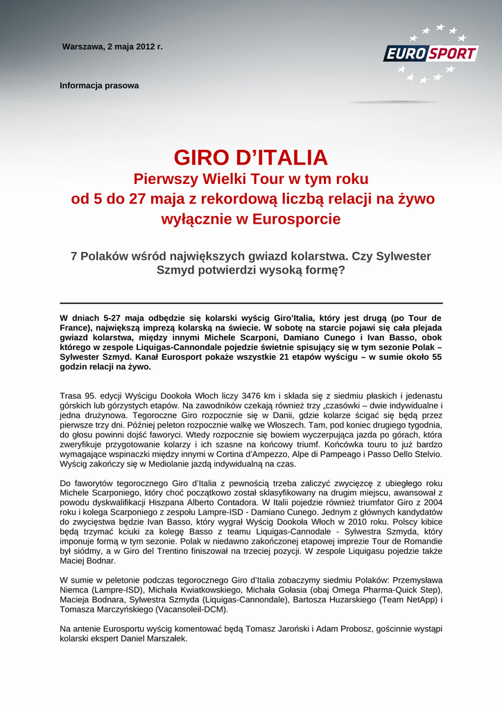 Warszawa, 2 maja 2012 r. Informacja prasowa GIRO D’ITALIA Pierwszy Wielki Tour w tym roku od 5 do 27 maja z rekordową liczbą relacji na żywo wyłącznie w Eurosporcie 7 Polaków wśród największych gwiazd kolarstwa. Czy Sylwester Szmyd potwierdzi wysoką formę? W dniach 5-27 maja odbędzie się kolarski wyścig Giro’Italia, który jest drugą (po Tour de France), największą imprezą kolarską na świecie. W sobotę na starcie pojawi się cała plejada gwiazd kolarstwa, między innymi Michele Scarponi, Damiano Cunego i Ivan Basso, obok którego w zespole Liquigas-Cannondale pojedzie świetnie spisujący się w tym sezonie Polak – Sylwester Szmyd. Kanał Eurosport pokaże wszystkie 21 etapów wyścigu – w sumie około 55 godzin relacji na żywo. Trasa 95. edycji Wyścigu Dookoła Włoch liczy 3476 km i składa się z siedmiu płaskich i jedenastu górskich lub górzystych etapów. Na zawodników czekają również trzy „czasówki – dwie indywidualne i jedna drużynowa. Tegoroczne Giro rozpocznie się w Danii, gdzie kolarze ścigać się będą przez pierwsze trzy dni. Później peleton rozpocznie walkę we Włoszech. Tam, pod koniec drugiego tygodnia, do głosu powinni dojść faworyci. Wtedy rozpocznie się bowiem wyczerpująca jazda po górach, która zweryfikuje przygotowanie kolarzy i ich szasne na końcowy triumf. Końcówka touru to już bardzo wymagające wspinaczki między innymi w Cortina d’Ampezzo, Alpe di Pampeago i Passo Dello Stelvio. Wyścig zakończy się w Mediolanie jazdą indywidualną na czas. Do faworytów tegorocznego Giro d’Italia z pewnością trzeba zaliczyć zwycięzcę z ubiegłego roku Michele Scarponiego, który choć początkowo został sklasyfikowany na drugim miejscu, awansował z powodu dyskwalifikacji Hiszpana Alberto Contadora. W Italii pojedzie również triumfator Giro z 2004 roku i kolega Scarponiego z zespołu Lampre-ISD - Damiano Cunego. Jednym z głównych kandydatów do zwycięstwa będzie Ivan Basso, który wygrał Wyścig Dookoła Włoch w 2010 roku. Polscy kibice będą trzymać kciuki za kolegę Basso z teamu Liquigas-Cannodale - Sylwestra Szmyda, który imponuje formą w tym sezonie. Polak w niedawno zakończonej etapowej imprezie Tour de Romandie był siódmy, a w Giro del Trentino finiszował na trzeciej pozycji. W zespole Liquigasu pojedzie także Maciej Bodnar. W sumie w peletonie podczas tegorocznego Giro d’Italia zobaczymy siedmiu Polaków: Przemysława Niemca (Lampre-ISD), Michała Kwiatkowskiego, Michała Gołasia (obaj Omega Pharma-Quick Step), Macieja Bodnara, Sylwestra Szmyda (Liquigas-Cannondale), Bartosza Huzarskiego (Team NetApp) i Tomasza Marczyńskiego (Vacansoleil-DCM). Na antenie Eurosportu wyścig komentować będą Tomasz Jaroński i Adam Probosz, gościnnie wystąpi kolarski ekspert Daniel Marszałek. Tomasz Jaroński: - Chyba nigdy Giro d’Italia nie zasługiwało na taką uwagę polskich kibiców kolarstwa. Wystartuje bowiem aż siedmiu Polaków i mam nadzieję, że większość z nich będzie miała wolną rękę. Mam tutaj na myśli ucieczki Gołasia, Kwiatkowskiego, Huzarskiego czy jadącego w biało-czerwonej koszulce mistrza Polski, Marczyńskiego. Sam jestem ciekaw postawy i zadań Sylwestra Szmyda. Formę i psychikę ma znakomitą, czego nie można powiedzieć o jego liderze, Ivanie Basso. Czy Sylwester dostanie możliwość jazdy na swoje konto? O tym przekonamy się już w trakcie trwania wyścigu. Giro zapowiada się jako rywalizacja włoskich gwiazd (Cunego i Scarponi, co ciekawe w jednym teamie!), ale nie jest powiedziane, że do walki o różową koszulkę nie włącza się zawodnicy z innych krajów. Trasa ciekawa, jak to we Włoszech. Nic tylko ścigać się i oglądać relacje w Eurosporcie! Plan relacji na żywo w Eurosporcie: 5 maja 2012 15:30-19:30 KOLARSTWO: Giro d'Italia Etap 1 6 maja 2012 15:15-17:30 KOLARSTWO: Giro d'Italia Etap 2 7 maja 2012 14:45-16:15 KOLARSTWO: Giro d'Italia Etap 3 9 maja 2012 15:30-17:30 KOLARSTWO: Giro d'Italia Etap 4 10 maja 2012 14:45-17:30 KOLARSTWO: Giro d'Italia Etap 5 11 maja 2012 14:45-17:30 KOLARSTWO: Giro d'Italia Etap 6 12 maja 2012 14:45-17:30 KOLARSTWO: Giro d'Italia Etap 7 13 maja 2012 15:15-17:30 KOLARSTWO: Giro d'Italia Etap 8 14 maja 2012 14:45-17:30 KOLARSTWO: Giro d'Italia Etap 9 15 maja 2012 14:45-17:30 KOLARSTWO: Giro d'Italia Etap 10 16 maja 2012 14:45-17:30 KOLARSTWO: Giro d'Italia Etap 11 17 maja 2012 14:45-17:30 KOLARSTWO: Giro d'Italia Etap 12 18 maja 2012 14:45-17:30 KOLARSTWO: Giro d'Italia Etap 13 19 maja 2012 13:45-17:30 KOLARSTWO: Giro d'Italia Etap 14 20 maja 2012 15:15-17:30 KOLARSTWO: Giro d'Italia Etap 15 22 maja 2012 14:45-17:30 KOLARSTWO: Giro d'Italia Etap 16 23 maja 2012 13:45-17:30 KOLARSTWO: Giro d'Italia Etap 17 24 maja 2012 14:45-17:30 KOLARSTWO: Giro d'Italia Etap 18 25 maja 2012 13:45-17:30 KOLARSTWO: Giro d'Italia Etap 19 26 maja 2012 13:45-17:30 KOLARSTWO: Giro d'Italia Etap 20 27 maja 2012 15:30-17:30 Kontakt dla mediów: Radek Jaworski [email protected] tel: +48 22 569 92 93 kom. +48 693 613 500 KOLARSTWO: Giro d'Italia 21 etap O GRUPIE EUROSPORT: Grupa Eurosport to wiodąca w Europie multimedialna platforma sportowa. Eurosport, to czołowy kanał sportowy, nadawany w 20 wersjach językowych, który dociera do 129 milionów gospodarstw domowych, czyli do 240 milionów widzów w 59 krajach. Eurosport HD to nadawany równolegle do Eurosportu kanał wysokiej rozdzielczości. Eurosport 2, kanał promujący sporty nowej generacji, nadawany w 18 wersjach językowych, dociera do 57 milionów gospodarstw domowych w 47 krajach. Eurosport 2 HD został uruchomiony w sierpniu 2009. Kanał Eurosport Asia-Pacific dociera do 15 krajów tego regionu. Eurosportnews dostarcza najświeższe informacje sportowe na całym świecie. Online, Eurosport posiada sieć sportowych stron internetowych w 11 językach, w tym prowadzone wspólnie z Yahoo! serwisy w Niemczech, Hiszpanii, Włoszech i Wielkiej Brytanii. Eurosport jest pi
