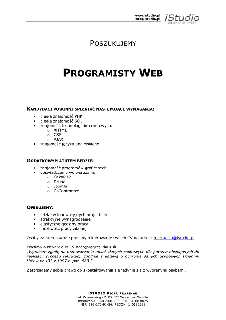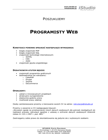www.istudio.pl [email protected] POSZUKUJEMY PROGRAMISTY WEB KANDYDACI POWINNI SPEŁNIAĆ NASTĘPUJĄCE WYMAGANIA: • • • • biegła znajomość PHP biegła znajomość SQL znajomość technologii internetowych: o XHTML o CSS o AJAX znajomość języka angielskiego DODATKOWYM ATUTEM BĘDZIE: • • znajomość programów graficznych doświadczenie we wdrażaniu: o CakePHP o Drupal o Joomla o OsCommerce OFERUJEMY: • • • • udział w innowacyjnych projektach atrakcyjne wynagrodzenie elastyczne godziny pracy możliwość pracy zdalnej Osoby zainteresowane prosimy o kierowanie swoich CV na adres: [email protected] Prosimy o zawarcie w CV następującej klauzuli: „Wyrażam zgodę na przetwarzanie moich danych osobowych dla potrzeb niezbędnych do realizacji procesu rekrutacji zgodnie z ustawą o ochronie danych osobowych Dziennik Ustaw nr 133 z 1997 r. poz. 883.” Zastrzegamy sobie prawo do skontaktowania się jedynie sie z wybranymi osobami. iSTUDIO PIOTR PRAJSNAR ul. Żeromskiego 7; 05-075 Warszawa-Wesoła mBank: 53 1140 2004 0000 3102 4268 8025 NIP: 526-270-91-56; REGON: 140582628