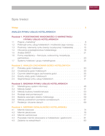 Spis treści Spis treści Wstęp ���������������������������������������������������������������������������������������������������� 5 ANALIZA RYNKU USŁUG HOTELARSKICH Rozdział 1. PODSTAWOWE WIADOMOŚCI O MARKETINGU I RYNKU USŁUG HOTELARSKICH 1.1 Pojęcie „marketing”������������������������������������������������������������������������� 1.2 Potencjał rynku usług hotelarskich i możliwości jego rozwoju������������� 1.3 Podmioty i elementy rynku branży turystycznej i hotelarskiej ������������� 1.4 Otoczenie przedsiębiorstwa hotelarskiego���������������������������������������� 1.5 Analiza SWOT �������������������������������������������������������������������������������� 1.6 Formy współpracy – franczyza, outsourcing, koopetycja, partnerstwo ����������������������������������������������������������������������������������� 1.7 Systemy hotelowe i grupy marketingowe ����������������������������������������� 23 25 Rozdział 2. ANALIZA ZACHOWAŃ GOŚCI HOTELOWYCH 2.1 Potrzeby gości hotelowych ������������������������������������������������������������� 2.2 Oczekiwania gości hotelowych ������������������������������������������������������� 2.3 Czynniki determinujące zachowania gości���������������������������������������� 2.4 Koszty utraty gości hotelowych������������������������������������������������������� 2.5 Segmentacja rynku usług hotelarskich �������������������������������������������� 30 33 35 37 41 Rozdział 3. BADANIA RYNKU USŁUG HOTELARSKICH 3.1 Marketingowy system informacji������������������������������������������������������� 3.2 Metody badań ������������������������������������������������������������������������������� 3.3 Metody budowy kwestionariusza ���������������������������������������������������� 3.4 Rodzaje skal pomiarowych ������������������������������������������������������������� 3.5 Badania wewnątrz obiektu hotelowego������������������������������������������� 3.6 Metody pośrednich pomiarów sondażowych����������������������������������� 3.7 Redakcja i zliczanie danych������������������������������������������������������������� 48 51 53 55 59 67 69 Rozdział 4. MIERNIKI DZIAŁALNOŚCI HOTELARSKIEJ 4.1 Mierniki ilościowe���������������������������������������������������������������������������� 4.2 Mierniki jakościowe������������������������������������������������������������������������� 4.3 Mierniki wartościowe ���������������������������������������������������������������������� 4.4 Pozostałe mierniki stosowane w hotelarstwie i gastronomii���������������� 4.5 Zadania na wskaźnikach ���������������������������������������������������������������� 74 76 77 81 83 8 10 15 18 21 3 Spis treści STRATEGIE DZIAŁAŃ MARKETINGOWYCH PRZEDSIĘBIORSTWA HOTELARSKIEGO Rozdział 5. MARKETING MIX W USŁUGACH HOTELARSKICH 5.1 Podstawowe orientacje działalności przedsiębiorstw ����������������������� 86 5.2 Pojęcie marketingu mix������������������������������������������������������������������� 89 5.3 Klasyfikacja produktu / usługi���