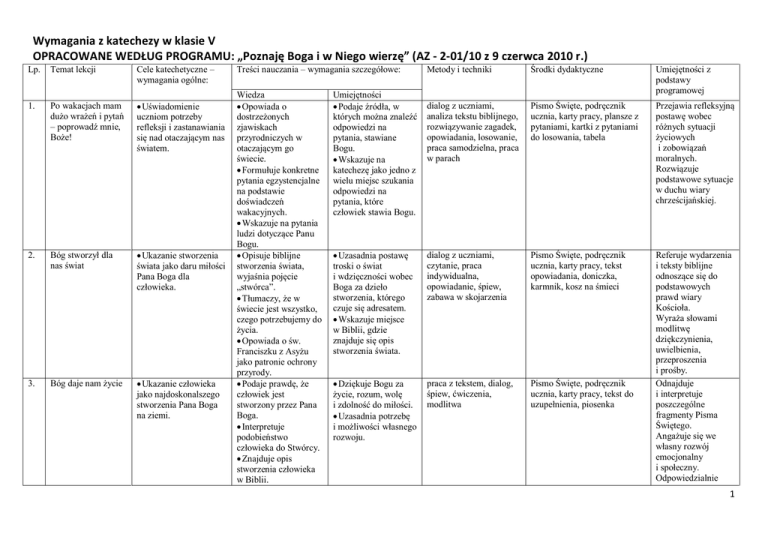 Wymagania z katechezy w klasie V OPRACOWANE WEDŁUG PROGRAMU: „Poznaję Boga i w Niego wierzę” (AZ - 2-01/10 z 9 czerwca 2010 r.) Lp. Temat lekcji Cele katechetyczne – wymagania ogólne: 1. Po wakacjach mam dużo wrażeń i pytań – poprowadź mnie, Boże! Uświadomienie uczniom potrzeby refleksji i zastanawiania się nad otaczającym nas światem. 2. Bóg stworzył dla nas świat Ukazanie stworzenia świata jako daru miłości Pana Boga dla człowieka. 3. Bóg daje nam życie Ukazanie człowieka jako najdoskonalszego stworzenia Pana Boga na ziemi. Treści nauczania – wymagania szczegółowe: Wiedza Opowiada o dostrzeżonych zjawiskach przyrodniczych w otaczającym go świecie. Formułuje konkretne pytania egzystencjalne na podstawie doświadczeń wakacyjnych. Wskazuje na pytania ludzi dotyczące Panu Bogu. Opisuje biblijne stworzenia świata, wyjaśnia pojęcie „stwórca”. Tłumaczy, że w świecie jest wszystko, czego potrzebujemy do życia. Opowiada o św. Franciszku z Asyżu jako patronie ochrony przyrody. Podaje prawdę, że człowiek jest stworzony przez Pana Boga. Interpretuje podobieństwo człowieka do Stwórcy. Znajduje opis stworzenia człowieka w Biblii. Metody i techniki Środki dydaktyczne Umiejętności z podstawy programowej dialog z uczniami, analiza tekstu biblijnego, rozwiązywanie zagadek, opowiadania, losowanie, praca samodzielna, praca w parach Pismo Święte, podręcznik ucznia, karty pracy, plansze z pytaniami, kartki z pytaniami do losowania, tabela Przejawia refleksyjną postawę wobec różnych sytuacji życiowych i zobowiązań moralnych. Rozwiązuje podstawowe sytuacje w duchu wiary chrześcijańskiej. Uzasadnia postawę troski o świat i wdzięczności wobec Boga za dzieło stworzenia, którego czuje się adresatem. Wskazuje miejsce w Biblii, gdzie znajduje się opis stworzenia świata. dialog z uczniami, czytanie, praca indywidualna, opowiadanie, śpiew, zabawa w skojarzenia Pismo Święte, podręcznik ucznia, karty pracy, tekst opowiadania, doniczka, karmnik, kosz na śmieci Dziękuje Bogu za życie, rozum, wolę i zdolność do miłości. Uzasadnia potrzebę i możliwości własnego rozwoju. praca z tekstem, dialog, śpiew, ćwiczenia, modlitwa Pismo Święte, podręcznik ucznia, karty pracy, tekst do uzupełnienia, piosenka Referuje wydarzenia i teksty biblijne odnoszące się do podstawowych prawd wiary Kościoła. Wyraża słowami modlitwę dziękczynienia, uwielbienia, przeproszenia i prośby. Odnajduje i interpretuje poszczególne fragmenty Pisma Świętego. Angażuje się we własny rozwój emocjonalny i społeczny. Odpowiedzialnie Umiejętności Podaje źródła, w których można znaleźć odpowiedzi na pytania, stawiane Bogu. Wskazuje na katechezę jako jedno z wielu miejsc szukania odpowiedzi na pytania, które człowiek stawia Bogu. 1 4. Bóg daje nam pomocną dłoń – aniołowie Ukazanie Boga jako Stwórcy aniołów. Pogłębienie wiedzy dotyczącej roli aniołów, a zwłaszcza Anioła Stróża, w naszym życiu. Podaje prawdę, że Bóg jest Stwórcą aniołów. Wymienia imiona trzech Archaniołów. Podaje cechy aniołów, określa w czym są podobni, a czym różnią się od Boga i ludzi. 5. Bóg zaprasza do wspólnoty życia z sobą Ukazanie stanu szczęścia człowieka przed grzechem pierworodnym. 6. Ludzie zrywają wspólnotę życia z Bogiem Ukazanie przyczyn i skutków grzechu pierworodnego. Definiuje treść pojęcia „raj”. Interpretuje drugi opis stworzenia człowieka. Wymienia dary, jakie człowiek otrzymał od Pana Boga. Podaje zadania i możliwości, jakie człowiek miał w Raju. Definiuje grzech pierworodny. Podaje i interpretuje skutki grzechu pierworodnego. Znajduje w Biblii perykopę grzechu pierworodnego. Uczeń wie również, że grzech nie zmienił nastawienia Pana Boga do ludzi. Wskazuje na postawę wdzięczności i zaufania wobec Anioła Stróża. Uzasadnia konieczność modlitwy do aniołów. Określa, na czym polega łączność i solidarność świata aniołów z ludźmi. Podkreśla zaznaczenie bliskości Pana Boga w relacji do człowieka. Uzasadnia potrzebę angażowania się człowieka w udoskonalanie świata. Odkrywa zadania dla siebie w budowaniu własnego szczęścia. Uzasadnia zbieżność między swoimi grzechami, a skażeniem ludzkiej natury przez grzech pierworodny. Przeprasza za swoje grzechy i wskazuje na konieczność Bożej pomocy w walce z grzechem. odejmuje własne zadania w najbliższym otoczeniu. Referuje wydarzenia i teksty biblijne odnoszące się do podstawowych prawd wiary Kościoła. Przejawia postawę szacunku i zaufania Bogu. dialog z uczniami, analiza tekstu biblijnego, praca z tekstem, praca indywidualna, opowiadanie Pismo Święte, podręcznik ucznia, karty pracy, obrazy aniołów, mapa Polski lub atlas, ewentualnie mapa internetowa, Internet analiza tekstu biblijnego, zabawa w skojarzenia, dialog, praca indywidualna, praca w grupach, burza mózgów Pismo Święte, podręcznik ucznia, karty pracy, kartka papieru, klocki lego, warzywa, instrument muzyczny Integruje wydarzenia biblijne z liturgią, rokiem liturgicznym i zwyczajami oraz aktualnymi wyzwaniami życiowymi. Rozumie, co to znaczy być odpowiedzialnym. rozmowa z uczniami, rachunek sumienia, czytanie narracyjne, analiza tekstu biblijnego, praca indywidualna Pismo Święte, podręcznik ucznia, karty pracy, szklane naczynia, kartki z określeniami przyczyn i skutków grzechu pierworodnego, test luk, drzewo genealogiczne zła Odnajduje i interpretuje poszczególne fragmenty Pisma Świętego. Dostrzega konsekwencje dobra i zła. Uzasadnia wartość sakramentu pokuty i pojednania. Reaguje na niewłaściwe zachowanie w określonej grupie. 2 7. Grzechem krzywdzę drugiego człowieka Ukazanie, że człowiek, grzesząc, rani innych ludzi. Kształtowanie postawy pracy nad cnotami. Wyjaśnia, kim byli Kain i Abel. Wskazuje, czym kierował się Kain, zabijając Abla. Wylicza i wyjaśnia grzechy główne. Definiuje pojęcie „cn