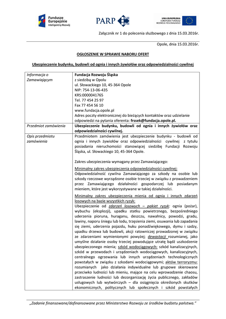 Załącznik nr 1 do polecenia służbowego z dnia 15.03.2016r. Opole, dnia 15.03.2016r. OGŁOSZENIE W SPRAWIE NABORU OFERT Ubezpieczenie budynku, budowli od ognia i innych żywiołów oraz odpowiedzialności cywilnej Informacja o Zamawiającym Przedmiot zamówienia Opis przedmiotu zamówienia Fundacja Rozwoju Śląska z siedzibą w Opolu ul. Słowackiego 10, 45-364 Opole NIP: 754-13-06-435 KRS:0000041765 Tel. 77 454 25 97 Fax 77 454 56 10 www.fundacja.opole.pl Adres poczty elektronicznej do bieżących kontaktów oraz udzielanie odpowiedzi na pytania oferenta: [email protected]. Ubezpieczenie budynku, budowli od ognia i innych żywiołów oraz odpowiedzialności cywilnej. Przedmiotem zamówienia jest ubezpieczenie budynku - budowli od ognia i innych żywiołów oraz odpowiedzialności cywilnej z tytułu posiadania nieruchomości stanowiącej siedzibę Fundacji Rozwoju Śląska, ul. Słowackiego 10, 45-364 Opole. Zakres ubezpieczenia wymagany przez Zamawiającego: Minimalny zakres ubezpieczenia odpowiedzialności cywilnej: Odpowiedzialność cywilna Zamawiającego za szkody na osobie lub szkody rzeczowe wyrządzone osobie trzeciej w związku z prowadzeniem przez Zamawiającego działalności gospodarczej lub posiadanym mieniem, które jest wykorzystywane w takiej działalności. Minimalny zakres ubezpieczenia mienia od ognia i innych zdarzeń losowych na bazie wszystkich ryzyk: Ubezpieczenie od zdarzeń losowych – pakiet ryzyk: ognia (pożar), wybuchu (eksplozji), upadku statku powietrznego, bezpośredniego uderzenia pioruna, huraganu, deszczu, nawałnicy, powodzi, gradu, lawiny, naporu śniegu lub lodu, trzęsienia ziemi, osuwania lub zapadania się ziemi, uderzenia pojazdu, huku ponadźwiękowego, dymu i sadzy, upadku drzewa lub budowli, akcji ratowniczej prowadzonej w związku ze zdarzeniami wymienionymi powyżej; dewastacji rozumianej, jako umyślne działanie osoby trzeciej powodujące utratę bądź uszkodzenie ubezpieczonego mienia; szkód wodociągowych: szkód kanalizacyjnych, szkód w przewodach i urządzeniach wodociągowych, kanalizacyjnych, centralnego ogrzewania lub innych urządzeniach technologicznych powstałych w związku z szkodami wodociągowymi; aktów terroryzmu: rozumianych jako działania indywidualne lub grupowe skierowane przeciwko ludności lub mieniu, mające na celu wprowadzenie chaosu, zastraszenie ludności lub dezorganizację życia publicznego, zakładów usługowych lub wytwórczych – dla osiągnięcia określonych skutków ekonomicznych, politycznych lub społecznych i szkód powstałych „Zadanie finansowane/dofinansowane przez Ministerstwo Rozwoju ze środków budżetu państwa.” Załącznik nr 1 do polecenia służbowego z dnia 15.03.2016r. w związku z powyższym; przepięć: szkody powstałe w skutek nagłego wzrostu napięcia elektrycznego spowodowany wyładowaniami atmosferycznymi. Warunki udziału w postępowaniu Termin realizacji zamówienia Kryteria oceny oferty Szczegółowy opis przedmiotu ubezpieczenia określony został w załączniku nr 1 do niniejszego ogłoszenia. Wykonawca posiada niezbędną wiedzę, doświadczenie, uprawnienia oraz potencjał techniczny do wykonywania określonego w ogłoszeniu o naborze przedmiotu zamówienia. W postępowaniu mogą brać udział Wykonawcy, którzy posiadają zezwolenia do wykonywania działalności ubezpieczeniowej na terytorium RP, zgodnie z ustawą z dnia 22 maja 2003r o działalności ubezpieczeniowej (Dz.U. z 2013r, poz. 950 z późn. zm.). Od dnia zawarcia polisy ubezpieczeniowej na okres 12 miesięcy. Okres ubezpieczenia: 08.04.2016r. – 07.04.2017r. (Zamawiający zastrzega sobie prawo do podpisana umowy na okres inny, niż wynika z terminu realizacji) Zleceniodawca wybierze najkorzystniejszą ofertę, spośród ofert niepodlegających odrzuceniu, na podstawie następujących kryteriów: 1. Cena oraz zgodność złożonej oferty z wymogami określonymi w ogłoszeniu o naborze – 70% Punkty będą przyznawane po wyliczeniu wg wzoru: Cena oferty najniższej _________________ x 70 pkt. Cena oferty ocenianej 2. Suma ubezpieczenia – 30% Łączna wartość ocenianej sumy ubezpieczenia ___________________________________ x 30 pkt. Łączna wartość najwyższej sumy ubezpieczenia Termin składania ofert Sposób przygotowania oferty: Zleceniodawca zastrzega sobie prawo do negocjacji z Oferentem zaoferowanej kwoty wynagrodzenia. Termin końcowy składania ofert: do 22.03.2016r. UWAGA: decyduje termin doręczenia oferty. Oferty doręczone po terminie podlegają odrzuceniu. - Wykonawca obliczy cenę zamówienia w oparciu o informacje zwarte w opisie przedmiotu zamówienia, stanowiący załącznik nr 1 do ogłoszenia o naborze; - cena oferty powinna zawierać wszystkie składniki, upusty oraz koszty niezbędne do wykonania zamówienia; - cena musi być wyrażona w złotych polskich z dokładnością do dwóch miejsc po przecinku, wyrażoną cyfrowo i słownie; - oferta powinna być wypełniona zgodnie z wzorem formularza ofertowego stanowiącego załącznik nr 2 do niniejszego ogłoszenia o naborze; - każdy Oferent może złożyć jedną ofertę, sporządzoną w sposób „Zadanie finansowane/dofinansowane przez Ministerstwo Rozwoju ze środków budżetu państwa.” Załącznik nr 1 do polecenia służbowego z dnia 15.03.2016r. Sposób składania ofert (adres mailowy, nr faksu) czytelny w języku polskim; -Zamawiający zastrzega, iż w toku sprawdzania dokumentów, w przypadkach tego wymagających będzie miał prawo żądać od Oferentów wyjaśnień/ uzupełnień dotyczących złożonych dokumentów i treści oferty. - Zamawiający zastrzega, iż w przygotowanej ofercie zmianie nie mogą ulec założone przez Zamawiającego pozycje ubezpieczenia wraz z sumami ubezpieczenia. Oferty prosimy składać w formie elektronicznej na adres e-mail: [email protected] lub w formie wydruku w siedzibie Fundacja Rozwoju Śląska Ul. Słowackiego 10 45-364 Opole Forma płatności Informacje dodatkowe Z dopi