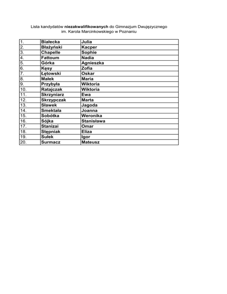 Lista kandydatów niezakwalifikowanych do Gimnazjum Dwujęzycznego im. Karola Marcinkowskiego w Poznaniu 1. 2. 3. 4. 5. 6. 7. 8. 9. 10. 11. 12. 13. 14. 15. 16. 17. 18. 19. 20. Białecka BłaŜyński Chapelle Fattoum Górka Kęsy Łętowski Małek Przybyła Ratajczak Skrzyniarz Skrzypczak Sławek Smektała Sobótka Sójka Stanizai Stępniak Sułek Surmacz Julia Kacper Sophie Nadia Agnieszka Zofia Oskar Maria Wiktoria Wiktoria Ewa Marta Jagoda Joanna Weronika Stanisława Omar Eliza Igor Mateusz