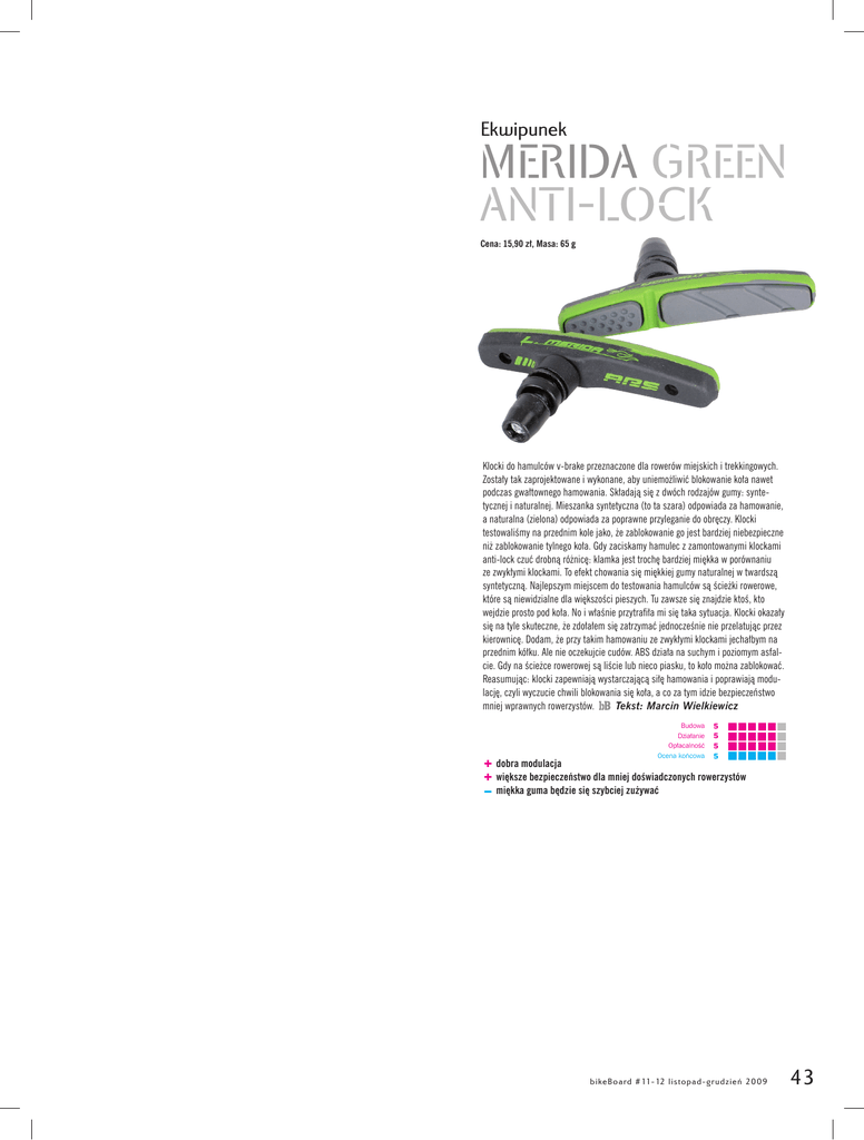 Ekwipunek MERIDA GREEN ANTI-LOCK Cena: 15,90 zł, Masa: 65 g Yakkay Duńska firma Yakkaya postanowiła „ukryć” klasyczny kask typu BMX-owego przykryciem zwykłych nakryć głowy w wielu modnych wzorach i kolorach. Mając kask o takim cywilnym charakterze już nie trzeba się martwić, że plastikowy „kapelusz” psuje staranie przygotowany image. SR Suntour Swing Shock W rowerach terenowych teleskopowa konstrukcja przednich amortyzatorów zdecydowanie zdominowała rynek. Nawet egzotyczne „up side down” oraz Lefty i HeadShock w gruncie rzeczy wykorzystują to samo podejście. Teleskopy są skomplikowane i w niektórych niewymagających zastosowaniach po prostu niepotrzebne. Z takiego założenia wyszedł Suntour i przedstawił nowy miejski widelec na 2010 r. wykorzystujący prosty zawias. Przy skoku 25 mm nie przejmują się tłumieniem ani regulacją. Wystarczy elastomerowy odbijacz przy końcu skoku. W rowerze do jeżdżenia do pracy czy szkoły ważniejsza jest możliwość zamontowania błotnika i lampki. Pojedynczą sprężynę można dopasować do wagi bikera kluczem imbusowym. Aluminiowa rura sterowa i magnezowe golenie zapewniają bardzo przyzwoitą masę - 1500/1300 g, odpowiednio dla wersji z piwotami i bez. Klocki do hamulców v-brake przeznaczone dla rowerów miejskich i trekkingowych. Zostały tak zaprojektowane i wykonane, aby uniemożliwić blokowanie koła nawet podczas gwałtownego hamowania. Składają się z dwóch rodzajów gumy: syntetycznej i naturalnej. Mieszanka syntetyczna (to ta szara) odpowiada za hamowanie, a naturalna (zielona) odpowiada za poprawne przyleganie do obręczy. Klocki testowaliśmy na przednim kole jako, że zablokowanie go jest bardziej niebezpieczne niż zablokowanie tylnego koła. Gdy zaciskamy hamulec z zamontowanymi klockami anti-lock czuć drobną różnicę: klamka jest trochę bardziej miękka w porównaniu ze zwykłymi klockami. To efekt chowania się miękkiej gumy naturalnej w twardszą syntetyczną. Najlepszym miejscem do testowania hamulców są ścieżki rowerowe, które są niewidzialne dla większości pieszych. Tu zawsze się znajdzie ktoś, kto wejdzie prosto pod koła. No i właśnie przytrafiła mi się taka sytuacja. Klocki okazały się na tyle skuteczne, że zdołałem się zatrzymać jednocześnie nie przelatując przez kierownicę. Dodam, że przy takim hamowaniu ze zwykłymi klockami jechałbym na przednim kółku. Ale nie oczekujcie cudów. ABS działa na suchym i poziomym asfalcie. Gdy na ścieżce rowerowej są liście lub nieco piasku, to koło można zablokować. Reasumując: klocki zapewniają wystarczającą siłę hamowania i poprawiają modulację, czyli wyczucie chwili blokowania się koła, a co za tym idzie bezpieczeństwo mniej wprawnych rowerzystów. Tekst: Marcin Wielkiewicz Budowa Działanie Opłacalność Ocena końcowa 5 5 5 5 dobra modulacja większe bezpieczeństwo dla mniej doświadczonych rowerzystów miękka guma będzie się szybciej zużywać Ten potężny łańcuch sprawi, że pozostawienie roweru bez opieki oszczędzi nerwów w pracy, szkole czy na zakupach. Łańcuch zbudowany jest z ogniw o przekroju 8 mm ze stali hartowanej, kłódka zabezpieczona przed rozwierceniem. Osłona poliestrowa chroni przed obiciem ramy, 2 klucze. Długość: 95 cm, cena: 128 zł. Kolejnych pozycji na rowerowe prezenty szukaj na str. 50. bi ke Boa r d #11-12 l i sto p a d - g r u d zi eń 2 0 0 9 43