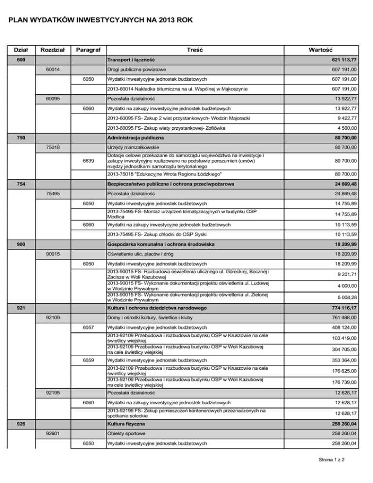 PLAN WYDATKÓW INWESTYCYJNYCH NA 2013 ROK Dział 600 Rozdział 60014 60095 750 Paragraf 6050 6060 75018 921 2013-60014 Nakładka bitumiczna na ul. Wspólnej w Mąkoszynie Pozostała działalność Wydatki na zakupy inwestycyjne jednostek budżetowych 2013-60095 FS- Zakup 2 wiat przystankowych- Wodzin Majoracki 75495 6050 90015 92109 6057 92195 92601 6060 6050 621 113,77 607 191,00 607 191,00 607 191,00 13 922,77 13 922,77 9 422,77 4 500,00 80 700,00 Dotacje celowe przekazane do samorządu województwa na inwestycje i zakupy inwestycyjne realizowane na podstawie porozumień (umów) między jednostkami samorządu terytorialnego 80 700,00 80 700,00 2013-75018 "Edukacyjne Wrota Regionu Łódzkiego" 80 700,00 Pozostała działalność 24 869,48 Wydatki inwestycyjne jednostek budżetowych 24 869,48 14 755,89 2013-75495 FS- Montaż urządzeń klimatyzacyjnych w budynku OSP Modlica 14 755,89 2013-75495 FS- Zakup chłodni do OSP Syski 10 113,59 Oświetlenie ulic, placów i dróg 18 209,99 Wydatki na zakupy inwestycyjne jednostek budżetowych Gospodarka komunalna i ochrona środowiska 6050 Wartość Administracja publiczna Bezpieczeństwo publiczne i ochrona przeciwpożarowa 6059 926 Wydatki inwestycyjne jednostek budżetowych Urzędy marszałkowskie 6060 900 Drogi publiczne powiatowe 2013-60095 FS- Zakup wiaty przystankowej- Zofiówka 6639 754 Transport i łączność Treść Wydatki inwestycyjne jednostek budżetowych 2013-90015 FS- Rozbudowa oświetlenia ulicznego ul. Góreckiej, Bocznej i Zacisze w Woli Kazubowej 2013-90015 FS- Wykonanie dokumentacji projektu oświetlenia ul. Ludowej w Wodzinie Prywatnym 2013-90015 FS- Wykonanie dokumentacji projektu oświetlenia ul. Zielonej w Wodzinie Prywatnym 10 113,59 18 209,99 18 209,99 9 201,71 4 000,00 5 008,28 Kultura i ochrona dziedzictwa narodowego 774 116,17 Wydatki inwestycyjne jednostek budżetowych 408 124,00 Domy i ośrodki kultury, świetlice i kluby 2013-92109 Przebudowa i rozbudowa budynku OSP w Kruszowie na cele świetlicy wiejskiej 2013-92109 Przebudowa i rozbudowa budynku OSP w Woli Kazubowej na cele świetlicy wiejskiej Wydatki inwestycyjne jednostek budżetowych 2013-92109 Przebudowa i rozbudowa budynku OSP w Kruszowie na cele świetlicy wiejskiej 2013-92109 Przebudowa i rozbudowa budynku OSP w Woli Kazubowej na cele świetlicy wiejskiej Pozostała działalność Wydatki na zakupy inwestycyjne jednostek budżetowych 2013-92195 FS- Zakup pomieszczeń kontenerowych przeznaczonych na spotkania sołeckie 761 488,00 103 419,00 304 705,00 353 364,00 176 625,00 176 739,00 12 628,17 12 628,17 12 628,17 Kultura fizyczna 258 260,04 Wydatki inwestycyjne jednostek budżetowych 258 260,04 Obiekty sportowe 258 260,04 Strona 1 z 2 2013-92601 FS- Wykonanie ogrodzenia boiska do piłki siatkowej w Żerominie plus zakup wyposażenia boiska 2013-92601 Wykonanie instalacji pomp ciepła dla Krytej Pływalni "Oceanik" w Tuszynie Razem 14 369,04 243 891,00 1 777 269,45 Strona 2 z 2