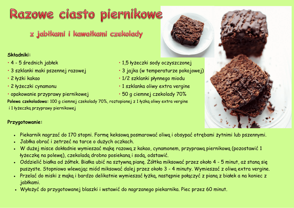 Składniki: • 4 - 5 średnich jabłek • 1,5 łyżeczki sody oczyszczonej • 3 szklanki maki pszennej razowej • 3 jajka (w temperaturze pokojowej) • 2 łyżki kakao • 1/2 szklanki płynnego miodu • 2 łyżeczki cynamonu • 1 szklanka oliwy extra vergine • opakowanie przyprawy piernikowej • 50 g ciemnej czekolady 70% Polewa czekoladowa: 100 g ciemnej czekolady 70%, roztopionej z 1 łyżką oliwy extra vergine i 1 łyżeczką przyprawy piernikowej Przygotowanie: Piekarnik nagrzać do 170 stopni. Formę keksową posmarować oliwą i obsypać otrębami żytnimi lub pszennymi. Jabłka obrać i zetrzeć na tarce o dużych oczkach. W dużej misce dokładnie wymieszać mąkę razową z kakao, cynamonem, przyprawą piernikową (pozostawić 1 łyżeczkę na polewę), czekoladą drobno posiekaną i sodą, odstawić. Oddzielić białka od żółtek. Białka ubić na sztywną pianę. Żółtka miksować przez około 4 - 5 minut, aż staną się puszyste. Stopniowo wlewając miód miksować dalej przez około 3 - 4 minuty. Wymieszać z oliwą extra vergine. Przelać do miski z mąką i bardzo delikatnie wymieszać łyżką, następnie połączyć z pianą z białek a na koniec z jabłkami. Wyłożyć do przygotowanej blaszki i wstawić do nagrzanego piekarnika. Piec przez 60 minut.