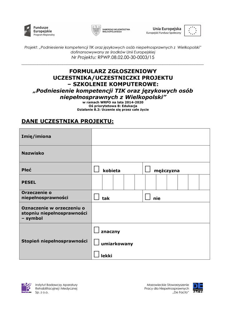 Projekt: „Podniesienie kompetencji TIK oraz językowych osób niepełnosprawnych z Wielkopolski” dofinansowywany ze środków Unii Europejskiej Nr Projektu: RPWP.08.02.00-30-0003/15 ________________________________________________________________________________ FORMULARZ ZGŁOSZENIOWY UCZESTNIKA/UCZESTNICZKI PROJEKTU – SZKOLENIE KOMPUTEROWE: „Podniesienie kompetencji TIK oraz językowych osób niepełnosprawnych z Wielkopolski” w ramach WRPO na lata 2014-2020 Oś priorytetowa 8: Edukacja Działanie 8.2: Uczenie się przez całe życie DANE UCZESTNIKA PROJEKTU: Imię/imiona Nazwisko Płeć kobieta mężczyzna tak nie PESEL Orzeczenie o niepełnosprawności Oznaczenie w orzeczeniu o stopniu niepełnosprawności – symbol znaczny Stopień niepełnosprawności umiarkowany lekki Instytut Badawczy Aparatury Rehabilitacyjnej i Medycznej Sp. z o.o. Mazowieckie Stowarzyszenie Pracy dla Niepełnosprawnych „De Facto” Projekt: „Podniesienie kompetencji TIK oraz językowych osób niepełnosprawnych z Wielkopolski” dofinansowywany ze środków Unii Europejskiej Nr Projektu: RPWP.08.02.00-30-0003/15 ________________________________________________________________________________ Osoba należąca do mniejszości narodowej lub etnicznej, migrant, osoba obcego pochodzenia tak nie odmowa podania informacji Osoba bezdomna lub dotknięta wykluczeniem z dostępu do mieszkań tak Osoba przebywająca w gospodarstwie domowym bez osób pracujących tak w tym: w gospodarstwie domowym z dziećmi pozostającymi na utrzymaniu Osoba żyjąca w gospodarstwie składającym się z jednej osoby dorosłej i dzieci pozostających na utrzymaniu Osoba w innej niekorzystnej sytuacji społecznej (innej niż wymienione powyżej)* nie nie tak nie tak nie tak nie odmowa podania informacji * Przykładem takiej sytuacji jest miejsce zamieszkania na obszarach wiejskich o małej gęstości zaludnienia (DEGURBA 3), posiadanie wykształcenia na poziomie ISCED 0, czy też bycie byłym więźniem, narkomanem itp Instytut Badawczy Aparatury Rehabilitacyjnej i Medycznej Sp. z o.o. Mazowieckie Stowarzyszenie Pracy dla Niepełnosprawnych „De Facto” Projekt: „Podniesienie kompetencji TIK oraz językowych osób niepełnosprawnych z Wielkopolski” dofinansowywany ze środków Unii Europejskiej Nr Projektu: RPWP.08.02.00-30-0003/15 ________________________________________________________________________________ miejsce zamieszkania Województwo Wielkopolskie miejsce nauki miejsce pracy DANE KONTAKTOWE: Ulica Nr domu Nr domu Miejscowość Kod pocztowy Powiat Tel. stacjonarny Tel. komórkowy e-mail Instytut Badawczy Aparatury Rehabilitacyjnej i Medycznej Sp. z o.o. Mazowieckie Stowarzyszenie Pracy dla Niepełnosprawnych „De Facto” Projekt: „Podniesienie kompetencji TIK oraz językowych osób niepełnosprawnych z Wielkopolski” dofinansowywany ze środków Unii Europejskiej Nr Projektu: RPWP.08.02.00-30-0003/15 ________________________________________________________________________________ WYKSZTAŁCENIE: Brak Podstawowe Gimnazjalne Ponadgimnazjalne zasadnicza szkoła zawodowa liceum ogólnokształcące liceum profilowane technikum, uzupełniające liceum ogólnokształcące technikum uzupełniające Szkoły policealne wyższe studia zawodowe Wyższe studia magisterskie studia uzupełniające magisterskie studia podyplomowe Instytut Badawczy Aparatury Rehabilitacyjnej i Medycznej Sp. z o.o. Mazowieckie Stowarzyszenie Pracy dla Niepełnosprawnych „De Facto” Projekt: „Podniesienie kompetencji TIK oraz językowych osób niepełnosprawnych z Wielkopolski” dofinansowywany ze środków Unii Europejskiej Nr Projektu: RPWP.08.02.00-30-0003/15 ________________________________________________________________________________ Dodatkowe kursy, szkolenia itp. Dodatkowe umiejętności: STATUS OSOBY NA RYNKU PRACY W CHWILI PRZYSTĄPIENIA DO PROJEKTU: Osoba bierna zawodowo (osoba, która nie tworzy zasobów siły roboczej, tzn. nie pracuje i nie jest bezrobotna) tak nie tak Osoba bezrobotna zarejestrowana w ewidencji urzędów pracy: -----------------------------------Osoba bezrobotna niezarejestrowana w ewidencji urzędów pracy: nie ------------------------------------tak nie osoba długotrwale bezrobotna* tak nie * pozostającą w rejestrze powiatowego urzędu pracy łącznie przez okres co najmniej 12 miesięcy w okresie ostatnich 2 lat z wyłączeniem okresów odbywania stażu i przygotowania zawodowego dorosłych Instytut Badawczy Aparatury Rehabilitacyjnej i Medycznej Sp. z o.o. Mazowieckie Stowarzyszenie Pracy dla Niepełnosprawnych „De Facto” Projekt: „Podniesienie kompetencji TIK oraz językowych osób niepełnosprawnych z Wielkopolski” dofinansowywany ze środków Unii Europejskiej Nr Projektu: RPWP.08.02.00-30-0003/15 ________________________________________________________________________________ w tym osoba ucząca się lub kształcąca się tak nie Osoba zatrudniona tak □ jestem rolnikiem lub domownikiem (jestem objęty/a ubezpieczeniem KRUS) □ jestem samo zatrudniony/a (prowadzę pozarolniczą działalność gospodarczą) □ jestem zatrudniony/a w mikroprzedsiębiorstwie (od 2-9 pracowników) □ jestem zatrudniony/a w małym przedsiębiorstwie ( od 10-49 pracowników) □ jestem zatrudniony/a w średnim przedsiębiorstwie ( od 50-249 pracowników) □ jestem zatrudniony/a w dużym przedsiębiorstwie ( powyżej 250 pracowników) □ jestem zatrudniony/a w administracji publicznej □ jestem zatrudniony/a w organizacji pozarządowej nie Instytut Badawczy Aparatury Rehabilitacyjnej i Medycznej Sp. z o.o. Mazowieckie Stowarzyszenie Pracy dla Niepełnosprawnych „De Facto” Projekt: „Podniesienie kompetencji TIK oraz językowych osób niepełnosprawnych z Wielkopolski” dofinansowywany ze środków Unii Europejskiej Nr Projektu: RPWP.08.02.00-30-0003/15 ________________________________________________________________________________ Wykonywany zawód DANE UZUPEŁNIAJĄCE: Czy porusza się Pani/