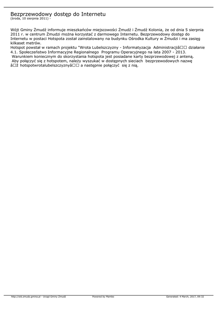 Bezprzewodowy dostęp do Internetu (środa, 10 sierpnia 2011) - Wójt Gminy Żmudź informuje mieszkańców miejscowości Żmudź i Żmudź Kolonia, że od dnia 5 sierpnia 2011 r. w centrum Żmudzi można korzystać z darmowego Internetu. Bezprzewodowy dostęp do Internetu w postaci Hotspota został zainstalowany na budynku Ośrodka Kultury w Żmudzi i ma zasięg kilkaset metrów. Hotspot powstał w ramach projektu "Wrota Lubelszczyzny - Informatyzacja Administracji― działanie 4.1. Społeczeństwo Informacyjne Regionalnego Programu Operacyjnego na lata 2007 - 2013. Warunkiem koniecznym do skorzystania hotspota jest posiadane karty bezprzewodowej z anteną. Aby połączyć się z hotspotem, należy wyszukać w dostępnych sieciach bezprzewodowych nazwę „hotspotwrotalubelszczyzny― a następnie połączyć się z nią. http://old.zmudz.gmina.pl - Urząd Gminy Żmudź Powered by Mambo Generated: 4 March, 2017, 09:32