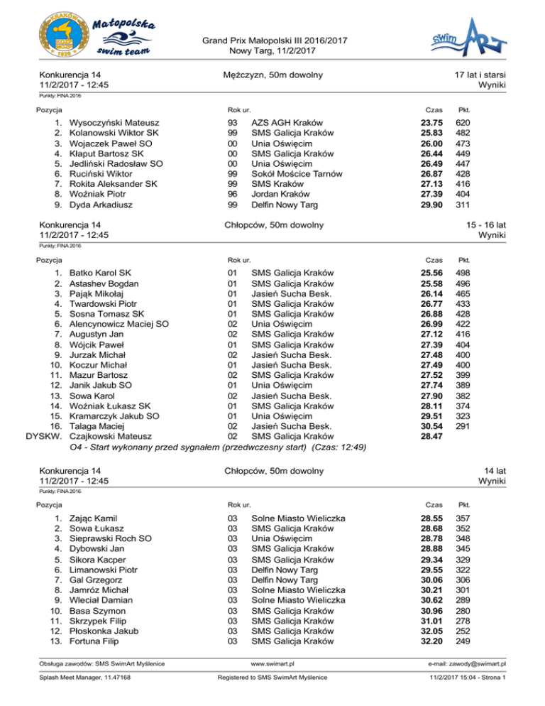 Grand Prix Małopolski III 2016/2017 Nowy Targ, 11/2/2017 Konkurencja 14 11/2/2017 - 12:45 Mężczyzn, 50m dowolny 17 lat i starsi Wyniki Punkty: FINA 2016 Pozycja 1. 2. 3. 4. 5. 6. 7. 8. 9. Rok ur. Wysoczyński Mateusz Kolanowski Wiktor SK Wojaczek Paweł SO Kłaput Bartosz SK Jedliński Radosław SO Ruciński Wiktor Rokita Aleksander SK Woźniak Piotr Dyda Arkadiusz Konkurencja 14 11/2/2017 - 12:45 93 99 00 00 00 99 99 96 99 AZS AGH Kraków SMS Galicja Kraków Unia Oświęcim SMS Galicja Kraków Unia Oświęcim Sokół Mościce Tarnów SMS Kraków Jordan Kraków Delfin Nowy Targ Czas Pkt. 23.75 25.83 26.00 26.44 26.49 26.87 27.13 27.39 29.90 620 482 473 449 447 428 416 404 311 Chłopców, 50m dowolny 15 - 16 lat Wyniki Punkty: FINA 2016 Pozycja 1. 2. 3. 4. 5. 6. 7. 8. 9. 10. 11. 12. 13. 14. 15. 16. DYSKW. Rok ur. Batko Karol SK 01 SMS Galicja Kraków Astashev Bogdan 01 SMS Galicja Kraków Pająk Mikołaj 01 Jasień Sucha Besk. Twardowski Piotr 01 SMS Galicja Kraków Sosna Tomasz SK 01 SMS Galicja Kraków Alencynowicz Maciej SO 02 Unia Oświęcim Augustyn Jan 02 SMS Galicja Kraków Wójcik Paweł 01 SMS Galicja Kraków Jurzak Michał 02 Jasień Sucha Besk. Koczur Michał 01 Jasień Sucha Besk. Mazur Bartosz 02 SMS Galicja Kraków Janik Jakub SO 01 Unia Oświęcim Sowa Karol 02 Jasień Sucha Besk. Woźniak Łukasz SK 01 SMS Galicja Kraków Kramarczyk Jakub SO 01 Unia Oświęcim Talaga Maciej 02 Jasień Sucha Besk. Czajkowski Mateusz 02 SMS Galicja Kraków O4 - Start wykonany przed sygnałem (przedwczesny start) (Czas: 12:49) Konkurencja 14 11/2/2017 - 12:45 Czas Pkt. 25.56 25.58 26.14 26.77 26.88 26.99 27.12 27.39 27.48 27.49 27.52 27.74 27.90 28.11 29.51 30.54 28.47 498 496 465 433 428 422 416 404 400 400 399 389 382 374 323 291 Chłopców, 50m dowolny 14 lat Wyniki Punkty: FINA 2016 Pozycja 1. 2. 3. 4. 5. 6. 7. 8. 9. 10. 11. 12. 13. Rok ur. Zając Kamil Sowa Łukasz Sieprawski Roch SO Dybowski Jan Sikora Kacper Limanowski Piotr Gal Grzegorz Jamróz Michał Wleciał Damian Basa Szymon Skrzypek Filip Płoskonka Jakub Fortuna Filip Obsługa zawodów: SMS SwimArt Myślenice Splash Meet Manager, 11.47168 03 03 03 03 03 03 03 03 03 03 03 03 03 Solne Miasto Wieliczka SMS Galicja Kraków Unia Oświęcim SMS Galicja Kraków SMS Galicja Kraków Delfin Nowy Targ Delfin Nowy Targ Solne Miasto Wieliczka Solne Miasto Wieliczka SMS Galicja Kraków SMS Galicja Kraków SMS Galicja Kraków SMS Galicja Kraków Czas Pkt. 28.55 28.68 28.78 28.88 29.34 29.55 30.06 30.21 30.62 30.96 31.01 32.05 32.20 357 352 348 345 329 322 306 301 289 280 278 252 249 www.swimart.pl e-mail: [email protected] Registered to SMS SwimArt Myślenice 11/2/2017 15:04 - Strona 1