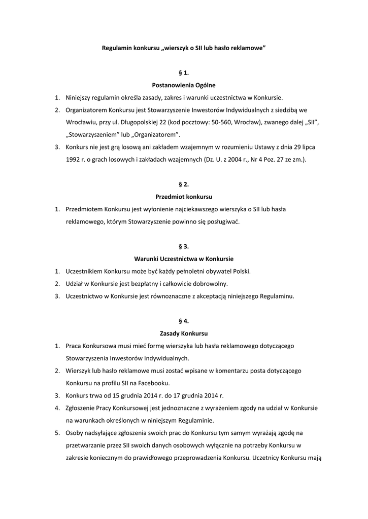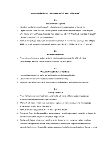 Regulamin konkursu „wierszyk o SII lub hasło reklamowe” § 1. Postanowienia Ogólne 1. Niniejszy regulamin określa zasady, zakres i warunki uczestnictwa w Konkursie. 2. Organizatorem Konkursu jest Stowarzyszenie Inwestorów Indywidualnych z siedzibą we Wrocławiu, przy ul. Długopolskiej 22 (kod pocztowy: 50-560, Wrocław), zwanego dalej „SII”, „Stowarzyszeniem” lub „Organizatorem”. 3. Konkurs nie jest grą losową ani zakładem wzajemnym w rozumieniu Ustawy z dnia 29 lipca 1992 r. o grach losowych i zakładach wzajemnych (Dz. U. z 2004 r., Nr 4 Poz. 27 ze zm.). § 2. Przedmiot konkursu 1. Przedmiotem Konkursu jest wyłonienie najciekawszego wierszyka o SII lub hasła reklamowego, którym Stowarzyszenie powinno się posługiwać. § 3. Warunki Uczestnictwa w Konkursie 1. Uczestnikiem Konkursu może być każdy pełnoletni obywatel Polski. 2. Udział w Konkursie jest bezpłatny i całkowicie dobrowolny. 3. Uczestnictwo w Konkursie jest równoznaczne z akceptacją niniejszego Regulaminu. § 4. Zasady Konkursu 1. Praca Konkursowa musi mieć formę wierszyka lub hasła reklamowego dotyczącego Stowarzyszenia Inwestorów Indywidualnych. 2. Wierszyk lub hasło reklamowe musi zostać wpisane w komentarzu posta dotyczącego Konkursu na profilu SII na Facebooku. 3. Konkurs trwa od 15 grudnia 2014 r. do 17 grudnia 2014 r. 4. Zgłoszenie Pracy Konkursowej jest jednoznaczne z wyrażeniem zgody na udział w Konkursie na warunkach określonych w niniejszym Regulaminie. 5. Osoby nadsyłające zgłoszenia swoich prac do Konkursu tym samym wyrażają zgodę na przetwarzanie przez SII swoich danych osobowych wyłącznie na potrzeby Konkursu w zakresie koniecznym do prawidłowego przeprowadzenia Konkursu. Uczetnicy Konkursu mają prawo wglądu w swoje dane osobowe oraz ich poprawiania (ustawa z dnia 29 sierpnia 1997 r. o ochronie danych osobowych, Dz.U. z 2002 r., poz. 101, Nr 926, t.j. z późn. zm.). 6. Wierszyki lub hasła reklamowe zgłaszane do Konkursu muszą być wymyślone osobiście. Każdy uczestnik może nadesłać dowolną liczbę prac konkursowych. 7. Prace konkursowe muszą i być wolne od wad prawnych, w szczególności nie mogą naruszać praw osób trzecich. 8. Uczestnik Konkursu ponosi wyłączną odpowiedzialność za wszelkie roszczenia osób trzecich z tytułu naruszenia przez niego praw autorskich do zgłoszonego w Konkursie projektu maskotki SII. 9. Prace Konkursowe naruszające prawa osób trzecich lub obowiązujące przepisy prawa będą wykluczone z Konkursu. § 5. Rozstrzygnięcie Konkursu 1. W celu oceny złożonych Prac Konkursowych i wyłonienia zwycięzcy Konkursu powołuje się Komisję Konkursową złożoną z członków Zarządu Stowarzyszenia. 2. Komisja Konkursowa dokona wyboru 10 najlepszych wierszyków lub haseł reklamowych i wyłoni Zwycięzców Konkursu. 3. Wyniki działań Komisji Konkursowej są ostateczne i nie podlegają procedurze odwoławczej. 4. Rozstrzygnięcie Konkursu nastąpi do 18 grudnia 2014 roku. Ogłoszenie o rozstrzygnięciu Konkursu zostanie zamieszczone w dniu rozstrzygnięcia Konkursu na stronie SII. § 6. Nagroda 1. Zwycięzcy Konkursu otrzymają książki Pawła Danielewicza "Geometria Fibonacciego. Nowe ujęcie". 2. Nagroda zostanie przekazana Zwycięzcy Konkursu w czasie i miejscu wyznaczonym przez Organizatora. 3. Zwycięzca Konkursu nie może bez uprzedniej zgody Organizatora przenieść prawa do Nagrody na osobę trzecią. 4. W przypadku, gdy okaże się, że Zwycięzcą Konkursu jest osoba, która nie spełnia warunków wskazanych w niniejszym regulaminie, osoba ta traci prawo do Nagrody, a Komisja Konkursowa wyłoni kolejnego Zwycięzcę Konkursu. § 7. Postanowienia Końcowe 1. Niniejszy regulamin jest jedynym i wyłącznym dokumentem określającym warunki i zasady prowadzenia Konkursu. 2. Organizator Konkursu zastrzega sobie prawo do zakończenia Konkursu bez przyznawania Nagrody. 3. Organizator może wykluczyć Uczestnika z udziału w Konkursie w przypadku naruszenia przez Uczestnika postanowień niniejszego regulaminu. 4. Organizator nie ponosi odpowiedzialności za niekompletne, uszkodzone lub opóźnione zgłoszenia do Konkursu. 5. Organizator nie ponosi odpowiedzialności za podanie przez Uczestnika niewłaściwych lub nieprawdziwych danych skutkujących niemożliwością nawiązania kontaktu lub opóźniających wręczenie przez Organizatora Nagrody. 6. W przypadku braku możliwości skontaktowania się ze Zwycięzcą Konkursu przez 7 dni od daty ogłoszenia wyników Konkursu prawo Zwycięzcy do Nagrody wygasa. 7. Biorąc udział w Konkursie Uczestnik potwierdza, że wyraża zgodę na udział w Konkursie na zasadach określonych w niniejszym regulaminie. 8. Załączniki do Regulaminu stanowią jego integralną część i w całości wiążą wszystkich Uczestników Konkursu. 9. Organizator zastrzega sobie prawo zmian postanowień niniejszego Regulaminu w każdym czasie bez podania przyczyny. 10. We wszysktich sprawach spornych decyduje Komisja Konkursowa. 11. Wszelkie ewentualne spory związanych z przebiegiem niniejszego Konkursu oraz dotyczące zwycięskiej pracy konkursowej rozstrzygane będą przez sąd powszechny właściwy miejscowo według siedziby Stowarzyszenia. 12. Niniejszy Regulamin podlega ogłoszeniu na stronie internetowej Organizatora.