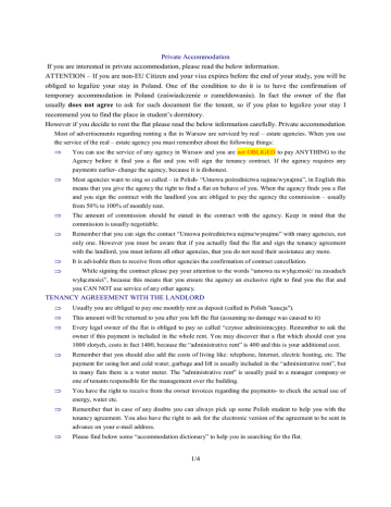 Private Accommodation If you are interested in private accommodation, please read the below information. ATTENTION – If you are non-EU Citizen and your visa expires before the end of your study, you will be obliged to legalize your stay in Poland. One of the condition to do it is to have the confirmation of temporary accommodation in Poland (zaświadczenie o zameldowaniu). In fact the owner of the flat usually does not agree to ask for such document for the tenant, so if you plan to legalize your stay I recommend you to find the place in student’s dormitory. However if you decide to rent the flat please read the below information carefully. Private accommodation Most of advertisements regarding renting a flat in Warsaw are serviced by real – estate agencies. When you use the service of the real – estate agency you must remember about the following things: You can use the service of any agency in Warsaw and you are not OBLIGED to pay ANYTHING to the Agency before it find you a flat and you will sign the tenancy contract. If the agency requires any payments earlier- change the agency, because it is dishonest. Most agencies want to sing so called – in Polish- “Umowa pośrednictwa najmu/wynajmu”, in English this means that you give the agency the right to find a flat on behave of you. When the agency finds you a flat and you sign the contract with the landlord you are obliged to pay the agency the commission – usually from 50% to 100% of monthly rent. The amount of commission should be stated in the contract with the agency. Keep in mind that the commission is usually negotiable. Remember that you can sign the contact “Umowa pośrednictwa najmu/wynajmu” with many agencies, not only one. However you must be aware that if you actually find the flat and sign the tenancy agreement with the landlord, you must inform all other agencies, that you do not need their assistance any more. It is advisable then to receive from other agencies the confirmation of contract cancellation. While signing the contract please pay your attention to the words “umowa na wyłączność/ na zasadach wyłączności”, becasue this means that you ensure the agency an exclusive right to find you the flat and you CAN NOT use service of any other agency. TENANCY AGREEEMENT WITH THE LANDLORD Usually you are obliged to pay one monthly rent as deposit (called in Polish "kaucja"). Every legal owner of the flat is obliged to pay so called “czynsz administracyjny. Remember to ask the owner if this payment is included in the whole rent. You may discover that a flat which should cost you 1000 zlotych, costs in fact 1400, because the “administrative rent” is 400 and this is your additional cost. Remember that you should also add the costs of living like: telephone, Internet, electric heating, etc. The payment for using hot and cold water, garbage and lift is usually included in the “administrative rent”, but in many flats there is a water meter. The "administrative rent" is usually paid to a manager company or one of tenants responsible for the management over the building. You have the right to receive from the owner invoices regarding the payments- to check the actual use of energy, water etc. Remember that in case of any doubts you can always pick up some Polish student to help you with the tenancy agreement. You also have the right to ask for the electronic version of the agreement to be sent in advance on your e-mail address. Please find below some “accommodation dictionary” to help you in searching for the flat. This amount will be returned to you after you left the flat (assuming no damage was caused to it) 1/4 Polish English Comments Typ nieruchomości Type of property/ real estate The information if the property is flat, house, room etc. Typ transakcji Type of transaction Usually you have to types- sell or rent Lokalizacja Location Where the property is situated Powierzchnia lokalu floorage of the premises How big is the property Cena Price Usually monthly rent (be careful if the rent includes the “administrative rent”- see more above) Sprzedaż Sale Wynajem Hire, lease , rental Rynek pierwotny Primary market New buildings Rynek wtórny Secondary market Old building, usually from 60’s, 70’s or 80’s Mieszkanie/ mieszkania Flat/ flats Pokój/ pokoje Room/ rooms Warszawa Warsaw Dzielnica w Warszawie District in Warsaw Śródmieście or Centrum Center of Warsaw Very good district, usually very near the WUT, however usually quite expensive Ursynów Good district because of access to the underground Mokotów Good district because of access to the underground Ochota Not far from the centre Praga Północ Not far from the centre Praga Południe Not far from the centre Bemowo Quite far from the centre Białołęka Quite far from the centre Rembertów Quite far from the centre Targówek Quite far from the centre Ursus Quite far from the centre Wawer Quite far from the centre Wesoła Quite far from the centre Wilanów Quite far from the centre Włochy Quite far from the centre Wola Quite far from the centre Czynsz Rent Remember that the real rent for the flat may be higher because of “administrative rent”, which is paid by every flat owner. See the detailed information above. 2/4 Polish English Comments Winda Lift/ Elevator Słowo kluczowe Key word Pokaż tylko oferty ze zdjęciami Show only the advertisements/ offers with photos Oferty agencji Advertisements/ Offers from real Remember that the real-estate agency takes the commission –estate agency for their service (usually 50-100%) of the monthly rent Oferty bezpośrednie Direct offers/ advertisements Offers directly from the owner without the real estate agency Sortuj według Sort out according to Wyszukiwanie zaawansowane Advanced searching Ceny za całość Price for the whole Jakości ofert Quality of offers Ulicy / ulica/ ulice Street / streets Liczby pokoi The number of rooms Piętro/ piętra The floor / floors Data/ daty T