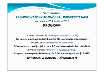 Seminarium ZRÓWNOWAŻONY ROZWÓJ NA UNIWERSYTETACH Warszawa, 25 kwietnia 2016 PROGRAM Dr Anna Kalinowska (Uniwersytet Warszawski UCBS) Czy na uczelniach wyższych jest miejsce dla zrównoważonego rozwoju? Dr Jordi Serra ( Universitat de Barcelona) Zrównoważony rozwój - „jak to się robi” na Uniwersytecie Barcelońskim? Dr Anna Batorczak (Uniwersytet Warszawski UCBS) Program Uniwersyteccy Edukatorzy dla Zrównoważonego Rozwoju EU4SD DYSKUSJA-WYMIANA DOŚWIADCZEŃ Anna Kalinowska Uniwersytet Warszawski, Uniwersyteckie Centrum Badań nad Środowiskiem Przyrodniczym i Zrównoważonym Rozwojem, Historia współpracy uczelni wyższych w dziedzinie zrównoważonego rozwoju 1993 European University Associacion - inicjatywa COPERNICUS CAMPUS dla zrównoważonego rozwoju 2007 COPERNICUS Alliance- Europejska Sieć uczelni promujących transformację edukacji wyższej w kierunku ZR 2012 Konferencja ONZ „Rio +20”-Światowa inicjatywa The People’s Sustainability Treaty on Higher Education –razem z COPERNICUS Alliance 2014- UNEP-The Global University Partnership for Environment and Sustainability (GUPES) 2015 UNESCO -Forum Młodzieży dla Zrównoważonego Rozwoju • Europejska sieć instytucji szkolnictwa wyższego dla wspierania zrównoważonego rozwoju W 2014 r. Uniwersytet Warszawski przystąpił do Europejskiej Sieci Uniwersytetów na rzecz Zrównoważonego Rozwoju: Copernicus Alliance. Globalne Partnerstwo Uniwersytetów na rzecz Środowiska i Zrównoważonego Rozwoju (The Global Universities Partnership on Environment for Sustainability - GUPES) Jeden z flagowy programów UNEP. Powstała w 2014 r. sieć zrzesza obecnie ponad 520 uniwersytetów z całego świata. Celem jest włączanie zagadnień ochrony środowiska i ZR do programów nauczania i badań na wyższych uczelniach i zarządzania uczelniami zgodnie z zasadami ZR. Uczestniczenie w sieci GUPES umożliwia nawiązywanie kontaktów, wymianę doświadczeń oraz podejmowanie wspólnych projektów badawczych i edukacyjnych, umożliwia korzystania z raportów i materiałów np. przewodnik jak „zazielenić” campus , aby spełniał wymogi ZR. Greening Universities. Toolkit trnasforming universities into green and sustainable campus GUPES http://unep.org/training/docs/Greening_Universities_Toolkit.pdf DYDAKTYKA Oferta dydaktyczna sprzyjająca rozwojowi studentów: w zakresie kompetencji ważnych w warunkach gospodarki opartej na wiedzy i kompetencjach społecznych tworzenie oferty dydaktycznej dla studentów jako przyszłych liderów gospodarczych i społecznych: przedmiot: zrównoważony rozwój, wiedza o społecznej odpowiedzialności i różnych aspektach CSR umiejętność stosowania procedur dla uzyskiwania certyfikatów i przygotowania wskaźników np. EMAS. ODDZIAŁYWANIE NA ŚRODOWISKO Zarządzanie środowiskowe: System gospodarki odpadami Oszczędność wody , energii, termomodernizacja Włączenie studentów w proces zarządzania środowiskowego na uczelni Edukacja społeczna w dziedzinie ekologii Angażowanie się społeczności akademickiej w ochronę środowiska ( wolontariat pracowniczy i studencki) UCZELNIA JAKO MIEJSCE PRACY Edukacja i rozwój pracowników: min rozwijanie kompetencji związanej z nauczaniem w duchu zrównoważonego rozwoju Edukacja ekologiczna, kształtowanie postaw proekologicznych, wzorców konsumpcji EMAS jako dobrowolne zobowiązanie do oceny wpływu uczelni na środowisk Eco Management and Audit Scheme Włączenie pracowników i studentów w proces poprawy efektów działalności proekologicznej Informowanie społeczności akademickiej i opinii publicznej Budowanie miedzynarodowego prestiżu uczelni Czy potrzebna jest strategia ZR uczelni? Wzmocnienie kierunków rozwoju działalności uczelni której priorytetem jest zarządzanie oparte na zasadach społecznej odpowiedzialności i zasadach zrównoważonego rozwoju w zakresie prowadzenia edukacji, badań naukowych, dbałości o środowisko, odpowiedzialnej współpracy z otoczeniem zewnętrznym, a także działań jako pracodawcy na rzecz rozwoju swoich pracowników. Zasady te powinny być uwzględnione w strategiach uczelni a ich stosowanie powinno przynieść korzyści zarówno uczelni jak i społeczeństwu. KTO MA ODEGRAĆ KLUCZOWĄ ROLĘ W POPULARYZACJI I REALIZACJI ZASAD ZRÓWNOWAZONEGO ROZWOJU JEŚLI NIE MY TO KTO? Uniwersyteckie Centrum Badań nad Środowiskiem Przyrodniczym i Zrównoważonym Rozwojem Powołane w 1989 r. jako Uniwersyteckie Centrum Badań nad Środowiskiem Przyrodniczym od czerwca 2013 ma rozszerzoną nazwę. „ i ZR”. 21 lat ogólnouniwersyteckich wykładów interdyscyplinarnych „Wybrane zagadnienia z ekologii i ochrony środowiska” od 6 lat pod hasłem „Rozwój zrównoważony w teorii i praktyce” . Średnio ok. 120 słuchaczy. Co roku inny temat wiodący np. zmiany klimatu, różnorodność biologiczna, 2013/2014- „Miasto idealne- miasto zrównoważone” oraz cykl wykładów prezentujących osiągnięcia absolwentów MSOŚ . Tematy prac licencjackich i dyplomowych MSOŚ związane z edukacją i świadomością w zakresie ZR. Publikacje dotyczące ZR, współpraca z NGO, biznesem, administracją Wspieranie EZR dla środowisk poza-akademickich Szkolenia nauczycieli: Otwarte wykłady- współpraca z Mazowieckim Centrum Doskonalenia Nauczycieli Na zlecenie Ministerstwa Środowiska przygotowanie i przeprowadzenie ogólnopolskiego szkolenia „Edukacja dla zrównoważonego rozwoju w szkołach ponadgimnazjalnych”. Przygotowanie na strony MŚ kursu internetowego „Jak uczyć o zrównoważonym rozwoju”. Szkolenia dla nauczycieli gimnazjalnych -EU Comenius Zrównoważony rozwój na uczelni to, proszę wierzyć, nic strasznego… Rola uczelni wyższych we wdrażaniu zasad ZR w kształceniu i praktyce funkcjonowania uczelni Wykłady dla wszystkich studentów i tematy prac dyplomowych związane z różnymi aspektami ZR Odpowiednie publikacje i strony internetowe. Interdyscyplinarność-korzystanie z zasobów
