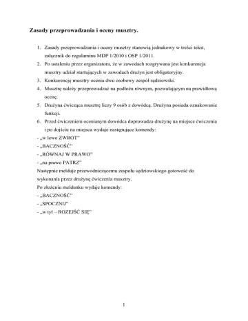Zasady przeprowadzania i oceny musztry. 1. Zasady przeprowadzania i oceny musztry stanowią jednakowy w treści tekst, załącznik do regulaminu MDP 1/2010 i OSP 1/2011. 2. Po ustaleniu przez organizatora, że w zawodach rozgrywana jest konkurencja musztry udział startujących w zawodach drużyn jest obligatoryjny. 3. Konkurencję musztry ocenia dwu osobowy zespół sędziowski. 4. Musztrę należy przeprowadzać na podłożu równym, pozwalającym na prawidłową ocenę. 5. Drużyna ćwicząca musztrę liczy 9 osób z dowódcą. Drużyna posiada oznakowanie funkcji. 6. Przed ćwiczeniem ocenianym dowódca doprowadza drużynę na miejsce ćwiczenia i po dojściu na miejsca wydaje następujące komendy: - „w lewo ZWROT” - „BACZNOŚĆ” - „RÓWNAJ W PRAWO” - „na prawo PATRZ” Następnie melduje przewodniczącemu zespołu sędziowskiego gotowość do wykonania przez drużynę ćwiczenia musztry. Po złożeniu meldunku wydaje komendy: - „BACZNOŚĆ” - „SPOCZNIJ” - „w tył – ROZEJŚĆ SIĘ” 1 7. Podstawowe OCENIANE ĆWICZENIE to wydawane z pamięci i wykonywane przez drużynę następujące komendy: - „drużyna w szeregu – ZBIÓRKA” - „BACZNOŚĆ” - „równaj – W PRAWO” - „SPOCZNIJ” - „kolejno – ODLICZ” - „w prawo – ZWROT” - „w tył – ZWROT” (przez lewe ramię) - „w lewo – ZWROT” - „w tył – ZWROT” (przez lewe ramię) - „do dwóch – ODLICZ” - „w dwójki w prawo ZWROT”. Dowódca stojąc na czele drużyny wydaje komendę: - „za mną MARSZ”. Po tej komendzie kończy się ocenianie ćwiczenia. Przed ćwiczeniem drużyna otrzymuje 20 pkt. dodatnich. Suma punktów podlega sędziowskiemu umniejszaniu za: - błędnie wydaną komendę – 2 pkt. - błędne wykonanie komendy – za każdy przypadek i każdego ćwiczącego 1pkt. Na zakończenie ćwiczenia dowódca prowadzi drużynę przed pozorowaną trybuną (przewodniczący zespołu sędziowskiego). Przemarsz częściowo wykonywany jest krokiem defiladowym zgodnie z wydawanymi komendami: - „drużyna – BACZNOŚĆ” (dowódca odwraca głowę przez lewe ramię) - „na prawo – PATRZ” (dowódca salutuje). Kiedy cała drużyna przejdzie 5 kroków za odbierającego defiladę sędziego dowódca przestaje salutować i wydaje komendę: - „BACZNOŚĆ” (dowódca odwraca głowę przez lewe ramię) - „SPOCZNIJ”. Drużyna w szyku marszowym opuszcza plac ćwiczeń. Dowódca drużyny może zapoznać się z oceną sędziowską. 2 8. Szkic placu ćwiczenia musztry Uwaga: podczas defilady kierunkowy (pierwszy z prawej ) nie zwraca głowy ku sędziemu). 9. Tabela oceny musztry Popełnione błędy do oceny podstawowej 1 2 3 4 5 6 7 8 9 Punkty Punkty Wynik ujemne 20 Ocena pomocnicza 1÷5 S1…………………… S2 ………………………………. Wyjaśnienia do tabeli W zależności od ustaleń wypełniamy wszystkie rubryki lub tylko oceny całości. Dla regulaminu OSP – 1/2011 patrz regulamin pkt. 3.3 tabela 1- dowódca drużyny 2- Przodownik Roty I 3- Pomocnik przodownika Roty I 4- Przodownik Roty II 5- Pomocnik przodownika Roty II 6- Rozdzielaczowy 7- Łącznik 8- Mechanik (w grupie C – kobieta) 9- Rezerwowy Uwaga: Umieszczony na jednej stronie pkt. 8 i 9 z wyjaśnieniami jest kartą oceny musztry. 3