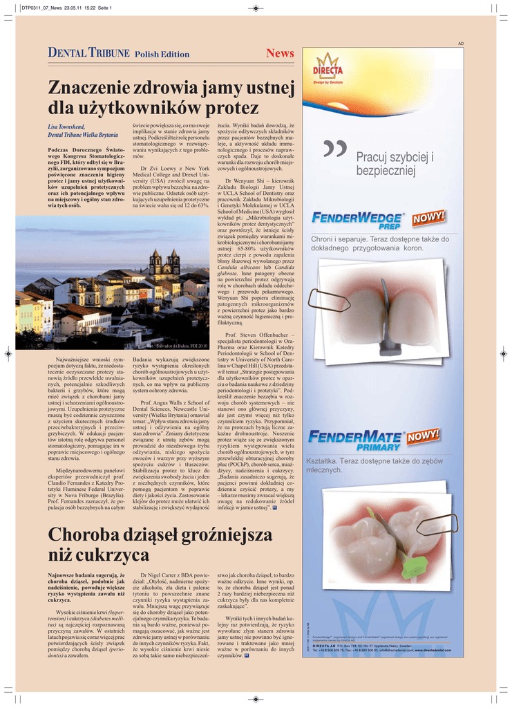 DTP0311_07_News 23.05.11 15:22 Seite 1 AD DENTAL TRIBUNE Polish Edition News Znaczenie zdrowia jamy ustnej dla użytkowników protez Lisa Townshend, Dental Tribune Wielka Brytania Podczas Dorocznego Światowego Kongresu Stomatologicznego FDI, który odbył się w Brazylii, zorganizowano sympozjum poświęcone znaczeniu higieny protez i jamy ustnej użytkowników uzupełnień protetycznych oraz ich potencjalnego wpływu na miejscowy i ogólny stan zdrowia tych osób. Najważniejsze wnioski sympozjum dotyczą faktu, że niedostatecznie oczyszczane protezy stanowią źródło przewlekle uwalnianych, potencjalnie szkodliwych bakterii i grzybów, które mogą mieć związek z chorobami jamy ustnej i schorzeniami ogólnoustrojowymi. Uzupełnienia protetyczne muszą być codziennie czyszczone z użyciem skutecznych środków przeciwbakteryjnych i przeciwgrzybiczych. W edukacji pacjentów istotną rolę odgrywa personel stomatologiczny, pomagając im w poprawie miejscowego i ogólnego stanu zdrowia. Międzynarodowemu panelowi ekspertów przewodniczył prof. Claudio Fernandes z Katedry Protetyki Fluminese Federal University w Nova Friburgo (Brazylia). Prof. Fernandes zaznaczył, że populacja osób bezzębnych na całym świecie powiększa się, co ma swoje implikacje w stanie zdrowia jamy ustnej. Podkreślił też rolę personelu stomatologicznego w rozwiązywaniu wynikających z tego problemów. Dr Zvi Loewy z New York Medical College and Drexel University (USA) zwrócił uwagę na problem wpływu bezzębia na zdrowie publiczne. Odsetek osób użytkujących uzupełnienia protetyczne na świecie waha się od 12 do 63%. Badania wykazują zwiększone ryzyko wystąpienia określonych chorób ogólnoustrojowych u użytkowników uzupełnień protetycznych, co ma wpływ na publiczny system ochrony zdrowia. Prof. Angus Walls z School of Dental Sciences, Newcastle University (Wielka Brytania) omawiał temat: „Wpływ stanu zdrowia jamy ustnej i odżywienia na ogólny stan zdrowia”. Zmiany dietetyczne związane z utratą zębów mogą prowadzić do niezdrowego trybu odżywiania, niskiego spożycia owoców i warzyw przy wyższym spożyciu cukrów i tłuszczów. Stabilizacja protez to klucz do zwiększenia swobody żucia i jeden z niezbędnych czynników, które pomogą pacjentom w poprawie diety i jakości życia. Zastosowanie klejów do protez może ułatwić ich stabilizację i zwiększyć wydajność ” żucia. Wyniki badań dowodzą, że spożycie odżywczych składników przez pacjentów bezzębnych maleje, a aktywność układu immunologicznego i procesów naprawczych spada. Daje to doskonałe warunki dla rozwoju chorób miejscowych i ogólnoustrojowych. Dr Wenyuan Shi – kierownik Zakładu Biologii Jamy Ustnej w UCLA School of Dentistry oraz pracownik Zakładu Mikrobiologii i Genetyki Molekularnej w UCLA School of Medicine (USA) wygłosił wykład pt.: „Mikrobiologia użytkowników protez dentystycznych” oraz powtórzył, że istnieje ścisły związek pomiędzy warunkami mikrobiologicznymi i chorobami jamy ustnej: 65-80% użytkowników protez cierpi z powodu zapalenia błony śluzowej wywołanego przez Candida albicans lub Candida glabrata. Inne patogeny obecne na powierzchni protez odgrywają rolę w chorobach układu oddechowego i przewodu pokarmowego. Wenyuan Shi popiera eliminację patogennych mikroorganizmów z powierzchni protez jako bardzo ważną czynność higieniczną i profilaktyczną. Prof. Steven Offenbacher – specjalista periodontologii w OraPharma oraz Kierownik Katedry Periodontologii w School of Dentistry w University of North Carolina w Chapel Hill (USA) przedstawił temat „Strategie postępowania dla użytkowników protez w oparciu o badania naukowe z dziedziny periodontologii i protetyki”. Podkreślił znaczenie bezzębia w rozwoju chorób systemowych – nie stanowi ono głównej przyczyny, ale jest czymś więcej niż tylko czynnikiem ryzyka. Przypomniał, że na protezach bytują liczne zakaźne drobnoustroje. Noszenie protez wiąże się ze zwiększonym ryzykiem występowania wielu chorób ogólnoustrojowych, w tym przewlekłej obturacyjnej choroby płuc (POChP), chorób serca, miażdżycy, nadciśnienia i cukrzycy. „Badania zasadniczo sugerują, że pacjenci powinni dokładniej codziennie czyścić protezy, a my – lekarze musimy zwracać większą uwagę na redukowanie źródeł infekcji w jamie ustnej”. DT Pracuj szybciej i bezpieczniej ! NOWY &KURQLLVHSDUXMH7HUD]GRVWĊSQHWDNĪHGR GRNáDGQHJRSU]\JRWRZDQLDNRURQ. ! NOWY .V]WDáWND THUD]GRVWĊSQHWDNĪHGR]ĊEyZ POHF]Q\FK Choroba dziąseł groźniejsza niż cukrzyca Wysokie ciśnienie krwi (hypertension) i cukrzyca (diabetes mellitus) są najczęściej rozpoznawaną przyczyną zawałów. W ostatnich latach pojawia się coraz więcej prac potwierdzających ścisły związek pomiędzy chorobą dziąseł (periodontis) a zawałem. Dr Nigel Carter z BDA powiedział: „Otyłość, nadmierne spożycie alkoholu, zła dieta i palenie tytoniu to powszechnie znane czynniki ryzyka wystąpienia zawału. Mniejszą wagę przywiązuje się do choroby dziąseł jako potencjalnego czynnika ryzyka. Te badania są bardo ważne, ponieważ pomagają oszacować, jak ważne jest zdrowie jamy ustnej w porównaniu do innych czynników ryzyka. Fakt, że wysokie ciśnienie krwi niesie za sobą takie samo niebezpieczeń- stwo jak choroba dziąseł, to bardzo ważne odkrycie. Inne wyniki, np. to, że choroba dziąseł jest ponad 2 razy bardziej niebezpieczna niż cukrzyca były dla nas kompletnie zaskakujące”. Wyniki tych i innych badań kolejny raz potwierdzają, że ryzyko wywołane złym stanem zdrowia jamy ustnej nie powinno być ignorowane i traktowane jako mniej ważne w porównaniu do innych czynników. DT 3331-1102 © Directa AB Najnowsze badania sugerują, że choroba dziąseł, podobnie jak nadciśnienie, powoduje większe ryzyko wystąpienia zawału niż cukrzyca. FenderWedge® (registered design) and FenderMate® (regis