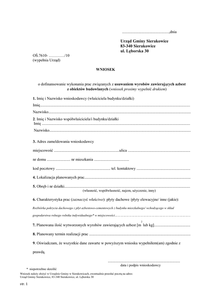 ................................................,dnia Urząd Gminy Sierakowice 83-340 Sierakowice ul. Lęborska 30 OŚ.7610- …………/10 (wypełnia Urząd) WNIOSEK o dofinansowanie wykonania prac związanych z usuwaniem wyrobów zawierających azbest z obiektów budowlanych (wniosek prosimy wypełnić drukiem) 1. Imię i Nazwisko wnioskodawcy (właściciela budynku/działki) Imię.......................................................................................................................................................... Nazwisko.................................................................................................................................................. 2. Imię i Nazwisko współwłaściciela/i budynku/działki Imię ........................................................................................................................................................ Nazwisko................................................................................................................................................. 3. Adres zameldowania wnioskodawcy miejscowość ...................................................................ulica ................................................................ nr domu ........................ nr mieszkania .................................... kod pocztowy ........................................................ tel. kontaktowy ....................................................... 4. Lokalizacja planowanych prac............................................................................................................. 5. Obręb i nr działki................................................................................................................................. (własność, współwłasność, najem, uŜyczenie, inny) 6. Charakterystyka prac (zaznaczyć właściwe): płyty dachowe /płyty elewacyjne/ inne (jakie): Rozbiórka pokrycia dachowego z płyt azbestowo-cementowych z budynku mieszkalnego/ wchodzącego w skład gospodarstwa rolnego rolnika indywidualnego* w miejscowości………………………………………...…………………………... 2 7. Planowana ilość wytworzonych wyrobów zawierających azbest [m lub kg]..................................... 8. Planowany termin realizacji prac ........................................................................................................ 9. Oświadczam, Ŝe wszystkie dane zawarte w powyŜszym wniosku wypełniłem(am) zgodnie z prawdą. .......................................................................... data i podpis wnioskodawcy * niepotrzebne skreślić Wniosek naleŜy złoŜyć w Urzędzie Gminy w Sierakowicach, ewentualnie przesłać pocztą na adres: Urząd Gminy Sierakowice, 83-340 Sierakowice, ul. Lęborska 30 str. 1 WNIOSEK DO WÓJTA GMINY SIERAKOWICE O PRZYZNANIE DOFINANSOWANIA NA 2010. ROK W RAMACH REALIZACJI „PROGRAMU USUWANIA WYROBÓW ZAWIERAJĄCYCH AZBEST DLA GMINY SIERAKOWICE NA LATA 2009 – 2018” I. NAZWA ZADANIA: Rozbiórka pokrycia dachowego z płyt azbestowo-cementowych z budynku mieszkalnego/ wchodzącego w skład gospodarstwa rolnego rolnika indywidualnego* w miejscowości………….………………………...……………………………………………..…… II. WNIOSKODAWCA 1. Imię 2. Nazwisko 3. Adres zamieszkania /Ulica i numer domu/ /Kod Pocztowy/ 4. NIP /Miejscowość/ 5. PESEL - - 6. Seria i numer Dowodu Osobistego 7. Telefon 8. Adres e-mail 9. Urząd Skarbowy właściwy dla wnioskodawcy ........................................................................................................................................................ /Ulica i numer domu/ /Kod Pocztowy/ /Miasto/ 10.Wypłata środków - przelew na konto Właściciel Konta Bankowego........................................................................................................ Nazwa banku:.............................................................................................................................. Numer konta: III. CHARAKTERYSTYKA ZADANIA Opis zadania: Rozbiórka pokrycia dachowego z płyt azbestowo-cementowych z budynku mieszkalnego/ wchodzącego w skład gospodarstwa rolnego rolnika indywidualnego* w miejscowości......................................................................................................................................... Data rozpoczęcia zadania:.............................. /adres nieruchomości, której dotacja dotyczy; charakter prac/ Data planowanego zakończenia zadania:.................................. Koszt całkowity zadania brutto ……………………………/zł/ środki własne:………………../zł/ wnioskowana kwota dotacji:………………./zł/ Gdańsk, dnia:…………………….. inne źródła finansowania:………………./zł/ Sierakowice, dnia ....................................... ............................. czytelny podpis wnioskodawcy:……................................ Wykaz wymaganych załączników 1. kopia dokumentu potwierdzającego tytuł prawny do nieruchomości 2. ocena stanu i moŜliwości bezpiecznego uŜytkowania wyrobów zawierających azbest – druk w załączeniu str. 2 opinia Urzędu Gminy Sierakowice Wniosek spełnia wymogi przepisów z zakresu ochrony środowiska TAK NIE Wniosek spełnia wymogi pod względem zgodności z „Programem usuwania wyrobów zawierających azbest dla Gminy Sierakowice na lata 2009 – 2018” TAK NIE ........................................................................................................................................................... ........................................................................................................................................................... ........................................................................................................................................................... Opiniow