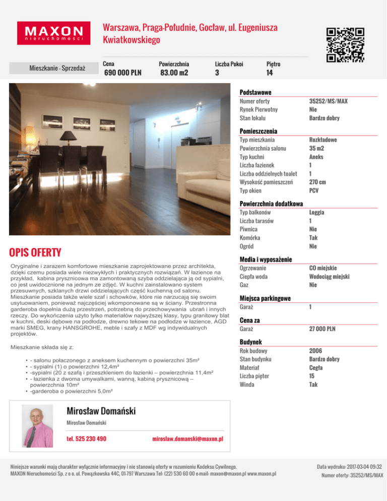 Warszawa, Praga-Południe, Gocław, ul. Eugeniusza Kwiatkowskiego Mieszkanie - Sprzedaż Cena 690 000 PLN Powierzchnia 83.00 m2 Liczba Pokoi 3 Piętro 14 Podstawowe Numer oferty 35252/MS/MAX Rynek Pierwotny Nie Stan lokalu Bardzo dobry Pomieszczenia Typ mieszkania Rozkładowe Powierzchnia salonu 35 m2 Typ kuchni Aneks Liczba łazienek 1 Liczba oddzielnych toalet 1 Wysokość pomieszczeń 270 cm Typ okien PCV Powierzchnia dodatkowa OPIS OFERTY Oryginalne i zarazem komfortowe mieszkanie zaprojektowane przez architekta, dzięki czemu posiada wiele niezwykłych i praktycznych rozwiązań. W łazience na przykład, kabina prysznicowa ma zamontowaną szyba oddzielająca ją od sypialni, co jest uwidocznione na jednym ze zdjęć. W kuchni zainstalowano system przesuwnych, szklanych drzwi oddzielających część kuchenną od salonu. Mieszkanie posiada także wiele szaf i schowków, które nie narzucają się swoim usytuowaniem, ponieważ najczęściej wkomponowane są w ściany. Przestronna garderoba dopełnia dużą przestrzeń, potrzebną do przechowywania ubrań i innych rzeczy. Do wykończenia użyto tylko materiałów najwyższej klasy, typu granitowy blat w kuchni, deski dębowe na podłodze, drewno tekowe na podłodze w łazience, AGD marki SMEG, krany HANSGROHE, meble i szafy z MDF wg indywidualnych projektów. Typ balkonów Loggia Liczba tarasów 1 Piwnica Nie Komórka Tak Ogród Nie Media i wyposażenie Ogrzewanie CO miejskie Ciepła woda Wodociąg miejski Gaz Nie Miejsca parkingowe Garaż 1 Cena za Garaż 27 000 PLN Budynek Mieszkanie składa się z: • • • • - salonu połaczonego z aneksem kuchennym o powierzchni 35m² - sypialni (1) o powierzchni 12,4m² -sypialni (20 z szafą i przeszkleniem do łazienki – powierzchnia 11,4m² - łazienka z dwoma umywalkami, wanną, kabiną prysznicową – powierzchnia 10m² • -garderoba o powierzchni 5,0m² Rok budowy 2006 Stan budynku Bardzo dobry Materiał Cegła Liczba pięter 15 Winda Tak Mirosław Domański Mirosław Domański tel. 525 230 490 [email protected] Niniejsze warunki mają charakter wyłącznie informacyjny i nie stanowią oferty w rozumieniu Kodeksu Cywilnego. MAXON Nieruchomości Sp. z o o. ul. Powązkowska 44C, 01-797 Warszawa Tel: (22) 530 60 00 e-mail: [email protected] www.maxon.pl Data wydruku: 2017-03-04 09:32 Numer oferty: 35252/MS/MAX