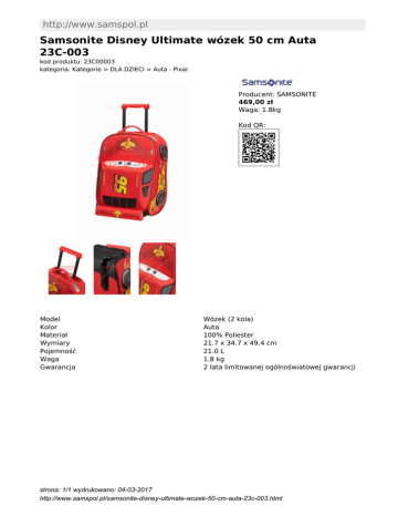 http://www.samspol.pl Samsonite Disney Ultimate wózek 50 cm Auta 23C-003 kod produktu: 23C00003 kategoria: Kategorie > DLA DZIECI > Auta - Pixar Producent: SAMSONITE 469,00 zł Waga: 1.8kg Kod QR: Model Kolor Materiał Wymiary Pojemność Waga Gwarancja Wózek (2 kola) Auta 100% Poliester 21.7 x 34.7 x 49.4 cm 21.0 L 1.8 kg 2 lata limitowanej ogólnoświatowej gwarancji strona: 1/1 wydrukowano: 04-03-2017 http://www.samspol.pl/samsonite-disney-ultimate-wozek-50-cm-auta-23c-003.html