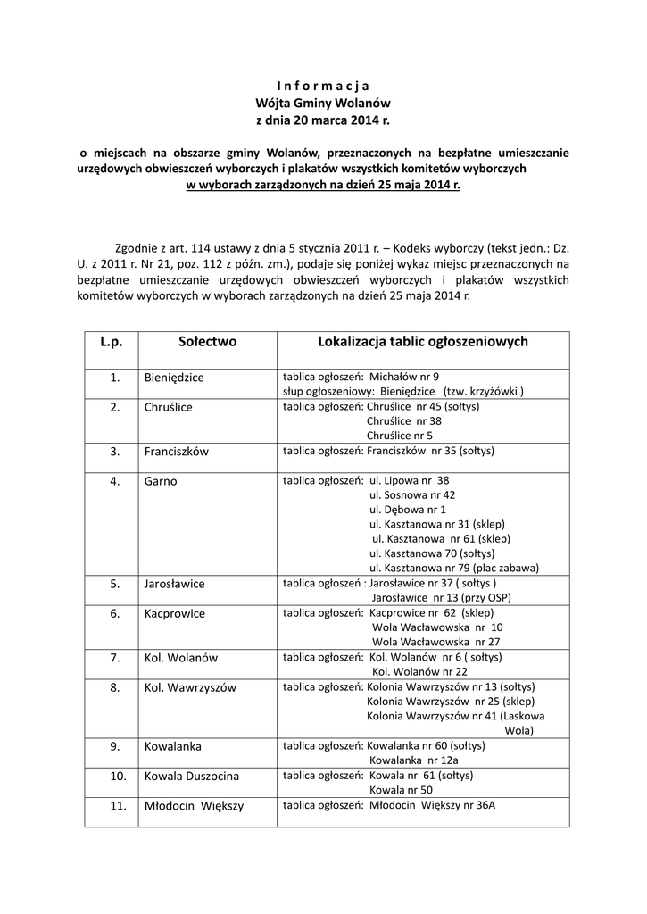 Informacja Wójta Gminy Wolanów z dnia 20 marca 2014 r. o miejscach na obszarze gminy Wolanów, przeznaczonych na bezpłatne umieszczanie urzędowych obwieszczeń wyborczych i plakatów wszystkich komitetów wyborczych w wyborach zarządzonych na dzień 25 maja 2014 r. Zgodnie z art. 114 ustawy z dnia 5 stycznia 2011 r. – Kodeks wyborczy (tekst jedn.: Dz. U. z 2011 r. Nr 21, poz. 112 z późn. zm.), podaje się poniżej wykaz miejsc przeznaczonych na bezpłatne umieszczanie urzędowych obwieszczeń wyborczych i plakatów wszystkich komitetów wyborczych w wyborach zarządzonych na dzień 25 maja 2014 r. L.p. Sołectwo 1. Bieniędzice 2. Chruślice 3. Franciszków 4. Garno 5. Jarosławice 6. Kacprowice 7. Kol. Wolanów 8. Kol. Wawrzyszów 9. Kowalanka 10. Kowala Duszocina 11. Młodocin Większy Lokalizacja tablic ogłoszeniowych tablica ogłoszeń: Michałów nr 9 słup ogłoszeniowy: Bieniędzice (tzw. krzyżówki ) tablica ogłoszeń: Chruślice nr 45 (sołtys) Chruślice nr 38 Chruślice nr 5 tablica ogłoszeń: Franciszków nr 35 (sołtys) tablica ogłoszeń: ul. Lipowa nr 38 ul. Sosnowa nr 42 ul. Dębowa nr 1 ul. Kasztanowa nr 31 (sklep) ul. Kasztanowa nr 61 (sklep) ul. Kasztanowa 70 (sołtys) ul. Kasztanowa nr 79 (plac zabawa) tablica ogłoszeń : Jarosławice nr 37 ( sołtys ) Jarosławice nr 13 (przy OSP) tablica ogłoszeń: Kacprowice nr 62 (sklep) Wola Wacławowska nr 10 Wola Wacławowska nr 27 tablica ogłoszeń: Kol. Wolanów nr 6 ( sołtys) Kol. Wolanów nr 22 tablica ogłoszeń: Kolonia Wawrzyszów nr 13 (sołtys) Kolonia Wawrzyszów nr 25 (sklep) Kolonia Wawrzyszów nr 41 (Laskowa Wola) tablica ogłoszeń: Kowalanka nr 60 (sołtys) Kowalanka nr 12a tablica ogłoszeń: Kowala nr 61 (sołtys) Kowala nr 50 tablica ogłoszeń: Młodocin Większy nr 36A 12. Mniszek 13. Podlesie tablica ogłoszeń: Mniszek nr 70 ( sołtys) Mniszek nr 101 (szkoła) tablica ogłoszeń: Podlesie nr 30 (sołtys) 14. Rogowa tablica ogłoszeń: Rogowa nr 29 (sołtys) 15. Sławno 16. Strzałków 17. Ślepowron 18. Wacławów tablica ogłoszeń: Sławno nr 40 (przedszkole) Sławno nr 36 (kościół) Sławno nr 49 (szkoła) Sławno nr 78 tablica ogłoszeń: Strzałków nr 46 (przystanek) Strzałków nr 82 (sołtys) Strzałków (zajezdnia autobusów ) Strzałków nr 128 Strzałków nr 167 tablica ogłoszeń: Ślepowron nr 40 (sołtys) Ślepowron nr 2 Ślepowron nr 53 (Janówek) Ślepowron nr 92 (sklep) Ślepowron nr 125 tablica ogłoszeń: Wacławów nr 39B (sołtys) 19. Waliny tablica ogłoszeń: Waliny nr 33 (sołtys) Waliny nr 85 (sklep) 20. Wawrzyszów 21. Wolanów tablica ogłoszeń: Wawrzyszów nr 60 (sołtys ) Wawrzyszów nr 12 (sklep) Wawrzyszów nr 74 (Dzika Niwa) Wawrzyszów nr 79 (Wygon) słup ogłoszeniowy: ul. Rynek 9 (park) 22. Wymysłów 23. Zabłocie tablica ogłoszeń: Wymysłów nr 4 Wymysłów nr 38 Wymysłów nr 60 tablica ogłoszeń: Zabłocie nr 19 A (sołtys) Wójt Gminy Wolanów /-/ Krzysztof Murawski