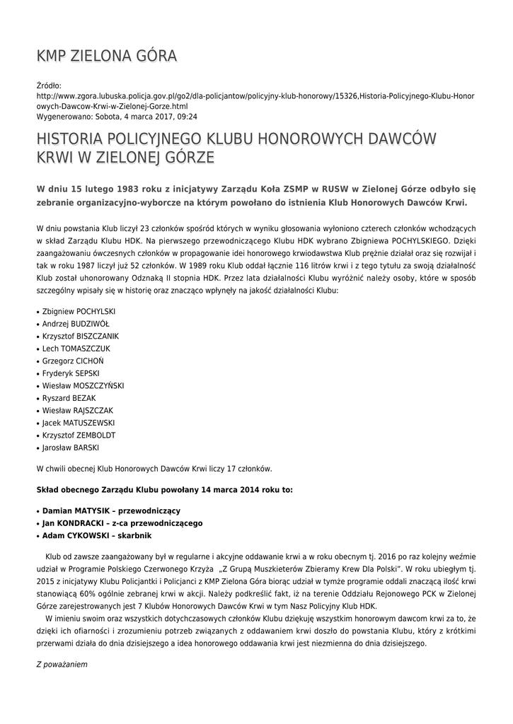 KMP ZIELONA GÓRA Źródło: http://www.zgora.lubuska.policja.gov.pl/go2/dla-policjantow/policyjny-klub-honorowy/15326,Historia-Policyjnego-Klubu-Honor owych-Dawcow-Krwi-w-Zielonej-Gorze.html Wygenerowano: Sobota, 4 marca 2017, 09:24 HISTORIA POLICYJNEGO KLUBU HONOROWYCH DAWCÓW KRWI W ZIELONEJ GÓRZE W dniu 15 lutego 1983 roku z inicjatywy Zarządu Koła ZSMP w RUSW w Zielonej Górze odbyło się zebranie organizacyjno-wyborcze na którym powołano do istnienia Klub Honorowych Dawców Krwi. W dniu powstania Klub liczył 23 członków spośród których w wyniku głosowania wyłoniono czterech członków wchodzących w skład Zarządu Klubu HDK. Na pierwszego przewodniczącego Klubu HDK wybrano Zbigniewa POCHYLSKIEGO. Dzięki zaangażowaniu ówczesnych członków w propagowanie idei honorowego krwiodawstwa Klub prężnie działał oraz się rozwijał i tak w roku 1987 liczył już 52 członków. W 1989 roku Klub oddał łącznie 116 litrów krwi i z tego tytułu za swoją działalność Klub został uhonorowany Odznaką II stopnia HDK. Przez lata działalności Klubu wyróżnić należy osoby, które w sposób szczególny wpisały się w historię oraz znacząco wpłynęły na jakość działalności Klubu: ● Zbigniew POCHYLSKI ● Andrzej BUDZIWÓŁ ● Krzysztof BISZCZANIK ● Lech TOMASZCZUK ● Grzegorz CICHOŃ ● Fryderyk SEPSKI ● Wiesław MOSZCZYŃSKI ● Ryszard BEZAK ● Wiesław RAJSZCZAK ● Jacek MATUSZEWSKI ● Krzysztof ZEMBOLDT ● Jarosław BARSKI W chwili obecnej Klub Honorowych Dawców Krwi liczy 17 członków. Skład obecnego Zarządu Klubu powołany 14 marca 2014 roku to: ● Damian MATYSIK – przewodniczący ● Jan KONDRACKI – z-ca przewodniczącego ● Adam CYKOWSKI – skarbnik Klub od zawsze zaangażowany był w regularne i akcyjne oddawanie krwi a w roku obecnym tj. 2016 po raz kolejny weźmie udział w Programie Polskiego Czerwonego Krzyża „Z Grupą Muszkieterów Zbieramy Krew Dla Polski”. W roku ubiegłym tj. 2015 z inicjatywy Klubu Policjantki i Policjanci z KMP Zielona Góra biorąc udział w tymże programie oddali znaczącą ilość krwi stanowiącą 60% ogólnie zebranej krwi w akcji. Należy podkreślić fakt, iż na terenie Oddziału Rejonowego PCK w Zielonej Górze zarejestrowanych jest 7 Klubów Honorowych Dawców Krwi w tym Nasz Policyjny Klub HDK. W imieniu swoim oraz wszystkich dotychczasowych członków Klubu dziękuję wszystkim honorowym dawcom krwi za to, że dzięki ich ofiarności i zrozumieniu potrzeb związanych z oddawaniem krwi doszło do powstania Klubu, który z krótkimi przerwami działa do dnia dzisiejszego a idea honorowego oddawania krwi jest niezmienna do dnia dzisiejszego. Z poważaniem Przewodniczący Klubu Damian MATYSIK Ocena: 3.4/5 (5) Tweetnij