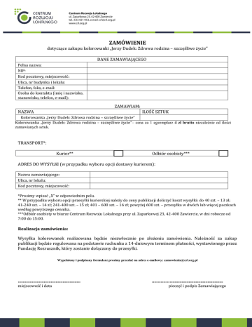 ZAMÓWIENIE dotyczące zakupu kolorowanki „Jerzy Dudek: Zdrowa rodzina – szczęśliwe życie” DANE ZAMAWIAJĄCEGO Pełna nazwa: NIP: Kod pocztowy, miejscowość: Ulica, nr budynku i lokalu: Telefon, faks, e-mail: Osoba do kontaktu (imię i nazwisko, stanowisko, telefon, e-mail): ZAMAWIAM: NAZWA ILOŚĆ SZTUK Kolorowanka „Jerzy Dudek: Zdrowa rodzina – szczęśliwe życie” Kolorowanka „Jerzy Dudek: Zdrowa rodzina – szczęśliwe życie”– cena za 1 egzemplarz 4 zł brutto niezależnie od ilości zamawianych sztuk. TRANSPORT*: Kurier** Odbiór osobisty*** ADRES DO WYSYŁKI (w przypadku wyboru opcji dostawy kurierem): Nazwa zamawiającego: Ulica, nr lokalu: Kod pocztowy, miejscowość: *Prosimy wpisać „X” w odpowiednim polu. ** W przypadku wyboru opcji przesyłki kurierskiej należy do ceny publikacji doliczyć koszt wysyłki: do 40 szt. – 13 zł; 41-240 szt. – 14 zł; 241-400 szt. – 15 zł; 401 – 600 szt. – 16 zł; powyżej 600 szt. – przesyłka w dwóch lub więcej paczkach według powyższego cennika. ***Odbiór osobisty w biurze Centrum Rozwoju Lokalnego przy ul. Zaparkowej 23, 42-400 Zawiercie, w dni robocze od 7:00 do 15:00. Realizacja zamówienia: Wysyłka kolorowanek realizowana będzie niezwłocznie po złożeniu zamówienia. Należność za zakup publikacji będzie regulowana na podstawie rachunku z 14-dniowym terminem płatności, wystawionego przez Fundację Rozrusznik, który zostanie dołączony do przesyłki. Wypełniony i podpisany formularz prosimy przesłać na adres e-mailowy: [email protected] ..................................................... miejscowość i data .....………….......................................... pieczęć i podpis Zamawiającego