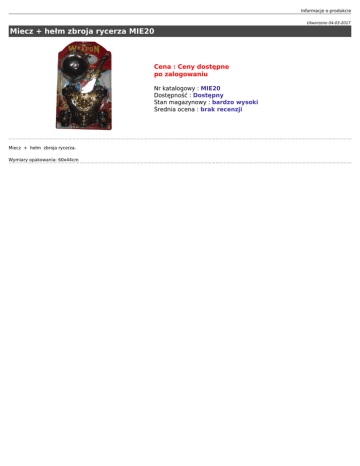 Informacje o produkcie Utworzono 04-03-2017 Miecz + hełm zbroja rycerza MIE20 Cena : Ceny dostępne po zalogowaniu Nr katalogowy : MIE20 Dostępność : Dostępny Stan magazynowy : bardzo wysoki Średnia ocena : brak recenzji Miecz + hełm zbroja rycerza. Wymiary opakowania: 60x44cm