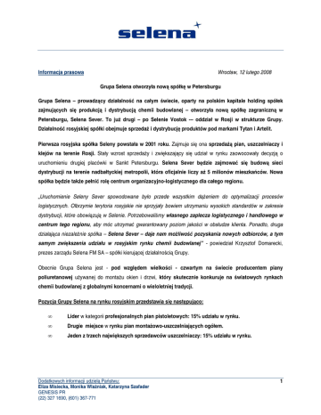 Informacja prasowa Wrocław, 12 lutego 2008 Grupa Selena otworzyła nową spółkę w Petersburgu Grupa Selena – prowadzący działalność na całym świecie, oparty na polskim kapitale holding spółek zajmujących się produkcją i dystrybucją chemii budowlanej – otworzyła nową spółkę zagraniczną w Petersburgu, Selena Sever. To już drugi – po Selenie Vostok -– oddział w Rosji w strukturze Grupy. Działalność rosyjskiej spółki obejmuje sprzedaż i dystrybucję produktów pod markami Tytan i Artelit. Pierwsza rosyjska spółka Seleny powstała w 2001 roku. Zajmuje się ona sprzedażą pian, uszczelniaczy i klejów na terenie Rosji. Stały wzrost sprzedaży i zwiększający się udział w rynku zaowocowały decyzją o uruchomieniu drugiej placówki w Sankt Petersburgu. Selena Sever będzie zajmować się budową sieci dystrybucji na terenie nadbałtyckiej metropolii, która oficjalnie liczy aż 5 milionów mieszkańców. Nowa spółka będzie także pełnić rolę centrum organizacyjno-logistycznego dla całego regionu. „Uruchomienie Seleny Sever spowodowane było przede wszystkim dążeniem do optymalizacji procesów logistycznych. Olbrzymie terytoria rosyjskie nie sprzyjały bowiem utrzymaniu wysokich standardów w zakresie dystrybucji, które obowiązują w Selenie. Potrzebowaliśmy własnego zaplecza logistycznego i handlowego w centrum tego regionu, aby móc utrzymać gwarantowany poziom jakości w obsłudze klienta. Ponadto, druga działająca niezależnie spółka – Selena Sever – daje nam możliwość pozyskania nowych odbiorców, a tym samym zwiększenia udziału w rosyjskim rynku chemii budowlanej” - powiedział Krzysztof Domarecki, prezes zarządu Selena FM SA – spółki kierującej działalnością Grupy. Obecnie Grupa Selena jest - pod względem wielkości - czwartym na świecie producentem piany poliuretanowej używanej do montażu okien i drzwi, który skutecznie konkuruje na światowych rynkach chemii budowlanej z globalnymi koncernami o wieloletniej tradycji. Pozycja Grupy Selena na rynku rosyjskim przedstawia się następująco: • Lider w kategorii profesjonalnych pian pistoletowych: 15% udziału w rynku. • Drugie miejsce w rynku pian montażowo-uszczelniających ogółem. • Jeden z trzech największych sprzedawców uszczelniaczy: 15% udziału w rynku. Dodatkowych informacji udzielą Państwu: Eliza Misiecka, Monika Wlaźniak, Katarzyna Szafader GENESIS PR (22) 327 1690, (601) 367-771 1 Informacje dodatkowe: Grupa Selena to prowadzący działalność na całym świecie, oparty na polskim kapitale holding spółek zajmujących się produkcją i dystrybucją chemii budowlanej. W skład Grupy wchodzi 25 spółek, w tym 17 podmiotów zagranicznych oraz 9 nowoczesnych zakładów produkcyjnych (4 zakłady w Polsce, po jednym we Włoszech, w Brazylii, Korei, Chinach oraz USA). Grupa Selena jest - pod względem wielkości - czwartym na świecie producentem piany poliuretanowej używanej do montażu okien i drzwi. Grupa Selena systematycznie zwiększa sprzedaż eksportową, która w 2006 roku stanowiła 65,5% przychodów. Realizuje zamówienia na rynkach 50 państw, w tym przez własne spółki handlowe zlokalizowane w 15 krajach (Polska, Rosja, Czechy, Finlandia, Kazachstan, Ukraina, Bułgaria, Rumunia, Węgry, Niemcy, Włochy, Brazylia, USA, Korea Płd. i Chiny). Ponadto, Grupa Selena planuje umacnianie pozycji w regionach: Azji Południowo-Wschodniej (Chiny), Bliskiego Wschodu (Turcja i Egipt oraz petrokraje Półwyspu Arabskiego), Ameryki Południowej (Argentyna), Ameryki Północnej (Kanada)oraz dalszą ekspansję na nowe rynki zagraniczne. Grupa Selena oferuje szeroką gamę produktów przeznaczonych zarówno dla profesjonalnych wykonawców, jak i użytkowników indywidualnych - główne marki to TYTAN oraz ARTELIT. Pozycja rynkowa Kluczowym elementem strategii Grupy Selena jest jakość. Pojęcie "przewaga dzięki produktowi" oznacza, że w każdej kategorii produktów Grupa Selena dąży do tego, aby jej wyroby miały najwyższą pozycję jakościową. Taka strategia zapewnia wysoki poziom zaufania klientów do produktów i procentuje w przyznawanych spółce licznych wyróżnieniach. Pozycja Grupy Selena w Polsce: 1. Lider w kategorii pian: 37% udziału w rynku (w ujęciu wartościowym oraz ilościowym). 2. Drugie miejsce w kategorii uszczelniaczy: 19% udziału w rynku. Działalność Grupy Selena obejmuje wszystkie etapy tworzenia produktów: począwszy od zaawansowanych badań, przez produkcję, dystrybucję, marketing, aż po sprzedaż na całym świecie. Na każdym etapie kreowania produktów Selena gwarantuje innowacyjne rozwiązania, które zapewniają utrzymanie najwyższych, światowych standardów, potwierdzonych licznymi nagrodami i międzynarodowymi certyfikatami jakości. Selena jest laureatem wielu prestiżowych nagród, co podkreśla najwyższe standardy funkcjonowania spółki i jakość produktów sprzedawanych na rynkach ponad 50 krajów świata. W 2008 roku otrzymała tytuł „Tego, który zmienia polski przemysł” - przyznawany przez Miesięcznik Gospodarczy „Nowy Przemysł” - za skuteczną ekspansję Dodatkowych informacji udzielą Państwu: Eliza Misiecka, Monika Wlaźniak, Katarzyna Szafader GENESIS PR (22) 327 1690, (601) 367-771 2 zagraniczną, stworzenie najwyższej jakości produktów i wypromowanie marek w branży, w której dominuje silna konkurencja. Nagrody otrzymane w 2007 roku: • prestiżowa nagroda „Gazela Biznesu” - wyróżnienie przyznawane dynamicznie rozwijającym się spółkom krajowym, które notują stabilny wzrost przychodów, a dla swoich klientów są wiarygodnym i rzetelnym partnerem biznesowym, • tytuł Europrodukt dla Uniwersalnej Emulsji Gruntującej Tytan Grunt w ogólnopolskim konkursie pod patronatem Ministerstwa Gospodarki i Polskiej Agencji Rozwoju Przedsiębiorczości, • Nagroda Budowlanej Marki Roku 2006 - przyznaną na Targach Budma 2007, • do portfolio nagró