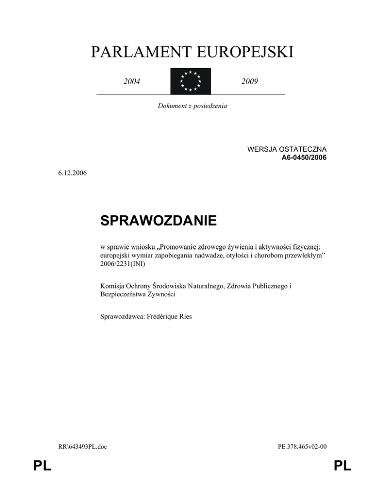 PARLAMENT EUROPEJSKI 2004 2009 Dokument z posiedzenia WERSJA OSTATECZNA A6-0450/2006 6.12.2006 SPRAWOZDANIE w sprawie wniosku „Promowanie zdrowego Ŝywienia i aktywności fizycznej: europejski wymiar zapobiegania nadwadze, otyłości i chorobom przewlekłym” 2006/2231(INI) Komisja Ochrony Środowiska Naturalnego, Zdrowia Publicznego i Bezpieczeństwa śywności Sprawozdawca: Frédérique Ries RR\643493PL.doc PL PE 378.465v02-00 PL PR_INI SPIS TREŚCI Strona PROJEKT REZOLUCJI PARLAMENTU EUROPEJSKIEGO ............................................... 3 UZASADNIENIE .................................................................................................................... 13 OPINIA KOMISJI PRAW KOBIET I RÓWNOUPRAWNIENIA......................................... 18 PROCEDURA.......................................................................................................................... 22 PE 378.465v02-00 PL 2/22 RR\643493PL.doc PROJEKT REZOLUCJI PARLAMENTU EUROPEJSKIEGO w sprawie wniosku „Promowanie zdrowego Ŝywienia i aktywności fizycznej: europejski wymiar zapobiegania nadwadze, otyłości i chorobom przewlekłym” (2006/2231(INI)) Parlament Europejski, – uwzględniając Zieloną Księgę Komisji „Promowanie zdrowego Ŝywienia i aktywności fizycznej: europejski wymiar zapobiegania nadwadze, otyłości i chorobom przewlekłym”(COM(2005)0637), – uwzględniając globalną strategię w sprawie Ŝywienia, aktywności fizycznej i zdrowia przyjętą w maju 2004 r. na 57. Światowym Zgromadzeniu na rzecz Zdrowia, – uwzględniając rezolucję Rady z dnia 14 grudnia 2000 r. w sprawie zdrowia i odŜywiania (2001/C 20 23.01), – uwzględniając konkluzje Rady ds. zatrudnienia, polityki społecznej, zdrowia i konsumentów z dnia 3 czerwca 2005 r., pt. „Otyłość, odŜywianie się i aktywność fizyczna”, – uwzględniając nieformalne spotkanie ministrów sportu UE, które odbyło się w dniach 19 20 września 2005 r., na którym prezydencja brytyjska wysunęła propozycję utworzenia grupy roboczej ds. sportu i zdrowia, – uwzględniając wezwanie naukowców wygłoszone podczas dziesiątego międzynarodowego kongresu w sprawie otyłości (ICO 2006), który odbył się w Sydney w dniach 3-8 września 2006 r., - uwzględniając wnioski konferencji na szczycie Prezydencji Fińskiej, dotyczącej „zdrowia we wszystkich obszarach polityki”, – uwzględniając art. 45 Regulaminu, – uwzględniając sprawozdanie Komisji Ochrony Środowiska Naturalnego, Zdrowia Publicznego i Bezpieczeństwa śywności oraz opinię Komisji Praw Kobiet i Równouprawnienia (A6-0450/2006), A. mając na uwadze, Ŝe ilość osób cierpiących na otyłość w Unii Europejskiej w znaczny sposób wzrosła przez ostatnie trzydzieści lat; oraz mając na uwadze, Ŝe tempo wzrostu tego zjawiska jest porównywalne do sytuacji, jaka miała miejsce w Stanach Zjednoczonych na początku lat dziewięćdziesiątych, a takŜe fakt, Ŝe w Europie prawie 27% męŜczyzn i 38% kobiet zalicza się do osób z nadwagą bądź otyłych, B. mając na uwadze, Ŝe rosnąca powszechna otyłość, zwłaszcza wśród dzieci, nie ogranicza się do krajów UE czy innych krajów bogatych, ale rośnie w sposób dramatyczny w wielu krajach rozwijających się; RR\643493PL.doc 3/22 PE 378.465v02-00 PL C. mając na uwadze, Ŝe otyłość dotyka takŜe ponad pięć milionów dzieci w UE złoŜonej z 25 państw członkowskich oraz Ŝe liczba ta wzrasta w tempie alarmującym, jako Ŝe co roku przybywa blisko 300 000 nowych przypadków, D. mając na uwadze, Ŝe badania wykazały, Ŝe osoby niepełnosprawne są bardziej naraŜone na ryzyko otyłości spowodowanej licznymi czynnikami, w tym patofizjologicznymi zmianami w metabolizmie energii i budowie ciała, a takŜe atrofią mięśni oraz brakiem aktywności fizycznej, E. uwzględniając, Ŝe pomimo, iŜ spoŜycie wysokoenergetycznych produktów Ŝywnościowych wśród wielu grup ludności utrzymuje się na stałym poziomie od lat pięćdziesiątych; uwzględniając, Ŝe to zmiany stylu Ŝycia doprowadziły do spadku zarówno aktywności jak i pracy fizycznej i dlatego teŜ zmniejszyło się zapotrzebowanie na energię, co spowodowało zachwianie się równowagi pomiędzy zapotrzebowaniem na energię a dostarczaniem jej do organizmu, F. mając na uwadze, Ŝe w wielu projektach i badaniach potwierdzono, Ŝe w gwałtownie rozwijającym się zjawisku otyłości moŜna zauwaŜyć tendencje wcześnie zaznaczających się róŜnic związanych z sytuacją społeczno-ekonomiczną ludzi otyłych oraz Ŝe zjawisko to częściej występuje w rodzinach pozbawionych wystarczających środków finansowych i˚ charakteryzujących się niskim stopniem wykształcenia, G. mając na uwadze, Ŝe przy opracowywaniu planu działania UE na rzecz promowania zdrowego stylu Ŝycia naleŜy zwrócić baczną uwagę na poszczególne przyzwyczajenia Ŝywieniowe i wzory konsumpcyjne istniejące w państwach członkowskich; H. mając na uwadze, Ŝe raport Światowej Organizacji Zdrowia o stanie zdrowia na świecie w 2005 r. wykazuje w sposób analityczny, Ŝe wśród siedmiu najwaŜniejszych czynników ryzyka sprzyjających chorobie lub powodujących zgon, sześć (nadciśnienie, cholesterol, nadwaga, spoŜywanie niewystarczającej ilości owoców i warzyw, brak aktywności fizycznej i nadmierne spoŜycie alkoholu) jest związanych z dietą i ćwiczeniami fizycznymi, istotne jest zatem, by oddziaływać równocześnie na te czynniki warunkujące zapobieganie znaczącej liczbie zgonów i chorób, I. mając na uwadze, Ŝe za zdrową dietę naleŜy uznać dietę o pewnych właściwościach ilościowych i jakościowych, takich jak zawartość energii zgodnie z indywidualnymi potrzebami i zawsze zgodnie z zasadami dietetyki, J. mając na uwadze, Ŝe na mocy kompetencji przyznanych Unii w traktatach, ma ona do odegrania zasadniczą rolę w dziedzinie ochrony konsumentów, w zakresie zdrowej Ŝywności i spo