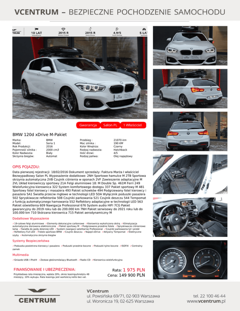 BMW 120d xDrive M-Pakiet Marka: Model: Rok Produkcji: Pojemność silnika : Kolor Nadwozia: Skrzynia biegów: BMW Seria 1 2016 2000 cm3 Biały Automat Przebieg : Moc silnika : Kolor Wnętrza: Rodzaj nadwozia: Ilość drzwi: Rodzaj paliwa: 21070 km 190 KM Czarny Hatchback 4/5 Olej napędowy OPIS POJAZDU: Data pierwszej rejestracji: 18/02/2016 Dokument sprzedaży: Faktura Marża I właściciel Bezwypadkowy Salon PL Wyposażenie dodatkowe: 2NH Sportowe hamulce M 2TB Sportowa skrzynia automatyczna 2VB Czujnik ciśnienia w oponach 2VF Zawieszenie adaptacyjne M 2VL Układ kierowniczy sportowy 21A Felgi aluminiowe 18: M Double Sp. 461M Ferri 249 Wielofunkcyjna kierownica 322 System komfortowego dostępu 337 Pakiet sportowy M 481 Sportowy fotel kierowcy i masażera 493 Pakiet schowków 494 Podgrzewany fotel kierowcy i pasażera 5A1 Światła przeciw mgłowe w technologii LED 5DA Wyłącznik poduszki pasażera 502 Spryskiwacze reflektorów 508 Czujniki parkowania 521 Czujnik deszczu 544 Tempomat z funkcją automatycznego hamowania 552 Reflektory adaptacyjne w technologii LED 563 Pakiet oświetlenia 609 Nawigacja Professional 676 System audio HIFI 7CG Pakiet gwarancyjny do 2019 roku lub do 200.000 km 7NH Pakiet serwisowy do 2021 roku lub do 100.000 km 710 Skórzana kierownica 715 Pakiet aerodynamiczny M Dodatkowe Wyposażenie ✓19-calowe felgi aluminiowe ✓Elementy dekoracyjne carbonowe ✓Kierownica wykończona skórą ✓Klimatyzacja automatyczna sterowana elektronicznie ✓Pakiet sportowy M ✓Podgrzewane przednie fotele ✓Spryskiwacze ciśnieniowe lamp ✓Światła do jazdy dziennej LED ✓System nawigacji satelitarnej Professional ✓Czujniki parkowania tył i przód ✓Reflektory Full LED ✓Fotele sportowe BMW ✓Czujnik deszczu ✓Napęd xDrive ✓Aktywny Tempomat ✓Elektryczne szyby ✓Automatyczna skrzynia biegów Systemy Bezpieczeństwa ✓Poduszka powietrzna kierowcy i pasażera ✓Poduszki przednie boczne ✓Poduszki tylne boczne ✓ISOFIX ✓Centralny zamek Multimedia ✓Gniazdo USB / iPod® ✓Zestaw głośnomówiący Bluetooth ✓Radio CD ✓Kierownica wielofunkcyjna FINANSOWANIE I UBEZPIECZENIA: Przykładowa rata miesięczna, wpłata 20%, okres leasingu/kredytu 48 miesięcy, 10% wykupu. Rata leasingu jest wartością netto bez vat. Rata: 1 975 Cena: 149 900 PLN PLN Niniejsza treść nie stanowi oferty w rozumieniu przepisów Kodeksu Cywilnego oraz opisu towaru ani zapewnienia w rozumieniu art. 4 Ustawy z dnia 27 lipca 2002r o szczególnych warunkach sprzedaży konsumenckiej. Powered by TCPDF (www.tcpdf.org)