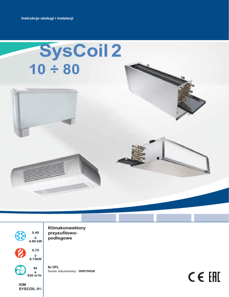 1 Syscoil 2 Instrukcja obsługi i instalacji SysCoil 2 10 ÷ 80 0.49 ↓ 4.90 kW Klimakonwektory przysufitowopodłogowe 0.79 ↓ 8.75kW 94 ↓ 930 m3/h IOM SYSCOIL 01- N-1PL Numer dokumentacji : 3990790GB 2 Syscoil 2 INSTRUKCJA INSTALACJI Polski 3 Syscoil 2 Spis treści ZALECENIA OGÓLNE .............................................................................................................................................. 5 1. 1.1 WSKAZÓWKI DOTYCZĄCE ŚRODKÓW OSTROŻNOŚCI ............................................................................. 5 1.2 OSTRZEŻENIE ........................................................................................................................................................ 5 2. SPRAWDZENIE PRZESŁYKI I SKŁADOWANIE ....................................................................................................... 6 3. WARUNKI GWARANCJI ........................................................................................................................................... 6 4. OZNACZENIE MODELU URZĄDZENIA ................................................................................................................... 7 5. PARAMETRY TECHNICZNE .................................................................................................................................... 7 5.1 ZAKRES PRACY ..................................................................................................................................................... 7 5.2 DANE ELEKTRYCZNE ................................................................................................................................... 7 5.2.1 BEZ NAGRZEWNICY ELEKTRYCZNEJ .......................................................................................................... 7 5.2.2 Z NAGRZEWNICĄ ELEKTRYCZNĄ ................................................................................................................. 7 6. WYMIARY................................................................................................................................................................. 8 MONTAŻ................................................................................................................................................................... 8 7. 7.1 WAGA NETTO ......................................................................................................................................................... 8 8. INSTALACJA ............................................................................................................................................................ 8 8.1 ODSTĘPY SERWISOWE ........................................................................................................................................ 8 8.2 POSADOWIENIE URZĄDZENIA ............................................................................................................................. 9 8.3 ZAINSTALOWANIE URZĄDZENIA .......................................................................................................................... 9 8.3.1 Modele pionowe SVN/SVC .............................................................................................................................. 9 8.3.2 Modele poziome SHN/SHC ............................................................................................................................. 9 8.4 ZDEJMOWANIE OBUDOWY ..................................................................................................................................11 9. PODŁĄCZENIA HYRAULICZNE ....................................................................................................................................12 9.1 STRONA PRZYŁĄCZENIOWA ..............................................................................................................................12 9.2 PODŁĄCZENIA WYMIENNIKA ...............................................................................................................................12 9.2.1 PODŁĄCZENIA WODNE ...................................................................................................................................13 9.2.2 PODŁĄCZENIA WODNE ZAWORÓW REGULACYJNYCH .................................................................................13 9.3 POJEMNOŚĆ WYMIENNIKA.................................................................................................................................13 9.4 PODŁĄCZENIE INSTALACJI SPŁYWOWEJ KONDENSATU ................................................................................14 9.5 PODŁĄCZENIE TERMOSTATU LUB CZUJNIKA TEMPERATURY (ZMIANA TRYBU PRACY) .............................14 9.5.1 TRM-FA ..........................................................................................................................................................14 9.5.2 TAE20 lub AQUANET lub AQUASIMP ............................................................................................................14 9.6 JAKOŚĆ WODY .....................................................................................................................................................15 10. PODŁĄCZENIA ELEKTRYCZNE .................................................................................................................................16 10.1 SCHEMAT ELEKTRYCZNY Z OBJAŚNIENIAMI ..................................................................................................16 10.2 ZASILANIE ...........................................................................................................................................................16 10.3 PODŁĄCZENIA ELEKTRYCZNE ..........................................................................................................................16 10.4 GRZAŁKA ELEKTRYCZA (OPCJA) .......................................................