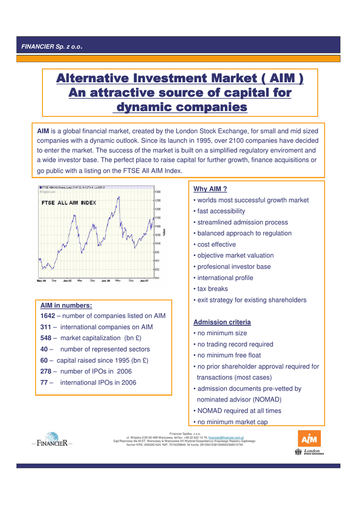 FINANCIER Sp. z o.o . AIM is a global financial market, created by the London Stock Exchange, for small and mid sized companies with a dynamic outlook. Since its launch in 1995, over 2100 companies have decided to enter the market. The success of the market is built on a simplified regulatory enviroment and a wide investor base. The perfect place to raise capital for further growth, finance acquisitions or go public with a listing on the FTSE All AIM Index. Why AIM ? • worlds most successful growth market • fast accessibility • streamlined admission process • balanced approach to regulation • cost effective • objective market valuation • profesional investor base • international profile • tax breaks • exit strategy for existing shareholders AIM in numbers: 1642 – number of companies listed on AIM 311 – international companies on AIM 548 – market capitalization (bn £) 40 – number of represented sectors 60 – capital raised since 1995 (bn £) 278 – number of IPOs in 2006 77 – international IPOs in 2006 Admission criteria • no minimum size • no trading record required • no minimum free float • no prior shareholder approval required for transactions (most cases) • admission documents pre-vetted by nominated advisor (NOMAD) • NOMAD required at all times • no minimum market cap Financier Spółka z o.o. ul. Wiejska 2/29 00-489 Warszawa, tel/fax: +48 22 622 10 76, [email protected] S d Rejonowy dla M.ST. Warszawy w Warszawie XII Wydział Gospodarczy Krajowego Rejestru S dowego. Numer KRS: 0000261424. NIP: 7010039846. Nr konta: 28105010381000002308415740 FINANCIER Sp. z o.o . The path to AIM: • finding the right main advisor, that will guide the company through the whole process • preparing the company for talks with potential NOMADs and Brokers • choose, in cooperation with the main advisor, the market advisors needed to execute the IPO process • attracting institutional investors • book-building and selling stocks • dealings start on AIM Market advisors needed to enter AIM : NOMAD – nominated advisor, dual role: primary responsibility to the London Stock Exchange and IPO advisor to the company Broker – coordinates the placing of the company’s shares in the IPO process Auditors – financial and legal; provide an in-depth review of the company’s position PR advisor – responsible for the company’s communication with the market Typical IPO timetable Financier Spółka z o.o. ul. Wiejska 2/29 00-489 Warszawa, tel/fax: +48 22 622 10 76, [email protected] S d Rejonowy dla M.ST. Warszawy w Warszawie XII Wydział Gospodarczy Krajowego Rejestru S dowego. Numer KRS: 0000261424. NIP: 7010039846. Nr konta: 28105010381000002308415740 FINANCIER Sp. z o.o . Costs on AIM • average cost of raising capital on AIM is 6-8% of issue value • costs of ongoing cooperation with the NOMAD, mandatory at all times, has to be budgeted going forward • the ability for the company to negotiate with the NOMAD allows the company to maintain trade secrets and create a favourable transaction structure • option mechanism – allows to use payment in options as an incentive to management AIM investors • more than 60% of all transactions on AIM are held by institutional investors • the biggest institutional investors on AIM are: 1. CDS & Co. (4,8 bn EUR) 4. New Star ( 0,9 bn EUR) 2. Fidelity (1,5 bn EUR) 5. AMVESCAP (0,9 bn EUR) 3. Artemis (1,1 bn EUR) 6. Merrill Lynch ( 0,8 bn EUR) Coffee Heaven International – Case Study • chain of cafes, which originated from Poland, first opening – September 2000 • listed on AIM in November 2001 raising £1 milion • through further raises it has attracted almost £10 milion in expansion capital • as at February 2007 the group has 61 trading sites in 5 countries • todays market cap is £44 milion • in the last 15 months, market cap has grown by 230% Financier Spółka z o.o. ul. Wiejska 2/29 00-489 Warszawa, tel/fax: +48 22 622 10 76, [email protected] S d Rejonowy dla M.ST. Warszawy w Warszawie XII Wydział Gospodarczy Krajowego Rejestru S dowego. Numer KRS: 0000261424. NIP: 7010039846. Nr konta: 28105010381000002308415740 FINANCIER Sp. z o.o . Financier is a Warsaw based investment banking boutique, established in 2006. We specialize in raising all forms of capital for companies as well as business projects. We are also the first investment banking firm in Poland, that offers the complete range of possible capital raising opportunities and cooperates with the Alternative Investment Market (AIM). Our complete offer includes • • • • • • • • capital raising, IPO or other strategic and financial advisory negotiations advisory and organization of M&A MBO & LBO managing projects, writing and analyzing business plans financial modelling The whole value of tranactions, that Financier Partners were involved in exceeded well 6 bn EUR. We have worked with: Elektrim, Michelin, PKO BP, Exbud, Cersanit, PGNiG, ywiec, Heineken, Prokom, Hutchinson Whampoa, PZU, BAT, Stomil Olsztyn, Agora, Tele5, Provident Financial, Coffee Heaven David Thomas, CEO, [email protected] Paweł Naro ny, Board Member, [email protected] tel./fax. +48-22 622 10 76, [email protected], www.financier.com.pl Financier Spółka z o.o. ul. Wiejska 2/29 00-489 Warszawa, tel/fax: +48 22 622 10 76, [email protected] S d Rejonowy dla M.ST. Warszawy w Warszawie XII Wydział Gospodarczy Krajowego Rejestru S dowego. Numer KRS: 0000261424. NIP: 7010039846. Nr konta: 28105010381000002308415740