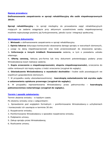 Nazwa procedury: Dofinansowanie zaopatrzenia w sprzęt rehabilitacyjny dla osób niepełnosprawnych 2015r. Sprzęt rehabilitacyjny - to sprzęt niezbędny do prowadzenia zajęć rehabilitacyjnych mających za zadanie osiągnięcie przy aktywnym uczestnictwie osoby niepełnosprawnej możliwie najwyższego poziomu jej funkcjonowania, jakości życia i integracji społecznej. Wymagane dokumenty: 1. Wniosek o dofinansowanie zaopatrzenia w sprzęt rehabilitacyjny. 2. Opinia lekarza dotycząca konieczności stosowania danego sprzętu w warunkach domowych, z uwagi na daną niepełnosprawność oraz brak przeciwwskazań do stosowania sprzętu. 3. Informacje o innych źródłach finansowania zadania, w tym o posiadaniu udziału własnego. 4. Ofertę cenową, fakturę pro-forma lub inny dokument potwierdzający podany przez Wnioskodawcę koszt realizacji zadania. 5. Kopia orzeczenia o niepełnosprawności, stopniu niepełnosprawności, orzeczenia do celów rentowych lub kopię wypisu z treści orzeczenia (oryginał do wglądu). 6. Oświadczenie Wnioskodawcy o wysokości dochodów i liczbie osób pozostających we wspólnym gospodarstwie domowym. 7. W przypadku osoby ubezwłasnowolnionej - kserokopię zaświadczenia lub wyroku sądu o ustanowieniu opiekuna prawnego (oryginał do wglądu). 8. W przypadku reprezentowania Wnioskodawcy przez pełnomocnika – kserokopię pełnomocnictwa notarialnego (oryginał do wglądu). Termin i sposób załatwiania: Termin złożenia wniosku - w każdym czasie. Po złożeniu wniosku wraz z załącznikami: 1. Sprawdzenie pod względem formalnym – poinformowanie Wnioskodawcy o uchybieniach i konieczności ich usunięcia w terminie 30 dni. 2. Rozpatrzenie wniosku. 3. Poinformowanie Wnioskodawcy o sposobie rozpatrzenia wniosku. 4. Podpisanie umowy. 5. Zakup sprzętu przez Wnioskodawcę. 6. Rozliczenie umowy. Miejsce złożenia wniosku: Powiatowe Centrum Pomocy Rodzinie w Gnieźnie, Dział ds. Osób Niepełnosprawnych ul. Jana Pawła II 9/10, 62-200 Gniezno. Podstawa prawna: 1. Ustawa z dnia 27 sierpnia 1997 r. o rehabilitacji zawodowej i społecznej oraz zatrudnianiu osób niepełnosprawnych (t.j.: Dz. U. z 2011 r. Nr 127, poz. 721 z późn. zm.). 2. Rozporządzenie Ministra Pracy i Polityki Społecznej z dnia 25 czerwca 2002r. w sprawie określenia rodzajów zadań powiatu, które mogą być finansowane ze środków Państwowego Funduszu Rehabilitacji Osób Niepełnosprawnych (t.j.: Dz. U. z 2013 r. poz. 1190). Inne informacje: 1. O dofinansowanie zaopatrzenia w sprzęt rehabilitacyjny ze środków Funduszu mogą ubiegać się osoby niepełnosprawne stosownie do potrzeb wynikających z niepełnosprawności, jeżeli: a) przeciętny miesięczny dochód, w rozumieniu przepisów o świadczeniach rodzinnych, podzielony przez liczbę osób we wspólnym gospodarstwie domowym, obliczony za kwartał poprzedzający miesiąc złożenia wniosku, nie przekracza kwoty: - 50% przeciętnego wynagrodzenia na osobę we wspólnym gospodarstwie domowym, - 65% przeciętnego wynagrodzenia w przypadku osoby samotnej, b) zachodzi potrzeba rehabilitacji w warunkach domowych przy użyciu tego sprzętu. 2. Wysokość dofinansowania zaopatrzenia w sprzęt rehabilitacyjny wynosi do 60% kosztów tego sprzętu, nie więcej jednak niż do wysokości pięciokrotnego przeciętnego wynagrodzenia. 3. Konieczność stosowania danego sprzętu w warunkach domowych, z uwagi na daną niepełnosprawność, musi zostać wskazana przez lekarza. 4. Nie podlega dofinansowaniu sprzęt medyczny np. pompy insulinowe. 5. Dofinansowanie ze środków PFRON nie przysługuje, jeżeli podmiot ubiegający się o dofinansowanie ma zaległości wobec PFRON lub podmiot ten był w ciągu trzech lat przed złożeniem wniosku stroną umowy zawartej z udziałem środków Funduszu, rozwiązanej z przyczyn leżących po stronie tego podmiotu. Podstawowy katalog sprzętu rehabilitacyjnego dla osób fizycznych i podmiotów Do sprzętu rehabilitacyjnego zalicza się m.in.: 1. kabina UGUL oraz osprzęt (podwieszki, linki, ciężarki), 2. PUR – przyłóżkowe urządzenia rehabilitacyjne, 3. tablice do ćwiczeń manualnych wraz z wyposażeniem, 4. rotor do ćwiczeń kończyn dolnych oraz górnych, 5. rotor do ćwiczeń stawu barkowego, 6. rotor zespolony, 7. tor do nauki chodzenia, 8. schody i poręcze do nauki chodzenia, 9. materac rehabilitacyjny/mata do ćwiczeń, 10. drabinka gimnastyczna, drążek rehabilitacyjno – gimnastyczny, 11. bieżnia, stopery, 12. atlas rehabilitacyjno – siłowy, 13. symulator wiosłowania i biegu narciarskiego, 14. ekspander gimnastyczny (gumy/sprężyny do rozciągania), 15. ciężarki gimnastyczne, 16. piłki rehabilitacyjne, 17. suchy basen do rehabilitacji z piłeczkami, 18. wałek, półwałek rehabilitacyjny, 19. kostka rehabilitacyjna, 20. worek Sakwa – Sako, 21. równoważnia do ćwiczeń balansu ciała i stawów skokowych, 22. rower rehabilitacyjny do prowadzenia rehabilitacji w warunkach domowych, 23. orbitrek. 24. Inne /na wskazanie i uzasadnienie lekarza/.
