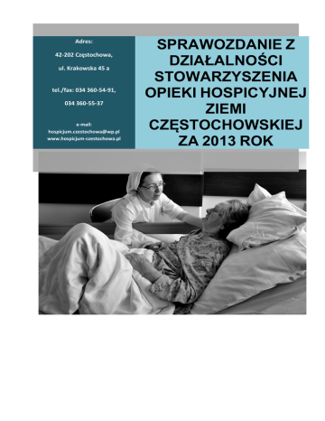 Adres: 42-202 Częstochowa, ul. Krakowska 45 a tel./fax: 034 360-54-91, 034 360-55-37 e-mail: [email protected] www.hospicjum-czestochowa.pl SPRAWOZDANIE Z DZIAŁALNOŚCI STOWARZYSZENIA OPIEKI HOSPICYJNEJ ZIEMI CZĘSTOCHOWSKIEJ ZA 2013 ROK SPRAWOZDANIE Z DZIAŁALNOŚCI STOWARZYSZENIA OPIEKI HOSPICYJNEJ ZIEMI CZĘSTOCHOWSKIEJ ZA 2013 ROK DANE O ORGANIZACJI Stowarzyszenie Opieki Hospicyjnej Ziemi Częstochowskiej - Hospice Care Association of Czestochowa Siedziba/adres: 42-202 Częstochowa, ul. Krakowska 45 a Tel/fax. (34) 3605491, 3605491, e-mail: [email protected] www.hospicjum-czestochowa.pl konto bankowe: PeKaO S.A. oddział Częstochowa 15 1240 1213 1111 0000 2379 4368 NIP 573-11-78-324; REGON 150873476 NUMER KRS 0000056401 - data rejestracji 16.03.1993 r. Data uzyskania statusu organizacji pożytku publicznego 27.11.2006 r. Misją Stowarzyszenia jest świadczenie wielodyscyplinarnej i całościowej opieki sprawowanej w celu łagodzenia cierpień, leczenia bólu oraz innych objawów towarzyszących chorobie, a także poprawy jakości życia pacjentów chorych na przewlekle i nieuleczalnie choroby nie poddające się leczeniu, dbałość o sferę psychiczną, duchową, fizyczną i społeczną pacjentów oraz ich rodzin w trakcie trwania choroby oraz w okresie osierocenia, podnoszenie świadomości społeczeństwa na temat idei opieki hospicyjnej oraz edukacja pracowników i wolontariuszy. Członkowie zarządu: Kaptacz Anna - prezes Łupińska Urszula - wiceprezes Petryków Krzysztof - skarbnik Kaptacz Izabela - sekretarz Długosz Aneta - członek Komisja Rewizyjna: Przewodniczący: Rafał Nemsz, Członkowie: Małgorzata Socha, Longin Dobrakowski. Sąd Koleżeński: Stanisława Barakońska, Roman Worwąg, Ilona Hyra. Ilość członków Stowarzyszenia: na dzień 31 grudnia 2013 r.: Członków zwyczajnych 82 osoby; wspierających: 0; honorowych 3; W roku sprawozdawczym 2013 zarząd Stowarzyszenia Opieki Hospicyjnej Ziemi Częstochowskiej odbył 8 posiedzeń. Podjęto 11 uchwał w sprawach bieżącej działalności Stowarzyszenia. 1 SPRAWOZDANIE Z DZIAŁALNOŚCI STOWARZYSZENIA OPIEKI HOSPICYJNEJ ZIEMI CZĘSTOCHOWSKIEJ ZA 2013 ROK OKRESLENIE CELÓW STATUTOWYCH 1) działalność dobroczynna, ochrona zdrowia i pomoc społeczna. 2) poprawa jakości życia nieuleczalnie chorych dorosłych i dzieci w terminalnym okresie choroby na miarę ich indywidualnych możliwości. 3) niesienie ulgi w cierpieniu psychicznym, duchowym i społeczno-socjalnym, leczenie bólu i innych objawów towarzyszących chorobie głównie nowotworowej i AIDS. 4) pomoc rodzinom chorych i osieroconym. 5) podnoszenie świadomości społecznej na temat opieki holistycznej i wielodyscyplinarnej opieki hospicyjnej. 6) szkolenie personelu medycznego, wolontariuszy i rodzin chorych. 7) współpraca z organami administracji publicznej, samorządowej i innymi organizacjami w kraju i za granicą. 8) pomoc poszkodowanym w wypadkach samochodowych i ich rodzinom. 9) organizacja i promocja wolontariatu. 10) rehabilitacja osób niepełnosprawnych. 11) integracja osób niepełnosprawnych z pełnosprawnymi. 12) pomoc i poradnictwo osobom niepełnosprawnym, ich rodzinom i opiekunom. OPIS PROWADZONEJ DZIAŁALNOŚCI Do realizacji swoich celów statutowych Stowarzyszenie: 1) powołuje i wpływa na całokształt działań Niepublicznych Zakładów Opieki Zdrowotnej, 2) organizuje całodobowe, stacjonarne hospicja onkologiczne dla dorosłych i dzieci, 3) zakłada i prowadzi ośrodki opieki i wsparcia nad rodzinami chorych i osieroconymi, 4) zakłada i prowadzi ośrodki rehabilitacji biologicznej i psycho-duchowej dla poszkodowanych w wypadkach drogowych, chorych na nowotwory będących w trakcie leczenia onkologicznego, 5) współpracuje z krajowymi i zagranicznymi instytucjami, bądź podmiotami gospodarczymi mogącymi wesprzeć działalność Stowarzyszenia, 6) pozyskuje środki finansowe i rzeczowe do realizacji celów Stowarzyszenia, 7) nawiązuje współpracę z pokrewnymi organizacjami krajowymi i zagranicznymi umożliwiając wymianę doświadczeń oraz wspieranie podejmowanych inicjatyw, 8) tworzy ośrodki formacyjne dla personelu, wolontariuszy i osieroconych, 9) prowadzi działalność informacyjno-edukacyjną umożliwiającą szerzenie w społeczeństwie wiedzy na temat idei hospicyjnej, 10) prowadzi działalność szkoleniową dla: - personelu służby zdrowia, - wolontariuszy, - rodzin chorych, 11) prowadzi działalność wydawniczą, 1 SPRAWOZDANIE Z DZIAŁALNOŚCI STOWARZYSZENIA OPIEKI HOSPICYJNEJ ZIEMI CZĘSTOCHOWSKIEJ ZA 2013 ROK 12) prowadzi działalność integracyjną dla członków Stowarzyszenia poprzez aktywność kulturalną i rekreacyjną, 13) podejmuje inne działania sprzyjające rozwojowi statutowych celów Stowarzyszenia, 14) prowadzi nieodpłatną działalność pożytku publicznego w granicach przewidzianych prawem, 15) może prowadzić działalność gospodarczą w granicach przewidzianych prawem, służącą realizacji celów statutowych Stowarzyszenia, 16) prowadzenie placówek terapeutycznych, rehabilitacyjnych, opiekuńczych, oświatowych, szkoleniowych, rekreacyjnych i kulturalnych, 17) reprezentowanie interesów osób niepełnosprawnych wobec władz publicznych, 18) podejmowanie inicjatyw mających na celu wszechstronną pomoc osobom niepełnosprawnym, ich rodzinom i opiekunom. Celem realizacji celów statutowych Stowarzyszenie prowadzi działalność pożytku publicznego nieodpłatną oraz działalność gospodarczą. W ramach działalności gospodarczej Stowarzyszenie zorganizowało konferencję naukowo-szkoleniową o tematyce opieki paliatywnej i hospicyjnej, pomocy psychoduchowej, społeczno-socjalnej na rzecz przewlekle i nieuleczalnie chorych i ich rodzin. Stowarzyszenie zorganizowało również Karnawałowy Bal Charytatywny, którego dochód był przeznaczony na rzecz Hospicjum Domowego dla Dzieci. Nieodpłatną działalność pożytku publicznego Stowarzyszenie Opieki Hospicyjnej Ziemi Częstochowskie