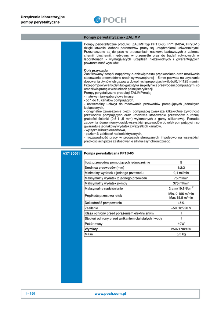 Urządzenia laboratoryjne pompy perystaltyczne Pompy perystaltyczne - ZALIMP Pompy perystaltyczne produkcji ZALIMP typ PP1 B-05, PP1 B-05A, PP2B-15 dzięki łatwości doboru parametrów pracy są urządzeniami uniwersalnymi. Przeznaczone są do prac w pracowniach naukowo-badawczych z zakresu chemii, biochemii, medycyny, w przemyśle oraz do badań rutynowych w laboratoriach - wymagających urządzeń niezawodnych i gwarantujących powtarzalność wyników. Opis przyrządu Zunifikowany zespół napędowy o dziewiętnastu prędkościach oraz możliwość stosowania przewodów o średnicy wewnętrznej 1-5 mm pozwala na uzyskanie dozowania płynów lub gazów w dowolnych proporcjach w ilości 0,1-1125 ml/min. Przepompowywany płyn lub gaz styka się jedynie z przewodem pompującym, co umożliwia pracę w warunkach pełnej sterylizacji. Pompy perystaltyczne produkcji ZALIMP mają - małe wymiary gabarytowe i masę, - od 1 do 15 kanałów pompujących, - uniwersalny uchwyt do mocowania przewodów pompujących jednolitych lubłączonych, - oryginalne zawieszenie bieżni pompującej zwiększa kilkakrotnie żywotność przewodów pompujących oraz umożliwia stosowanie przewodów o różnej grubości ścianki (0,5-1 ,5 mm) wykonanych z gumy silikonowej. Ponadto zapewnia równomierny docisk wszystkich przewodów do rolek pompujących, co gwarantuje jednakowy wydatek z wszystkich kanałów, - wyłączniki bezpieczeństwa, - poziom N zakłóceń radioelektrycznych, - niezawodność pracy w procesach sterowanych impulsowo na wszystkich prędkościach przez zastosowanie silnika asynchronicznego. A37190001 I - 150 Pompa perystaltyczna PP1B-05 www.poch.com.pl Urządzenia laboratoryjne pompy perystaltyczne A37190002 Pompa perystaltyczna PP1B-05A A37190003 Pompa perystaltyczna PP2B-15 www.poch.com.pl I - 151