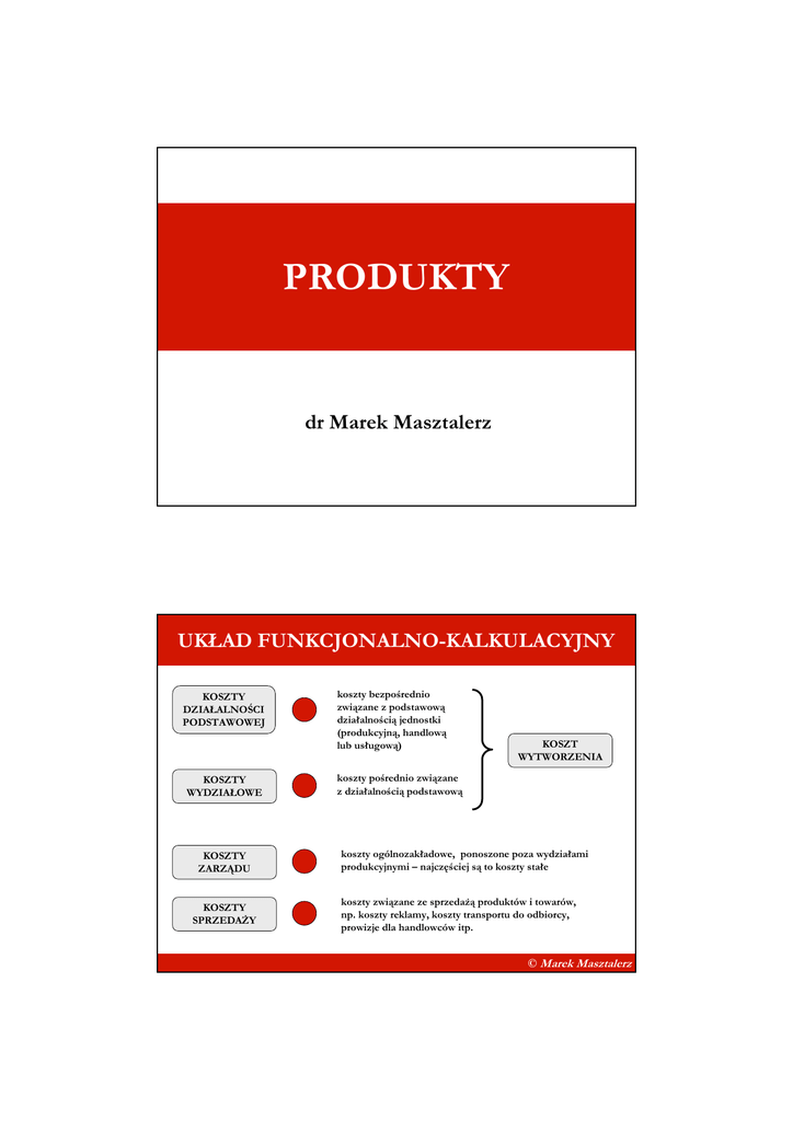 PRODUKTY dr Marek Masztalerz UKŁAD FUNKCJONALNO-KALKULACYJNY KOSZTY DZIAŁALNOŚCI PODSTAWOWEJ KOSZTY WYDZIAŁOWE KOSZTY ZARZĄDU KOSZTY SPRZEDAśY koszty bezpośrednio związane z podstawową działalnością jednostki (produkcyjną, handlową lub usługową) KOSZT WYTWORZENIA koszty pośrednio związane z działalnością podstawową koszty ogólnozakładowe, ponoszone poza wydziałami produkcyjnymi – najczęściej są to koszty stałe koszty związane ze sprzedaŜą produktów i towarów, np. koszty reklamy, koszty transportu do odbiorcy, prowizje dla handlowców itp. © Marek Masztalerz 1 KOSZT WYTWORZENIA KOSZTY BEZPOŚREDNIE KOSZTY POŚREDNIE PRODUKCYJNE (wydziałowe) ZMIENNE STAŁE uzasadniona część KOSZT WYTWORZENIA (wycena produktów) NIEPRODUKCYJNE (ogólnozakładowe) KOSZTY ZARZĄDU KOSZTY SPRZEDAśY niewykorzystany potencjał KOSZTY OKRESU (odnoszone w całości na wynik fin.) © Marek Masztalerz „UZASADNIONA CZĘŚĆ” KOSZTÓW STAŁYCH Według polskiego prawa bilansowego do kosztu wytworzenia produktu nie wlicza się wszystkich kosztów pośrednich produkcji (wydziałowych) a jedynie ich „uzasadnioną część”, obejmującą: • zmienne pośrednie koszty produkcji • część stałych, pośrednich kosztów produkcji, które odpowiadają poziomowi tych kosztów przy normalnym wykorzystaniu zdolności produkcyjnych. Zastosowanie normalnego poziomu wykorzystania potencjału do rozliczenia stałych kosztów wydziałowych pozwala uniknąć znacznego zróŜnicowania wyceny tych samych produktów w róŜnych okresach. Jednostki, których sprawozdanie finansowe nie podlega obowiązkowemu badaniu przez biegłego rewidenta, mogą zrezygnować z ustalania stopnia wykorzystania zdolności wytwórczych. © Marek Masztalerz 2 KOSZTY UZASADNIONE I KOSZTY PUSTE stałe koszty wydziałowe koszty nieuzasadnione (puste) koszty uzasadnione (uŜyteczne) 0% stopień wykorzystania potencjału (normalnych zdolności) 100% © Marek Masztalerz RACHUNEK KOSZTÓW NORMALNYCH Do ustalenia uzasadnionej części stałych kosztów produkcyjnych przypadających na wyprodukowane wyroby moŜna zastosować zasadę zawartą w MSR 2 „Zapasy”. Według tej zasady: • jeśli wielkość produkcji w danym okresie jest wyŜsza od normalnego poziomu, do za podstawę rozliczenia naleŜy przyjąć stawkę rzeczywistą, wynikającą z podzielenia stałych kosztów wydziałowych przez faktyczną wielkość produkcji, • jeśli produkcja w danym okresie jest niŜsza od normalnego poziomu wykorzystania zdolności wytwórczych, stosuje się stawkę stabilizowaną, liczoną jako stosunek planowanych stałych kosztów wydziałowych do normalnego potencjału produkcyjnego. © Marek Masztalerz 3 RACHUNEK KOSZTÓW RZECZYWISTYCH & NORMALNYCH (1) Student dorabia sobie do stypendium wypiekami ciastek, które następnie sprzedaje sąsiadom. Koszty ponoszone przy produkcji ciastek skalkulował następująco: Pozycje kalkulacyjne Surowce (mąka, cukier, jaja, masło, wisienka) Robocizna (wyrabianie i formowanie) Koszty pośrednie (prąd i amortyzacja piekarnika) KOSZT WYTWORZENIA Koszty ogółem Koszt jednostkowy - 2,00 zł/szt. - 1,50 zł/szt. 12 zł/wypiek ? - ? © Marek Masztalerz RACHUNEK KOSZTÓW RZECZYWISTYCH & NORMALNYCH (2) Potencjał produkcyjny jest wykorzystany w 100%. Wszystkie koszty są uzasadnione (uŜyteczne). Koszt produkcji ciastka: • wg rachunku kosztów rzeczywistych = 4,50 zł/szt. • wg rachunku kosztów normalnych = 4,50 zł/szt. Potencjał produkcyjny jest wykorzystany w 67%. 33% kosztów stałych (piekarnik) to koszty puste. Koszt produkcji ciastka: • wg rachunku kosztów rzeczywistych = 5,00 zł/szt. • wg rachunku kosztów normalnych = 4,50 zł/szt. Koszty niewykorzystanych zdolności produkcyjnych w kwocie 4 zł obciąŜą koszty okresu (PKO). © Marek Masztalerz 4 WYCENA PRODUKTÓW KOSZT WYTWORZENIA na dzień powstania lub CENA EWIDENCYJNA Stała cena ewidencyjna moŜe być ustalona na poziomie planowanego kosztu wytworzenia. W przypadku ewidencji produktów po cenie ewidencyjnej konieczna jest ewidencja odchyleń wartości produktów od rzeczywistego kosztu wytworzenia. KOSZT WYTWORZENIA na dzień bilansowy nie wyŜszy od CENY SPRZEDAśY NETTO – ODPISY AKTUALIZUJĄCE Odpisy aktualizujące wartość produktów obciąŜają pozostałe koszty operacyjne. © Marek Masztalerz WYCENA ROZCHODU PRODUKTÓW Rozchody zapasów produktów mogą być wyceniane wg jednej z czterech metod: KOSZT PRZECIĘTNY kolejne rozchody produktów są wyceniane po średnim waŜonym koszcie wytworzenia FIFO „first in first out” czyli „pierwsze weszło, pierwsze wyszło”, gdy w rozchód wycenia się kolejno po kosztach tych produktów, które zostały najwcześniej wytworzone, LIFO „last in first out” czyli „ostatnie weszło, pierwsze wyszło”, gdy w rozchód wycenia się kolejno po kosztach tych produktów, które zostały najpóźniej wytworzone, SZCZEGÓŁOWA IDENTYFIKACJA kolejne rozchody produktów są wyceniane po koszcie wytworzenia danego produktu ustalonego w drodze szczegółowej identyfikacji © Marek Masztalerz 5 ROZLICZENIE PRODUKCJI PO KOSZCIE RZECZYWISTYM 501 Produkcja podstawowa 601 Produkty gotowe 602 Produkty w toku 710 Koszt wytw. wytw. sprzed. prod. prod. W tym wariancie ewidencji produkty wycenia się wg rzeczywistego kosztu wytworzenia ustalanego w ramach kalkulacji. © Marek Masztalerz ROZLICZENIE PRODUKCJI PO KOSZCIE PLANOWANYM 501 Produkcja podstawowa 580 Rozliczenie kosztów dział. 601 Produkty gotowe 620 Odchylenia od cen ewidencyjnych produktów 602 Produkty w toku W tym wariancie ewidencji produkty wycenia się wg stałych cen ewidencyjnych ustalonych na poziomie planowanego kosztu wytworzenia. © Marek Masztalerz 6 EWIDENCJA PRODUKTÓW Koszt rzeczywisty PRODUKTY GOTOWE przyjęcie produktów do magazynu wg rzecz. TKW rozchód produktów wg rzecz. TKW Koszt planowany PRODUKTY GOTOWE przyjęcie produktów wg stałej ceny ewidencyjnej rozchód produktów wg stałej ce
