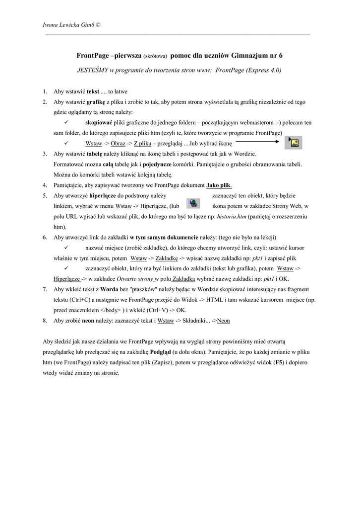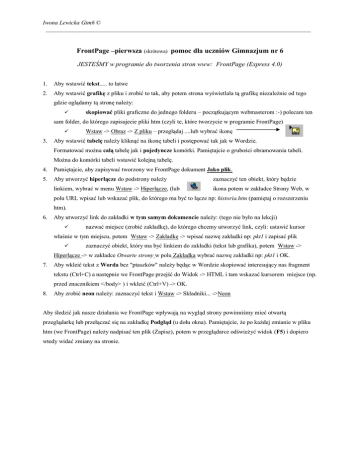 Iwona Lewicka Gim6 © _______________________________________________________________________________________ FrontPage –pierwsza (skrótowa) pomoc dla uczniów Gimnazjum nr 6 JESTEŚMY w programie do tworzenia stron www: FrontPage (Express 4.0) 1. Aby wstawić tekst..... to łatwe 2. Aby wstawić grafikę z pliku i zrobić to tak, aby potem strona wyświetlała tą grafikę niezależnie od tego gdzie oglądamy tą stronę należy: skopiować pliki graficzne do jednego folderu – początkującym webmasterom :-) polecam ten sam folder, do którego zapisujecie pliki htm (czyli te, które tworzycie w programie FrontPage) 3. Wstaw -> Obraz -> Z pliku – przeglądaj ....lub wybrać ikonę Aby wstawić tabelę należy kliknąć na ikonę tabeli i postępować tak jak w Wordzie. Formatować można całą tabelę jak i pojedyncze komórki. Pamiętajcie o grubości obramowania tabeli. Można do komórki tabeli wstawić kolejną tabelę. 4. Pamiętajcie, aby zapisywać tworzony we FrontPage dokument Jako plik. 5. Aby utworzyć hiperłącze do podstrony należy zaznaczyć ten obiekt, który będzie linkiem, wybrać w menu Wstaw -> Hiperłącze, (lub ikona potem w zakładce Strony Web, w polu URL wpisać lub wskazać plik, do którego ma być to łącze np: historia.htm (pamiętaj o rozszerzeniu htm). 6. Aby utworzyć link do zakładki w tym samym dokumencie należy: (tego nie było na lekcji) nazwać miejsce (zrobić zakładkę), do którego chcemy utworzyć link, czyli: ustawić kursor właśnie w tym miejscu, potem Wstaw -> Zakładkę -> wpisać nazwę zakładki np: pkt1 i zapisać plik zaznaczyć obiekt, który ma być linkiem do zakładki (tekst lub grafika), potem Wstaw -> Hiperłącze -> w zakładce Otwarte strony w polu Zakładka wybrać nazwę zakładki np: pkt1 i OK. 7. Aby wkleić tekst z Worda bez "ptaszków" należy będąc w Wordzie skopiować interesujący nas fragment tekstu (Ctrl+C) a następnie we FrontPage przejść do Widok -> HTML i tam wskazać kursorem miejsce (np. przed znacznikiem </body> ) i wkleić (Ctrl+V) -> OK. 8. Aby zrobić neon należy: zaznaczyć tekst i Wstaw -> Składniki... ->Neon Aby śledzić jak nasze działania we FrontPage wpływają na wygląd strony powinniśmy mieć otwartą przeglądarkę lub przełączać się na zakładkę Podgląd (u dołu okna). Pamiętajcie, że po każdej zmianie w pliku htm (we FrontPage) należy nadpisać ten plik (Zapisz), potem w przeglądarce odświeżyć widok (F5) i dopiero wtedy widać zmiany na stronie.