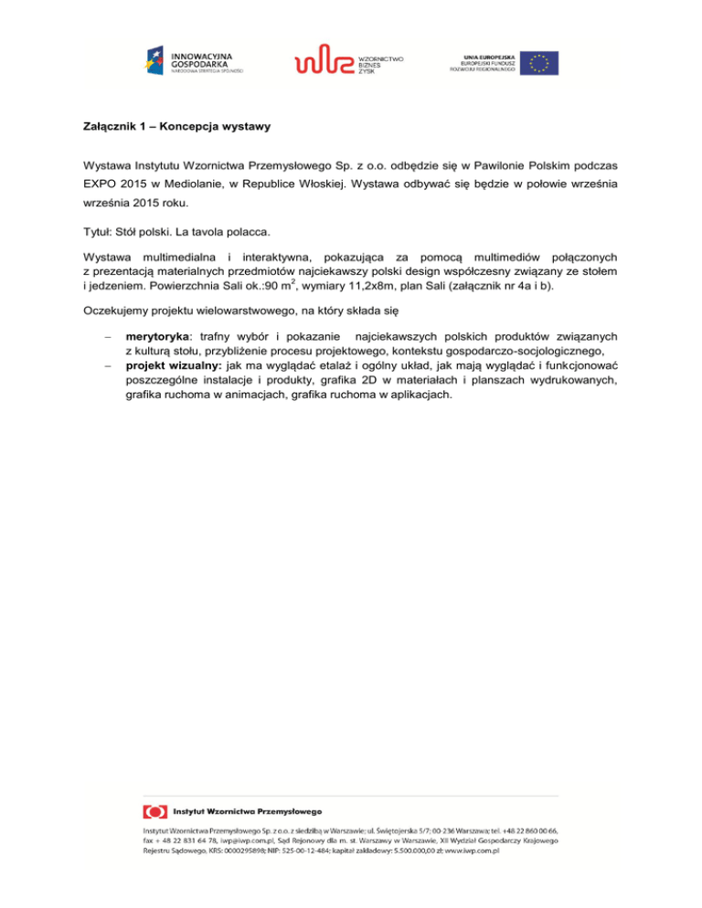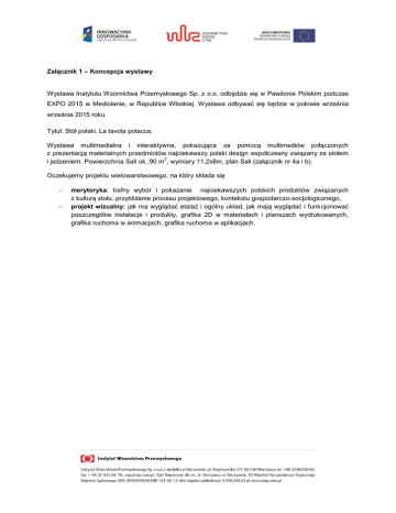Załącznik 1 – Koncepcja wystawy Wystawa Instytutu Wzornictwa Przemysłowego Sp. z o.o. odbędzie się w Pawilonie Polskim podczas EXPO 2015 w Mediolanie, w Republice Włoskiej. Wystawa odbywać się będzie w połowie września września 2015 roku. Tytuł: Stół polski. La tavola polacca. Wystawa multimedialna i interaktywna, pokazująca za pomocą multimediów połączonych z prezentacją materialnych przedmiotów najciekawszy polski design współczesny związany ze stołem 2 i jedzeniem. Powierzchnia Sali ok.:90 m , wymiary 11,2x8m, plan Sali (załącznik nr 4a i b). Oczekujemy projektu wielowarstwowego, na który składa się merytoryka: trafny wybór i pokazanie najciekawszych polskich produktów związanych z kulturą stołu, przybliżenie procesu projektowego, kontekstu gospodarczo-socjologicznego, projekt wizualny: jak ma wyglądać etalaż i ogólny układ, jak mają wyglądać i funkcjonować poszczególne instalacje i produkty, grafika 2D w materiałach i planszach wydrukowanych, grafika ruchoma w animacjach, grafika ruchoma w aplikacjach.