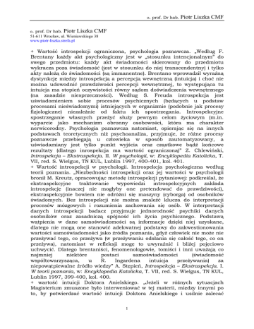 o. prof. Dr hab. Piotr Liszka CMF o. prof. Dr hab. Piotr Liszka CMF 51-611 Wrocław, ul. Wieniawskiego 38 www.piotr-liszka.strefa.pl + Wartość introspekcji ograniczona, psychologia poznawcza. „Według F. Brentany każdy akt psychologiczny jest w „stosunku intencjonalnym” do swego przedmiotu: każdy akt świadomości skierowany do przedmiotu wykracza poza świadomość (jest w stosunku do niej transcendentny) i tylko akty należą do świadomości (są immanentne). Brentano wprowadził wyraźną dystynkcję między introspekcją a percepcją wewnętrzną (intuicja) i choć nie można udowodnić prawdziwości percepcji wewnętrznej, to występująca tu intuicja ma stopień oczywistości równy sądom doświadczenia wewnętrznego (na zasadzie niesprzeczności). Według S. Freuda introspekcja jest uświadomieniem sobie procesów psychicznych (będących u podstaw procesami nieświadomymi) istniejących w organizmie (podobnie jak procesy fizjologiczne) niezależnie od faktu ich spostrzegania. Introspekcyjne spostrzeganie własnych przeżyć służy pewnym celom życiowym (m.in. wyparcie jako mechanizm obronny osobowości, która ma charakter nerwicorodny. Psychologia poznawcza natomiast, opierając się na innych podstawach teoretycznych niż psychoanaliza, przyjmuje, że różne procesy poznawcze przebiegają u człowieka w sposób zautomatyzowany, a uświadamiany jest tylko punkt wyjścia oraz cząstkowe bądź końcowe rezultaty (dlatego inrospekcja ma wartość ograniczoną)” Z. Chlewiński, Introspekcja – Ekstraspekcja. II. W psychologii, w: Encyklopedia Katolicka, T. VII, red. S. Wielgus, TN KUL, Lublin 1997, 400-401, kol. 401. + Wartość introspekcji w psychologii. Introspekcja psychologiczna według teorii poznania. „Niezbędności introspekcji oraz jej wartości w psychologii bronił M. Kreutz, opracowując metodę introspekcji pytaniowej: podkreślał, że ekstraspekcyjne traktowanie wypowiedzi introspekcyjnych zakłada introspekcję (inaczej nie mogłyby one pretendować do prawdziwości), ekstraspekcyjnie bowiem nie odróżni się maszyny (cyborga) od osobników świadomych. Bez introspekcji nie można znaleźć klucza do interpretacji procesów mózgowych i rozumienia zachowania się osób. W interpretacji danych introspekcji badacz przyjmuje jednorodność psychiki danych osobników oraz zasadniczą spójność ich życia psychicznego. Podstawą wątpienia w dane samoświadomości są informacje dzięki niej uzyskane, dlatego nie mogą one stanowić adekwatnej podstawy do zakwestionowania wartości samoświadomości jako źródła poznania, gdyż człowiek nie może nie przeżywać tego, co przeżywa (w przeżywaniu odsłania się całość tego, co on przeżywa), natomiast w refleksji mogę to uwyraźnić i bliżej pojęciowo uchwycić. Dlatego brentaniści, fenomenologowie, tomiści i inni uważają co najmniej niektóre postaci samoświadomości (świadomość współtowarzysząca, u R. Ingardena intuicja przeżywania) za niepowątpiewalne źródło wiedzy” A. Stępień, Introspekcja – Ekstraspekcja. I. W teorii poznania, w: Encyklopedia Katolicka, T. VII, red. S. Wielgus, TN KUL, Lublin 1997, 399-400, kol. 400. + wartość intuicji Doktora Anielskiego. „Jeżeli w różnych sytuacjach Magisterium zmuszone było interweniować w tej materii, między innymi po to, by potwierdzać wartość intuicji Doktora Anielskiego i usilnie zalecać 1 o. prof. Dr hab. Piotr Liszka CMF studiowanie jego myśli, to dlatego, że zalecenia te nie zawsze były realizowane z pożądaną gorliwością. W okresie po Soborze Watykańskim II w wielu szkołach katolickich można było zauważyć pewien regres w tej dziedzinie, co było wyrazem mniejszego poważania nie tylko dla filozofii scholastycznej, ale w ogóle dla studium filozofii jako takiej. Ze zdziwieniem i przykrością muszę stwierdzić, że wielu teologów podziela ten brak zainteresowania filozofią.” FR 61 + Wartość niedostępna dla zmysłów może wywoływać podniecenie. „Źródło podniecenia, wywołujący je bodziec, nie musi bynajmniej bezpośrednio oddziaływać na zmysły. Może go stanowić jakaś wartość dla samych zmysłów zgoła niedostępna, może wynikać z treści ideowych. Jednakże w takich wypadkach zwykło się mówić raczej o uniesieniu niż o podnieceniu. Samo w sobie podniecenie zdaje się wskazywać na sferę raczej zmysłowych bodźców, czyli podniet – skąd właśnie nazwa. Natomiast bardziej duchowe uniesienie może w różnym stopniu łączyć się w podmiocie ze zmysłowym, a nawet z cielesnym podnieceniem. Wydaje się, że to drugie w pewnej mierze sprzyja duchowemu uniesieniu, ale od pewnego stopnia nasilenia zaczyna mu już przeszkadzać. Obserwacja niniejsza świadczy o potrzebie integracji”. Właściwość emotywna psychiki zwana pobudliwością wymaga integracji. Pobudliwość to stała zdolność do określonych podnieceń. „Wykazuje ona różne kierunki i różne odcienie, tak jak i same podniecenia. Pobudliwość oznacza więc także pewną sferę potencjalności człowieka, która wydaje się dość blisko skojarzona z wrażliwością. Jeżeli zachodzi pomiędzy nimi łączność, to istnieje także wyraźna granica: pobudliwość wskazuje na fakty emotywne całkowicie różne od wrażliwości, chociaż z nią najczęściej związane. Sama bowiem pobudliwość oraz podniecenie jako jej dynamiczny zaczyn i rdzeń stanowią w człowieku jakby sferę „wybuchania” uczuć. Chodzi tutaj jednakże – tak się wydaje – o pewną tychże uczuć jakość i podmiotową siłę. Mamy więc np. powody do odróżniania pobudliwości od uczuciowości” F6 278-279. + Wartość powszechna poznania każdego. Poznanie Boga intuicyjne jest zawsze faktem pierwotnym, dopiero później myśl o nim zaczyna odróżniać Boga od świata i świat (przedmiot) od człowieka (podmiotu). Dopiero w owym kolejnym momencie, pojawia się problem relacji między rozumem a wiarą, aksjologią