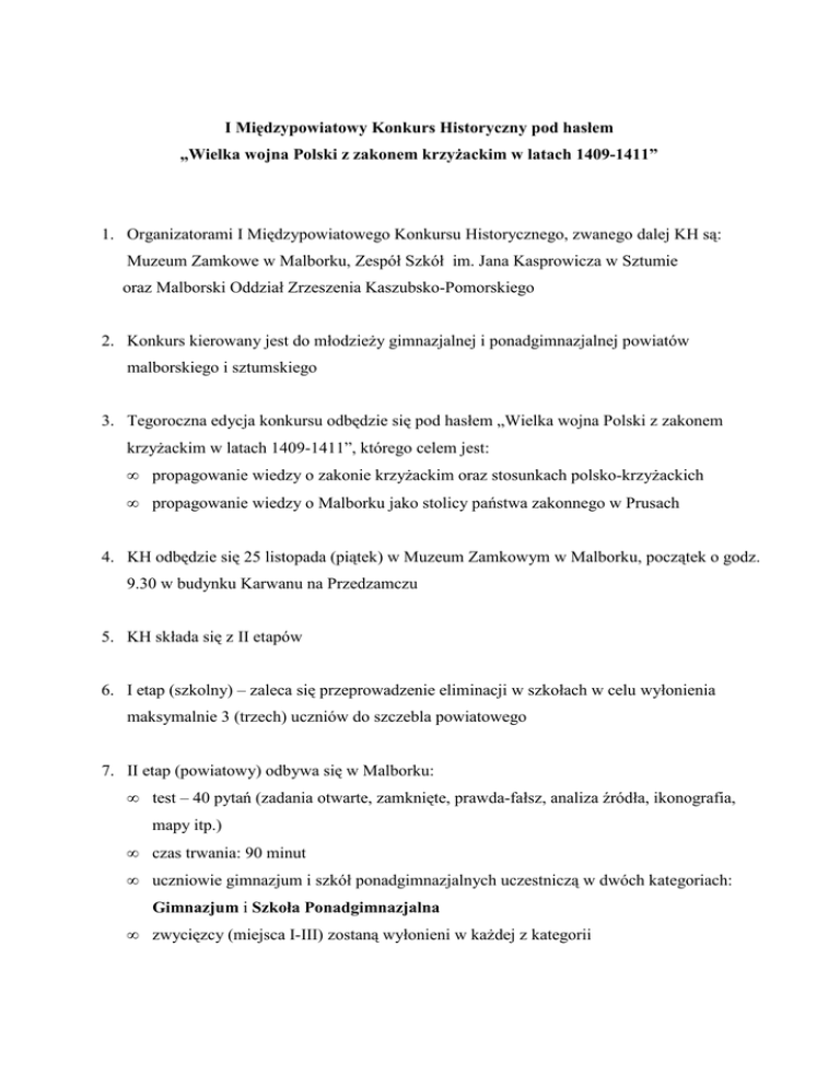 I Międzypowiatowy Konkurs Historyczny pod hasłem „Wielka wojna Polski z zakonem krzyżackim w latach 1409-1411” 1. Organizatorami I Międzypowiatowego Konkursu Historycznego, zwanego dalej KH są: Muzeum Zamkowe w Malborku, Zespół Szkół im. Jana Kasprowicza w Sztumie oraz Malborski Oddział Zrzeszenia Kaszubsko-Pomorskiego 2. Konkurs kierowany jest do młodzieży gimnazjalnej i ponadgimnazjalnej powiatów malborskiego i sztumskiego 3. Tegoroczna edycja konkursu odbędzie się pod hasłem „Wielka wojna Polski z zakonem krzyżackim w latach 1409-1411”, którego celem jest: • propagowanie wiedzy o zakonie krzyżackim oraz stosunkach polsko-krzyżackich • propagowanie wiedzy o Malborku jako stolicy państwa zakonnego w Prusach 4. KH odbędzie się 25 listopada (piątek) w Muzeum Zamkowym w Malborku, początek o godz. 9.30 w budynku Karwanu na Przedzamczu 5. KH składa się z II etapów 6. I etap (szkolny) – zaleca się przeprowadzenie eliminacji w szkołach w celu wyłonienia maksymalnie 3 (trzech) uczniów do szczebla powiatowego 7. II etap (powiatowy) odbywa się w Malborku: • test – 40 pytań (zadania otwarte, zamknięte, prawda-fałsz, analiza źródła, ikonografia, mapy itp.) • czas trwania: 90 minut • uczniowie gimnazjum i szkół ponadgimnazjalnych uczestniczą w dwóch kategoriach: Gimnazjum i Szkoła Ponadgimnazjalna • zwycięzcy (miejsca I-III) zostaną wyłonieni w każdej z kategorii • w przypadku jednakowej liczby punktów (miejsca I-III) odbędzie się dogrywka (test 10 pytań) 8. Nad prawidłowym przebiegiem KH czuwać będzie komisja wyłoniona z pracowników Muzeum Zamkowego w Malborku, nauczycieli Zespołu Szkół im. Jana Kasprowicza w Sztumie oraz przedstawicieli Malborskiego Oddziału Zrzeszenia Kaszubsko-Pomorskiego 9. Organizator zastrzega sobie prawo do zaproszenia uczestników z poza powiatów malborskiego i sztumskiego. 10. Uczestnictwo w konkursie można zgłaszać, po przeprowadzeniu I etapu szkolnego, w nieprzekraczalnym terminie do dnia 10 listopada 2011: • pocztą na adres: Muzeum Zamkowe w Malborku ul. Starościńska 1 82-200 Malbork z dopiskiem I Międzypowiatowy Konkurs Historyczny • e-mail: [email protected] • faxem: 55/ 647-0-803 11. Nagrody zostaną przyznane w dwóch kategoriach (miejsca I – III) Gimnazjum i Szkoła Ponadgimnazjalna - laureaci otrzymają nagrody rzeczowe lub książkowe 12. Organizator nie ponosi kosztów uczestnictwa w konkursie 13. Sekretariat konkursu: • Aleksandra Siuciak – Biblioteka Muzeum Zamkowego w Malborku [email protected] tel. 55/647-0-897 • Przemysław Szczuchniak – Zespół Szkół im. J. Kasprowicza w Sztumie