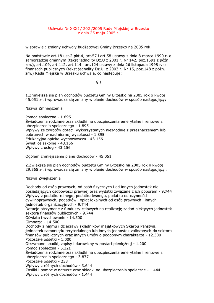 Uchwała Nr XXXI / 202 /2005 Rady Miejskiej w Brzesku z dnia 25 maja 2005 r. w sprawie : zmiany uchwały budżetowej Gminy Brzesko na 2005 rok. Na podstawie art.18 ust.2 pkt.4, art.57 i art.58 ustawy z dnia 8 marca 1990 r. o samorządzie gminnym (tekst jednolity Dz.U z 2001 r. Nr 142, poz.1591 z późn. zm.), art.109, art.112, art.114 i art.124 ustawy z dnia 26 listopada 1998 r. o finansach publicznych (tekst jednolity Dz.U. z 2003 r. Nr 15, poz.148 z późn. zm.) Rada Miejska w Brzesku uchwala, co następuje: §1 1.Zmniejsza się plan dochodów budżetu Gminy Brzesko na 2005 rok o kwotę 45.051 zł. i wprowadza się zmiany w planie dochodów w sposób następujący: Nazwa Zmniejszenia Pomoc społeczna - 1.895 Świadczenia rodzinne oraz składki na ubezpieczenia emerytalne i rentowe z ubezpieczenia społecznego - 1.895 Wpływy ze zwrotów dotacji wykorzystanych niezgodnie z przeznaczeniem lub pobranych w nadmiernej wysokości - 1.895 Edukacyjna opieka wychowawcza - 43.156 Świetlice szkolne - 43.156 Wpływy z usług - 43.156 Ogółem zmniejszenie planu dochodów - 45.051 2.Zwiększa się plan dochodów budżetu Gminy Brzesko na 2005 rok o kwotę 29.565 zł. i wprowadza się zmiany w planie dochodów w sposób następujący : Nazwa Zwiększenia Dochody od osób prawnych, od osób fizycznych i od innych jednostek nie posiadających osobowości prawnej oraz wydatki związane z ich poborem - 9.744 Wpływy z podatku rolnego, podatku leśnego, podatku od czynności cywilnoprawnych, podatków i opłat lokalnych od osób prawnych i innych jednostek organizacyjnych - 9.744 Dotacje otrzymane z funduszy celowych na realizację zadań bieżących jednostek sektora finansów publicznych - 9.744 Oświata i wychowanie - 14.500 Gimnazja - 14.500 Dochody z najmu i dzierżawy składników majątkowych Skarbu Państwa, jednostek samorządu terytorialnego lub innych jednostek zaliczanych do sektora finansów publicznych oraz innych umów o podobnym charakterze - 12.300 Pozostałe odsetki - 1.000 Otrzymane spadki, zapisy i darowizny w postaci pieniężnej - 1.200 Pomoc społeczna - 5.321 Świadczenia rodzinne oraz składki na ubezpieczenia emerytalne i rentowe z ubezpieczenia społecznego - 3.877 Pozostałe odsetki - 233 Wpływy z różnych dochodów - 3.644 Zasiłki i pomoc w naturze oraz składki na ubezpieczenia społeczne - 1.444 Wpływy z różnych dochodów - 1.444 Ogółem zwiększenie planu dochodów - 29.565 3.Zmniejsza się plan wydatków budżetu Gminy Brzesko na 2005 rok o kwotę 113.156 zł. i wprowadza się zmiany w planie wydatków w sposób następujący : Nazwa Zmniejszenia Obsługa długu publicznego - 70.000 Obsługa papierów wartościowych, kredytów i pożyczek jednostek samorządu terytorialnego - 70.000 w tym: a)wydatki bieżące - 70.000 w tym: - obsługa długu - 70.000 Edukacyjna opieka wychowawcza - 43.156 Świetlice szkolne - 43.156 w tym : a)wydatki bieżące - 43.156 Ogółem zmniejszenie planu wydatków - 113.156 4.Zwiększa się plan wydatków budżetu Gminy Brzesko na 2005 rok o kwotę 87.926 zł. i wprowadza się zmiany w planie wydatków w sposób następujący : Nazwa Zwiększenia Oświata i wychowanie - 13.000 Gimnazja - 13.000 w tym: a)wydatki bieżące - 13.000 w tym: - wynagrodzenia i pochodne od wynagrodzeń - 2.000 Pomoc społeczna - 3.426 Świadczenia rodzinne oraz składki na ubezpieczenia emerytalne i rentowe z ubezpieczenia społecznego - 1.982 w tym : a)wydatki bieżące 1.982 Zasiłki i pomoc w naturze oraz składki na ubezpieczenia społeczne - 1.444 w tym: a)wydatki bieżące - 1.444 Edukacyjna opieka wychowawcza - 1.500 Świetlice szkolne - 1.500 w tym: a) wydatki bieżące - 1.500 Kultura fizyczna i sport - 70.000 Obiekty sportowe - 70.000 w tym: a) wydatki majątkowe - 70.000 Ogółem zwiększenie planu wydatków - 87.926 5.W treści Uchwały Budżetowej wprowadza się następujące zmiany : 1)W § 1 ust. 3 różnica między dochodami a wydatkami zmniejsza się o kwotę 9.744 zł., tj. z kwoty 14.806.495 zł. do kwoty 14.796.751 zł. 2)W § 1 ust. 3 c) zmniejsza się zaciągane kredyty o kwotę 9.744 zł., tj. z kwoty 1.041.616 zł. do kwoty 1.031.872 zł. 3)§ 1 ust. 3 nadaje się brzmienie: "Różnica między dochodami i wydatkami stanowi deficyt budżetu w kwocie 14.796.751 zł., który zostanie pokryty przychodami pochodzącymi z: a)zaciąganych pożyczek w kwocie 7.336.800 zł. b)wolnych środków jako nadwyżki środków pieniężnych na rachunku bieżącym budżetu gminy, wynikająca z rozliczeń kredytów i pożyczek z lat ubiegłych w kwocie 1.049.454 zł. c)sprzedaży papierów wartościowych wyemitowanych przez Gminę w kwocie 6.410.497 zł. 4)w § 1 ust. 4: przychody budżetu zmniejsza się o kwotę 9.744 zł., tj. z kwoty 17.027.870 zł. do kwoty 17.018.126 zł. rozchody budżetu utrzymuje się w dotychczasowej wysokości, tj. w kwocie 2.221.375 zł. 5)§ 1 ust. 4 nadaje się brzmienie: "Ustala się przychody budżetu w kwocie 17.018.126 zł. i rozchody budżetu w kwocie 2.221.375 zł. - zgodnie z załącznikiem Nr 1 do niniejszej uchwały". 6)W załączniku Nr 3 - Przychody i rozchody, do Uchwały Budżetowej Gminy Brzesko Nr XXVII/173/2004 z dnia 30 grudnia 2004 r. dokonuje się zmian w sposób następujący: a)zmniejsza się kredyt bankowy na łączną kwotę 9.744 zł., tj. z kwoty 1.041.616 zł. do kwoty 1.031.872 zł. na zadania inwestycyjne: rozwój gospodarczy Gminy Brzesko - etap III o kwotę 3.290 zł., tj. z kwoty 635.162 zł. do kwoty 631.872 zł. wykonanie stacji trafo dla Krytej Pływalni w Brzesku o kwotę 6.454 zł., tj. z kwoty 6.454 zł. do kwoty 0 zł. 7)Załącznikowi Nr 3 - Przychody i rozchody, do Uchwały Budżetowej Gminy Brzesko Nr XXVII/173/2004 z dnia 30 grudnia 2004 r. nadaje się brzmienie jak Załącznik Nr 1 do niniejszej uchwały. 8)Załącznikowi Nr 4 - Dochody i wydatki związane z realizacją zadań z zakresu administracji rządowej i innych zadań zleconych ustawami, do Uchwały Budżetowej Gminy Brzesko Nr