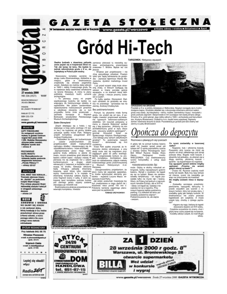 Gród Hi-Tech TARGOWEK. Nietypowy aquapark Owalna budowla z drewnianą palisadą znów pojawi się w krajobrazie Bród na. Tak Jak tysiąc lat temu. Nie będzie to jednak rekonstrukcja grodu z X w., ale największy w Polsce park wodny. Nowoczesny kompleks wyrośnie na skraju Lasku Brwinowskiego, dokładnie w miejscu, gdzie w średniowieczu znajdowały się obrzeża pogańskiej wioski. Zaledwie sio metrów dalej odkryło w 1949 r. relikty X-wiecznego grodu. Są to najstarsze ślady osadnictwa odnalezione na terenie Warszawy. A mimo to plany pobliskiej inwestycji bud/i) uznanie archeologów. - To pierwszy znany mi projekt współczesnego budynku lak bardzo nawiązujący do historycznego obiektu w sąsiedztwie. Nie jestem zwolennikiem wpasowywania nowoczesnych gmachów w zabytkowe otoczenie, ale w tym przypadku forma mnie przekonała zachwala koncepcje dr Wojciech Borkowski. wicedyrektor Państwowego Muzeum Archeologicznego. zamierza ulokować tu niewielką wystaw; archeologiczną prezentująca znaleziska 7. Bródna. Będzie też coś jeszcze. - Wnętrze jest projektowane i nie chcę wszystkiego zdradzać. Powiem tylko tyle: będą odniesienia do grodziska - zaznacza tajemniczo Wanda Morawiecka, dyrektor marketingu lnvest Parku. l już przed oczami stają kryte strzechą chaty, w których wylegują się odziani w lniane porcięta goście aquaparku. a na ścianach wiszą tabliczki: „Zbroje i miecze prosimy zostawić w szatni", -To byłby pastisz. Disneyland. Żadnych odniesień do grodziska we wnętrzu nic przewiduje - sprowadza nas na ziemię, Andrzej Chołdzyński. Bez podcinania korzeni Pomysł, by pływalnia miała formę grodu, nie urodził się od razu. Z początku inwestor proponował wzniesienie typowych betonowo-szklanych obiektów. Ich rysunek pokazany w Żaden Disneyland marcu w „Gazecie Stołecznej" spotkał Zespól składający się z hotelu i naj- się z falą sprzeciwu. „Widzimy na nim większego w kraju parku wodnego (15 tyś. architektoniczny gniot w stylu disco m kw.) na kupionej od gminy działce polo, otoczony wielkimi parkingami" pobuduje spółka lnvest Park. Wstępny grzmiał Krzysztof Kytel ze projekt kompleksu przygotował arch. Społecznego Instytutu Ekologicznego. Andrzej Chołdzyński. „Coś takiego przy samym zabytkowym - Podszedłem do tego jak budowniczowie grodzie? To podcinanie naszych z czasów przedromańskich. Za- korzeni" - denerwowali się inni projektowałem obiekt maksymalnie czytelnicy. zajmujący działkę i dopasowujący się do lnvest Park szybko zrozumiał, że hiukształtowania terenu - mówi architekt. storyczna okolica zobowiązuje, a przy Zaproponowana przez niego niere- okazji może siać się magnesem przygularna bryła, zbliżona w planie do ciągającym gości do parku wodnego. owalu, niczym prawdziwy gród składać się Spółka zorganizowała konkurs na probędzie z dwóch części - wyższej i niższej. W jekt kompleksu. Architektom dala pierwszej ma się znajdować hol z salami wzór do naśladowania; zdjęcie makiety konferencyjnymi, w drugiej obiekt bródnowskiego grodu przechowywanej rekreacyjny z basenem w kształcie rzeki z w Muzeum Historycznym m.st. wyspą na środku. Elewacje obłożone Warszawy, będą imitującą palisadę drewnianą - Zasugerowaliśmy projektantom, że boazerią, spod której tylko nieśmiało skoro mamy tak wspaniale sąsiedztwo, wyjrzy nowoczesność: a to rozpięta na to trzeba wykorzystać elementy grodrewnianej konstrukcji szklana kopuła, to dziska - wyjaśnia Lucyna Mazur, wiznów fragment ściany K szklą. Z ziemi wy- ceprezes lnvest Parku. kopanej spod kompleksu podczas budowy Jak widać, posłuchali. Inwestycja ma pod ziemnego garażu usypany zostanie być zrealizowana w ciągu dwóch lat i otaczający go niewielki wal. kosztować nieco ponad 100 min li. Średniowieczne atrakcje przewidziano też Położenie kamienia węgielnego planowewnątrz kompleksu. Inwestor wane jest na październik. TOMASZ URZYKOWSK1 Tak za dwa lala będzie wyglądał aquapark na Bródnie l GRODZISKO NA BRODNIE Powstało w X w. w pobliżu dzisiejszej ul. Malborskiej. Niegdyś rozciągały się tu trudno dostępne bagna. Grodzisko składało się z otoczonego drewniano-ziemnym wałem grodu oraz osady. Jej mieszkańcy - rolnicy, myśliwi, rzemieślnicy i kupcy - korzystali z grodu podczas zagrożeń. Stacjonowała w nim czuwająca nad osadą zbrojna załoga. W końcu XI w. gród spłonął. Jego relikty odkryli w 1949 r. archeolodzy pod kierunkiem doc. Krystyny Musianowicz. Znaleźli tu m.in. resztki bramy wjazdowej, fragmenty domów i drewniane skrzynie na zboże. Pozostałością po grodzie jest dziś owalny wal ziemny w Lasku Bródnowskim Opończa do depozytu Rozmowa o pławiących się rycerzach A gdyby tak na pomysł budowy basenu wpadł imć Inwestor sprzed ponad pół tysiąca lat? O opinię poprosiliśmy rycerza z bractwa Ordinis Penndragonis Sacri Bclli Militesf Rycerze Świętej Wojny Zakonu Pendragona) PAWEŁ WIECZOREK: Czy średniowieczny rycerz korzystałby z usług aqua parku? PODSKARBI MARCIN KOSIOREK: Być może. Gdyby w okolicy mieszkali wikingowie, byliby najczęstszymi gośćmi basenu. Słynęli z czystości, bo kąpali się raz na tydzień. Basen nie zainteresowałby templariuszy - ich reguła pozwalała tylko na mycie rąk i twarzy. Wiem, że Polacy byli jednym z najczystszych narodów Europy, ale w XVII w. - wtedy i oni kąpali się rzadziej (i nie częściej) niż raz w tygodniu. Przy nowym basenie będzie podziemny parking. C/y kilkaset lat temu powstałaby podziemna stajnia? Podziemna pewnie nie, ale stajnia - owszem. Co rycerz zostawiałby w basenowej szafce? - Nogawice, buły i płócienną koszulę. Powszedni strój rycerza nie różnił się zbytnio od stroju zakładanego pod zbroję podczas bitwy. Bogatsi nosili koszule z aksamitu lub jedwabiu. Ja ubieram się w długą opończę, płócienną koszule i spodnie - są wygodniejsze niż nogawice. Czy aguapark sprzed wieków mógłby apelowa