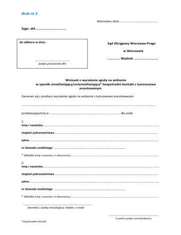 druk nr 2 Warszawa, dnia…………………………………………… Sygn. akt ……………………………. do odbioru w dniu: Sąd Okręgowy Warszawa-Praga w Warszawie …………………………….……….. ………….. Wydział ………………………. podpis pracownika BIS Wniosek o wyrażenie zgody na widzenie w sposób umożliwiający/uniemożliwiający* bezpośredni kontakt z tymczasowo aresztowanym Zwracam się z prośbą o wyrażenie zgody na widzenie z tymczasowo aresztowanym ………………………………………….…………………………………………………………………............................................. przebywającym/ą w ………………………………................................................... dla osób: 1. imię i nazwisko……………………………………………………………………………………………………………………………………. stopień pokrewieństwa …………………………………………………………………………………………………………............. adres…………………………………………………………………………………………………………………………………………………… nr dowodu osobistego ………………………………………………………………………………… * dziecko (imię i nazwisko, nr dokumentu)…………………………………………………………………………………………………………………………… 2. imię i nazwisko……………………………………………………………………………………………………………………………………. stopień pokrewieństwa …………………………………………………………………………………………………………............. adres…………………………………………………………………………………………………………………………………………………… nr dowodu osobistego ………………………………………………………………………………… * dziecko (imię i nazwisko, nr dokumentu)…………………………………………………………………………………………………………………………… ……………………………………………………………………………… (kontakt z osobą wnioskującą: telefon, e-mail) ………………………………………………………. (czytelny podpis wnioskodawcy) *niepotrzebne skreślić