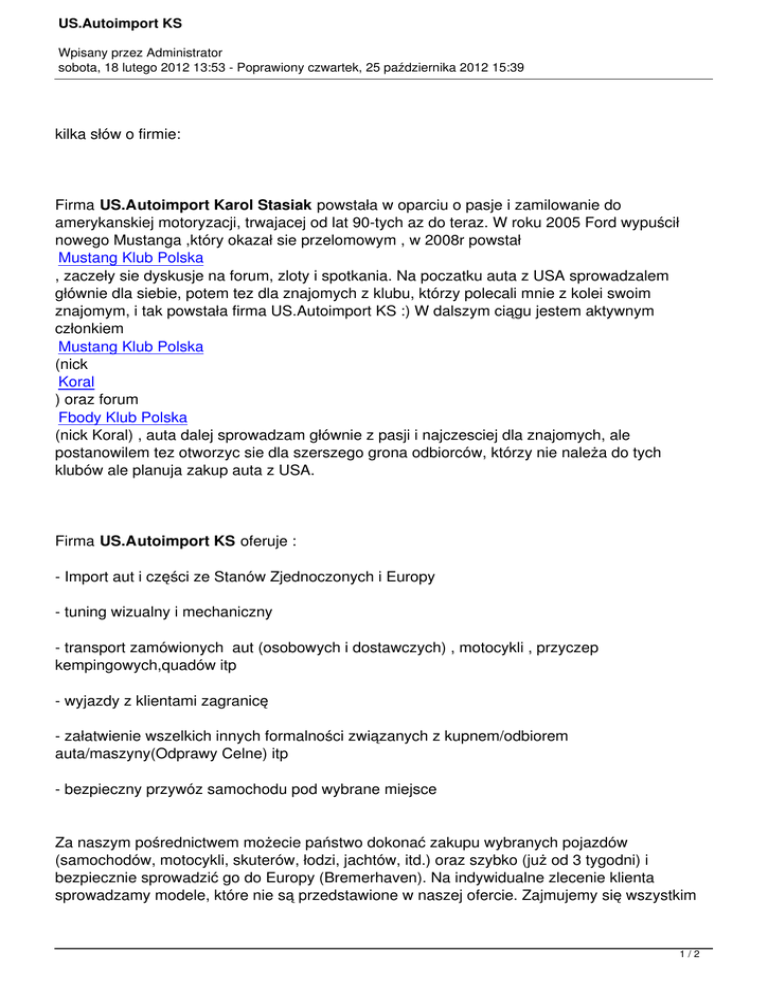 US.Autoimport KS Wpisany przez Administrator sobota, 18 lutego 2012 13:53 - Poprawiony czwartek, 25 października 2012 15:39 kilka słów o firmie: Firma US.Autoimport Karol Stasiak powstała w oparciu o pasje i zamilowanie do amerykanskiej motoryzacji, trwajacej od lat 90-tych az do teraz. W roku 2005 Ford wypuścił nowego Mustanga ,który okazał sie przelomowym , w 2008r powstał Mustang Klub Polska , zaczeły sie dyskusje na forum, zloty i spotkania. Na poczatku auta z USA sprowadzalem głównie dla siebie, potem tez dla znajomych z klubu, którzy polecali mnie z kolei swoim znajomym, i tak powstała firma US.Autoimport KS :) W dalszym ciągu jestem aktywnym członkiem Mustang Klub Polska (nick Koral ) oraz forum Fbody Klub Polska (nick Koral) , auta dalej sprowadzam głównie z pasji i najczesciej dla znajomych, ale postanowilem tez otworzyc sie dla szerszego grona odbiorców, którzy nie należa do tych klubów ale planuja zakup auta z USA. Firma US.Autoimport KS oferuje : - Import aut i części ze Stanów Zjednoczonych i Europy - tuning wizualny i mechaniczny - transport zamówionych aut (osobowych i dostawczych) , motocykli , przyczep kempingowych,quadów itp - wyjazdy z klientami zagranicę - załatwienie wszelkich innych formalności związanych z kupnem/odbiorem auta/maszyny(Odprawy Celne) itp - bezpieczny przywóz samochodu pod wybrane miejsce Za naszym pośrednictwem możecie państwo dokonać zakupu wybranych pojazdów (samochodów, motocykli, skuterów, łodzi, jachtów, itd.) oraz szybko (już od 3 tygodni) i bezpiecznie sprowadzić go do Europy (Bremerhaven). Na indywidualne zlecenie klienta sprowadzamy modele, które nie są przedstawione w naszej ofercie. Zajmujemy się wszystkim 1/2 US.Autoimport KS Wpisany przez Administrator sobota, 18 lutego 2012 13:53 - Poprawiony czwartek, 25 października 2012 15:39 od "A do Z". Jesteśmy z państwem w urzędzie celnym!! Oferujemy pomoc w załatwieniu transportu, naprawie, zakupie części z USA!! Jesteśmy doświadczoną, dynamicznie rozwijającą się firmą, otwartą na wszelkie zapotrzebowania naszych klientów. Doświadczenie, którego nabraliśmy na rynku amerykańskim pozwala zapewnić naszym wszystkim klientom fachową obsługę i pełny profesjonalizm. wystawiamy faktury VAT . Nasza prowizja juz od 3500 PLN netto . Jesteśmy dilerem najwiekszych domów aukcyjnych w USA, kupując u nas nie dopłacaja państwo do ceny auta podatku naliczanego dla osób fizycznych, który jest czesto wyższy od naszej marży. Jako firma zarejestrowana w USA nie mamy ograniczen i mozemy kupowac auta w kazdym stanie w USA oraz Kanadzie. tel. +48 792 33 55 65 2/2