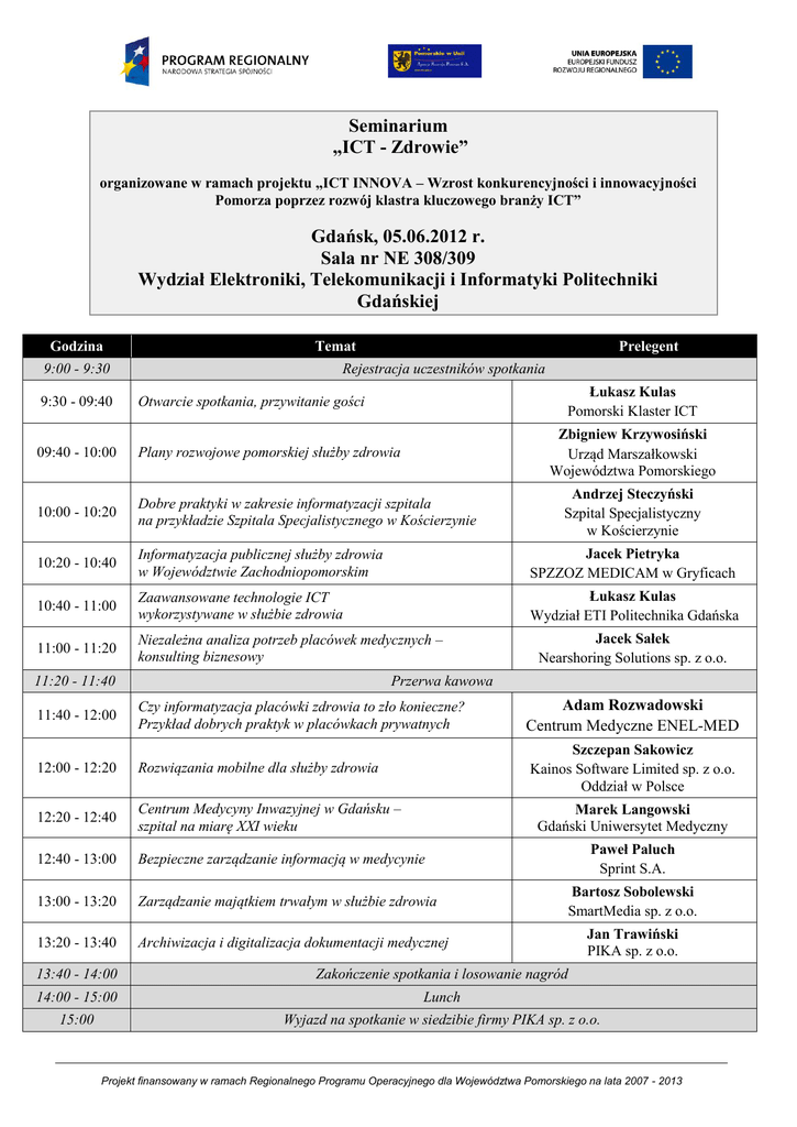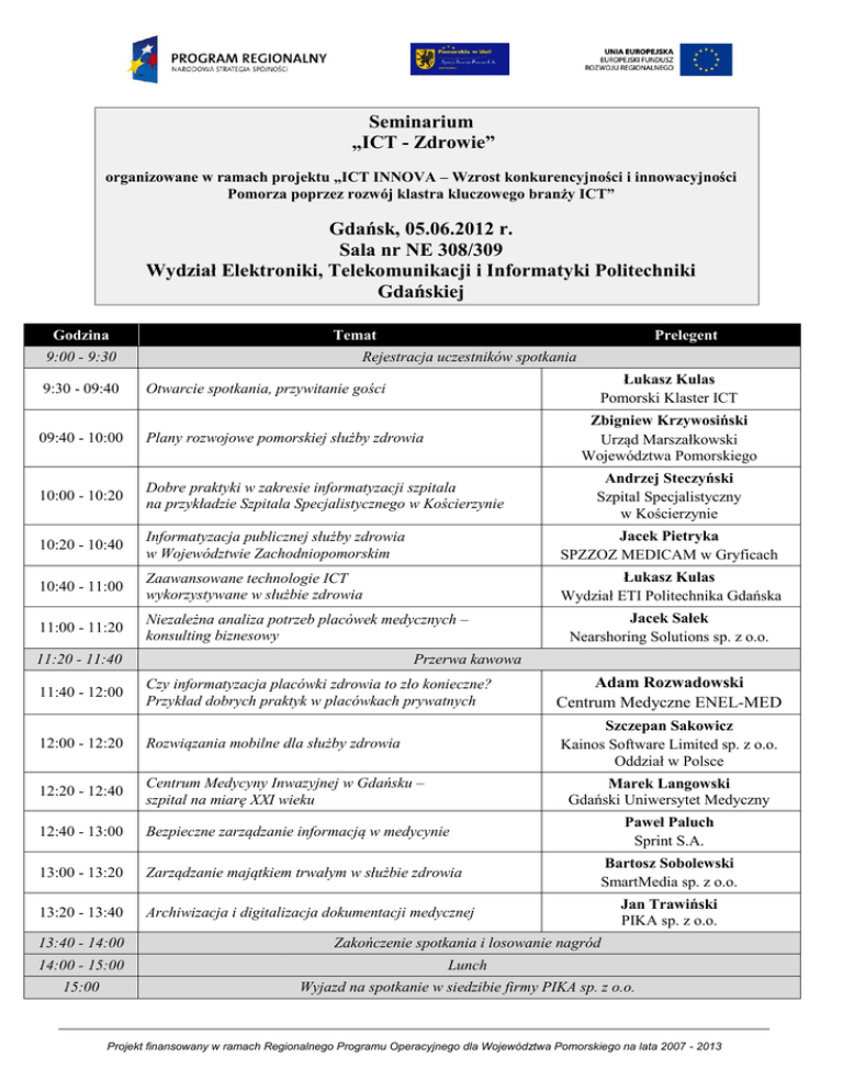 Seminarium „ICT - Zdrowie” organizowane w ramach projektu „ICT INNOVA – Wzrost konkurencyjności i innowacyjności Pomorza poprzez rozwój klastra kluczowego branży ICT” Gdańsk, 05.06.2012 r. Sala nr NE 308/309 Wydział Elektroniki, Telekomunikacji i Informatyki Politechniki Gdańskiej Godzina 9:00 - 9:30 Temat Prelegent Rejestracja uczestników spotkania Łukasz Kulas Pomorski Klaster ICT 9:30 - 09:40 Otwarcie spotkania, przywitanie gości 09:40 - 10:00 Plany rozwojowe pomorskiej służby zdrowia 10:00 - 10:20 Dobre praktyki w zakresie informatyzacji szpitala na przykładzie Szpitala Specjalistycznego w Kościerzynie 10:20 - 10:40 Informatyzacja publicznej służby zdrowia w Województwie Zachodniopomorskim Jacek Pietryka SPZZOZ MEDICAM w Gryficach 10:40 - 11:00 Zaawansowane technologie ICT wykorzystywane w służbie zdrowia Łukasz Kulas Wydział ETI Politechnika Gdańska 11:00 - 11:20 Niezależna analiza potrzeb placówek medycznych – konsulting biznesowy 11:20 - 11:40 Zbigniew Krzywosiński Urząd Marszałkowski Województwa Pomorskiego Andrzej Steczyński Szpital Specjalistyczny w Kościerzynie Jacek Sałek Nearshoring Solutions sp. z o.o. Przerwa kawowa Czy informatyzacja placówki zdrowia to zło konieczne? Przykład dobrych praktyk w placówkach prywatnych Adam Rozwadowski Centrum Medyczne ENEL-MED 12:00 - 12:20 Rozwiązania mobilne dla służby zdrowia Szczepan Sakowicz Kainos Software Limited sp. z o.o. Oddział w Polsce 12:20 - 12:40 Centrum Medycyny Inwazyjnej w Gdańsku – szpital na miarę XXI wieku 12:40 - 13:00 Bezpieczne zarządzanie informacją w medycynie 13:00 - 13:20 Zarządzanie majątkiem trwałym w służbie zdrowia 13:20 - 13:40 Archiwizacja i digitalizacja dokumentacji medycznej 11:40 - 12:00 Marek Langowski Gdański Uniwersytet Medyczny Paweł Paluch Sprint S.A. Bartosz Sobolewski SmartMedia sp. z o.o. Jan Trawiński PIKA sp. z o.o. 13:40 - 14:00 Zakończenie spotkania i losowanie nagród 14:00 - 15:00 Lunch 15:00 Wyjazd na spotkanie w siedzibie firmy PIKA sp. z o.o. Projekt finansowany w ramach Regionalnego Programu Operacyjnego dla Województwa Pomorskiego na lata 2007 - 2013