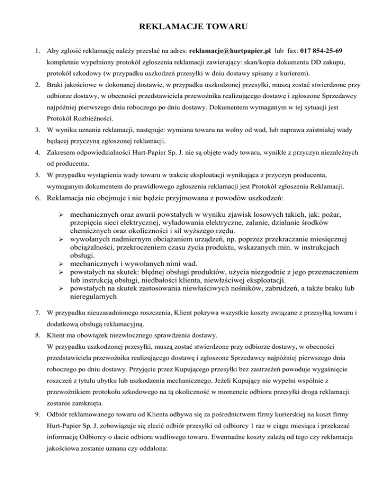 reklamacje towaru - Hurt-papier Ryszard Cebula Sp. J.
