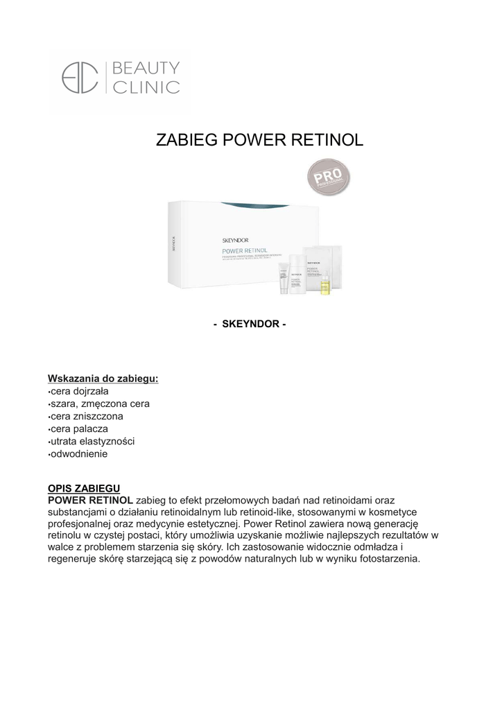 ZABIEG POWER RETINOL - SKEYNDOR - Wskazania do zabiegu: •cera dojrzała •szara, zmęczona cera •cera zniszczona •cera palacza •utrata elastyzności •odwodnienie OPIS ZABIEGU POWER RETINOL zabieg to efekt przełomowych badań nad retinoidami oraz substancjami o działaniu retinoidalnym lub retinoid-like, stosowanymi w kosmetyce profesjonalnej oraz medycynie estetycznej. Power Retinol zawiera nową generację retinolu w czystej postaci, który umożliwia uzyskanie możliwie najlepszych rezultatów w walce z problemem starzenia się skóry. Ich zastosowanie widocznie odmładza i regeneruje skórę starzejącą się z powodów naturalnych lub w wyniku fotostarzenia.
